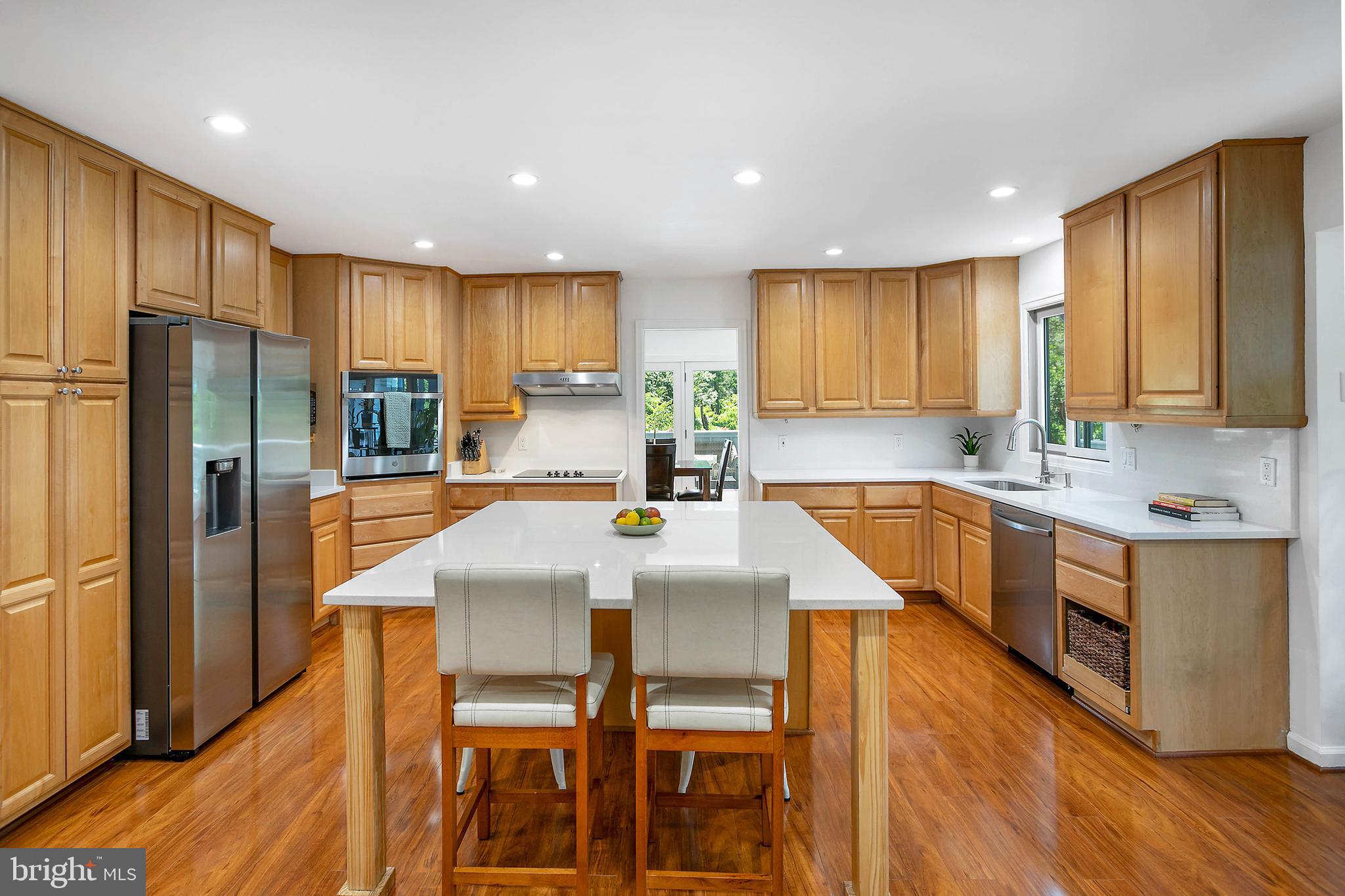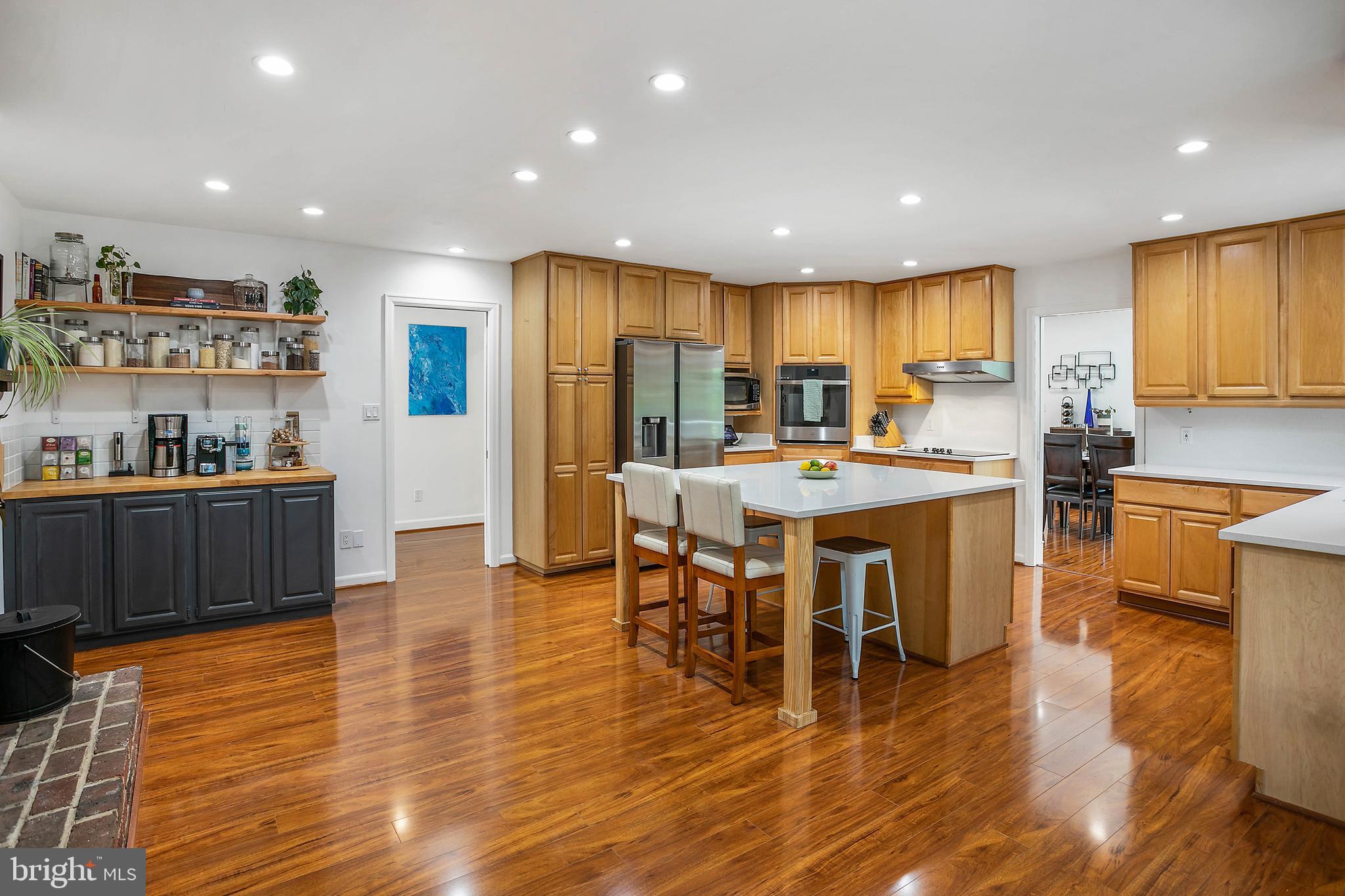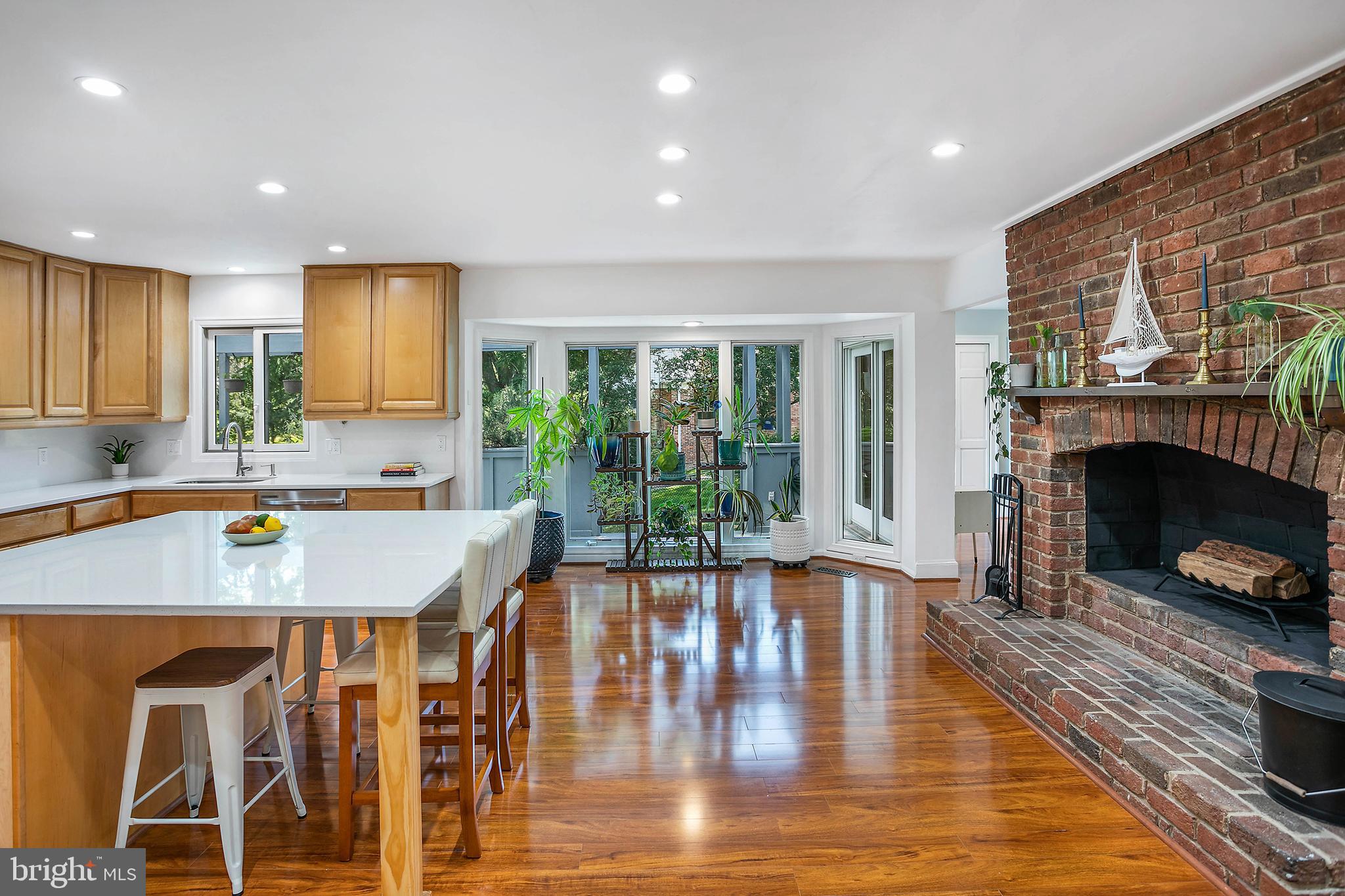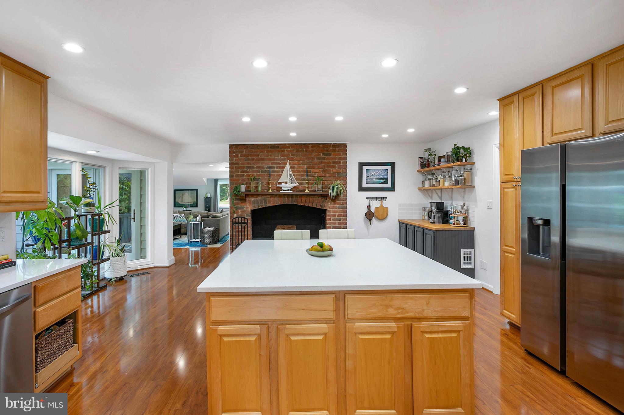 The brand new primary suite features a luxurious en suite bathroom and huge walk-in closet. The kitchen was upgraded in 2024 and features new appliances, enormous new quartz counter tops and back splash including an expansive island that can seat up to six, separate coffee bar, and cozy wood burning fireplace.