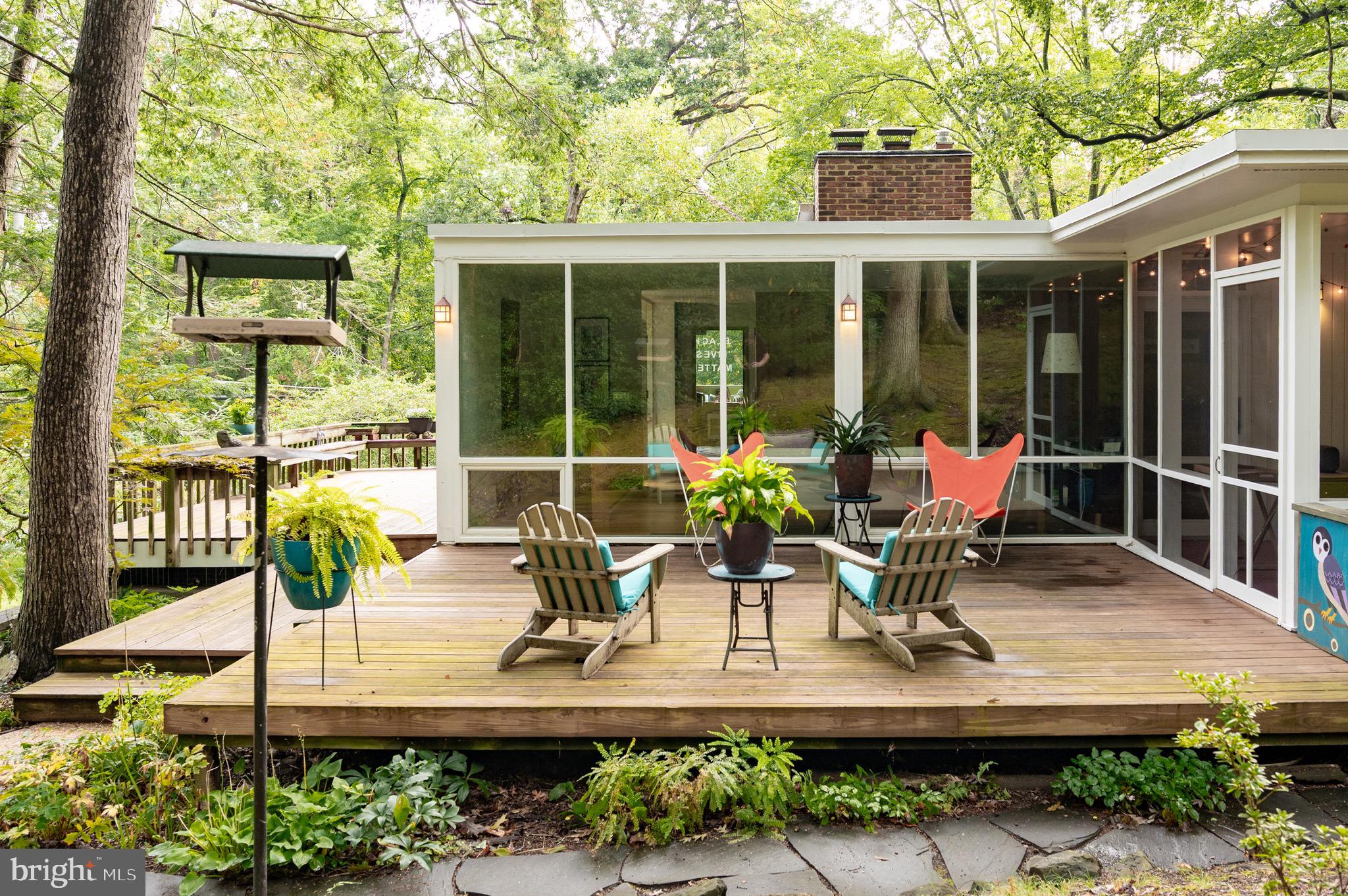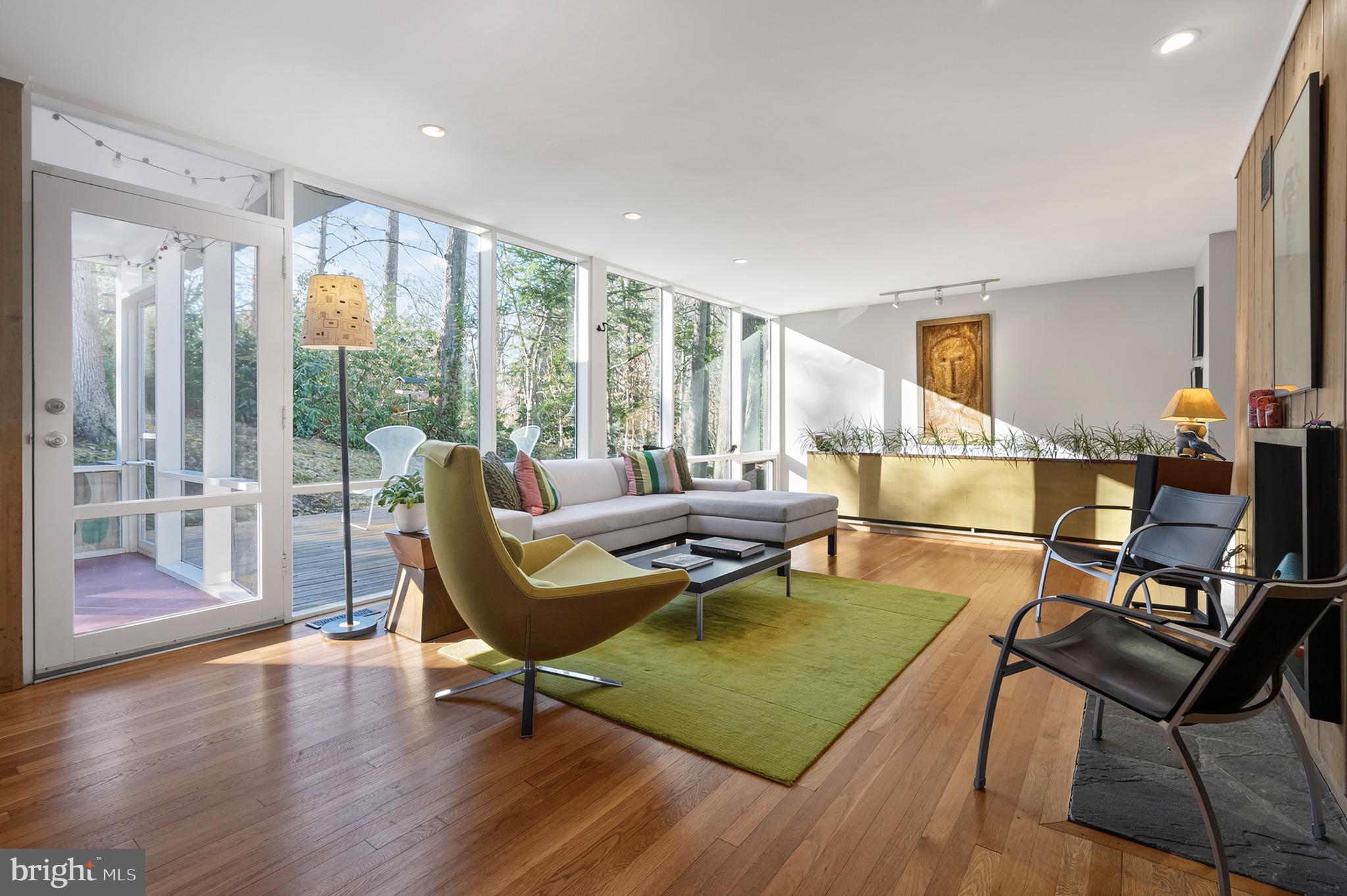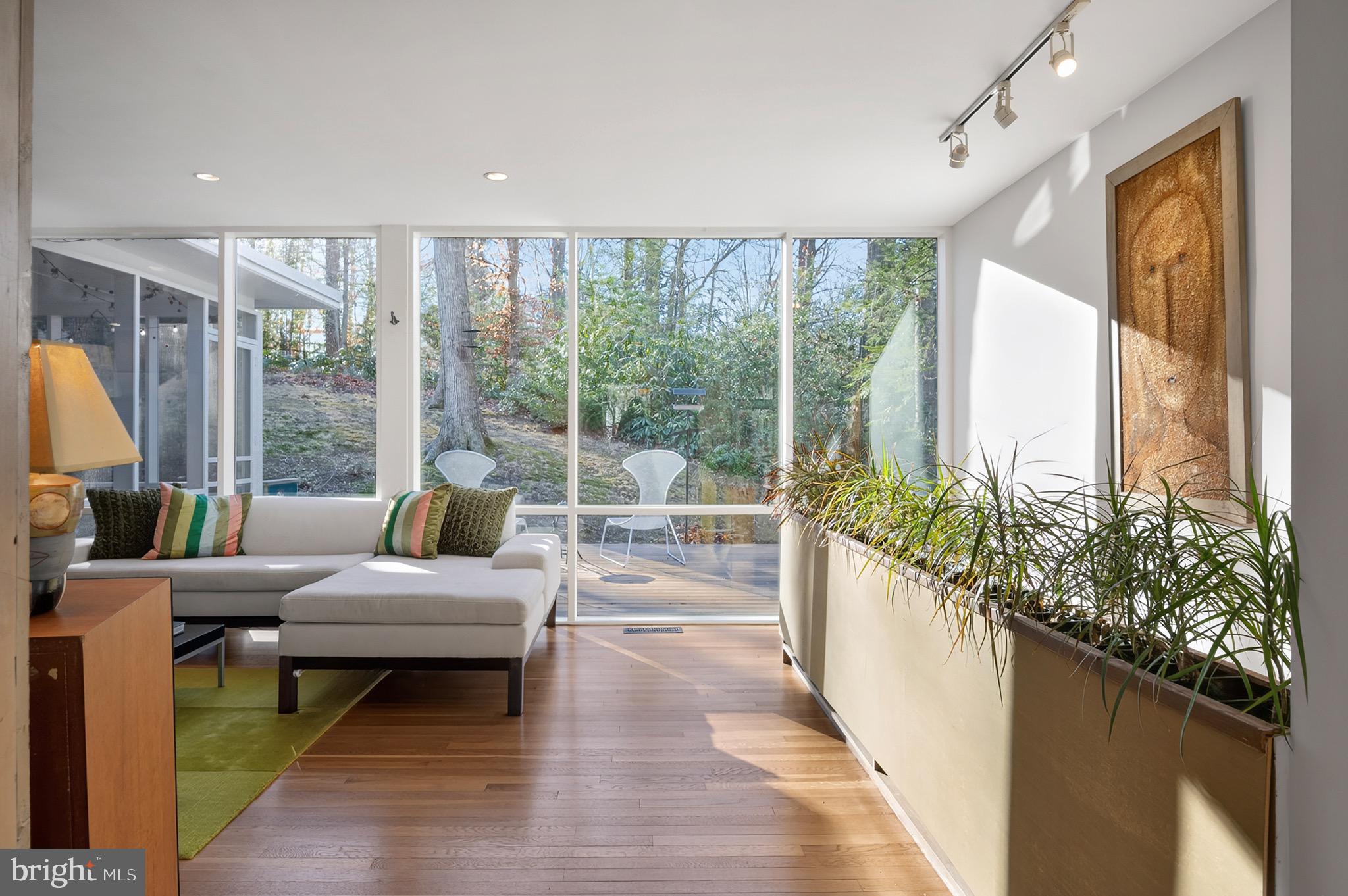 Multiple outdoor living spaces including a large screened-in porch with ceiling fan, expansive rear deck, and two side decks. The walls of double pane glass incorporate the outdoor spaces, yet the placement of the house and thoughtful landscaping make nearby houses disappear.