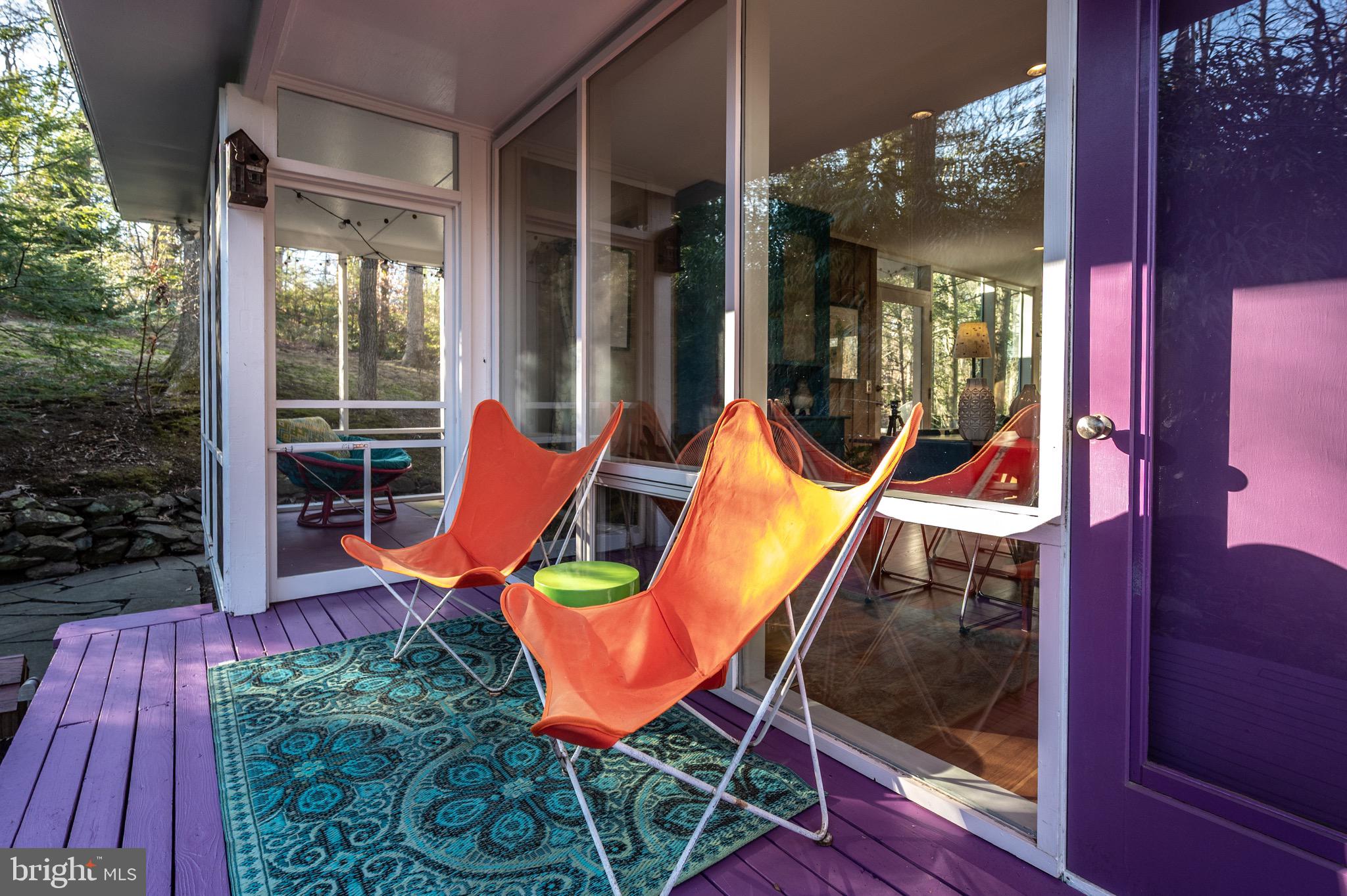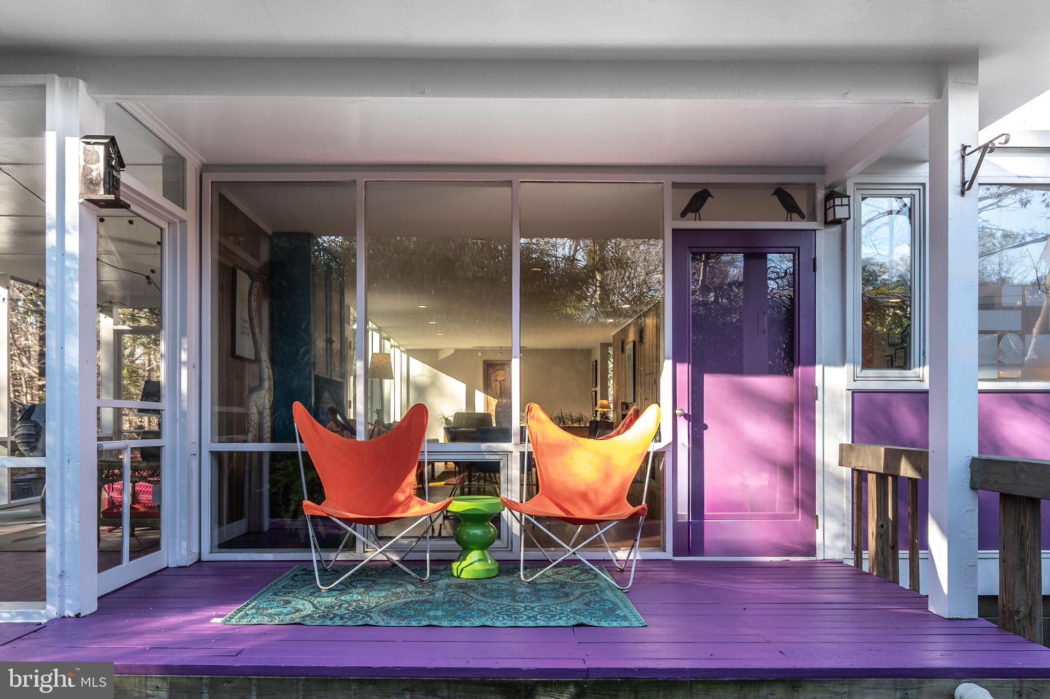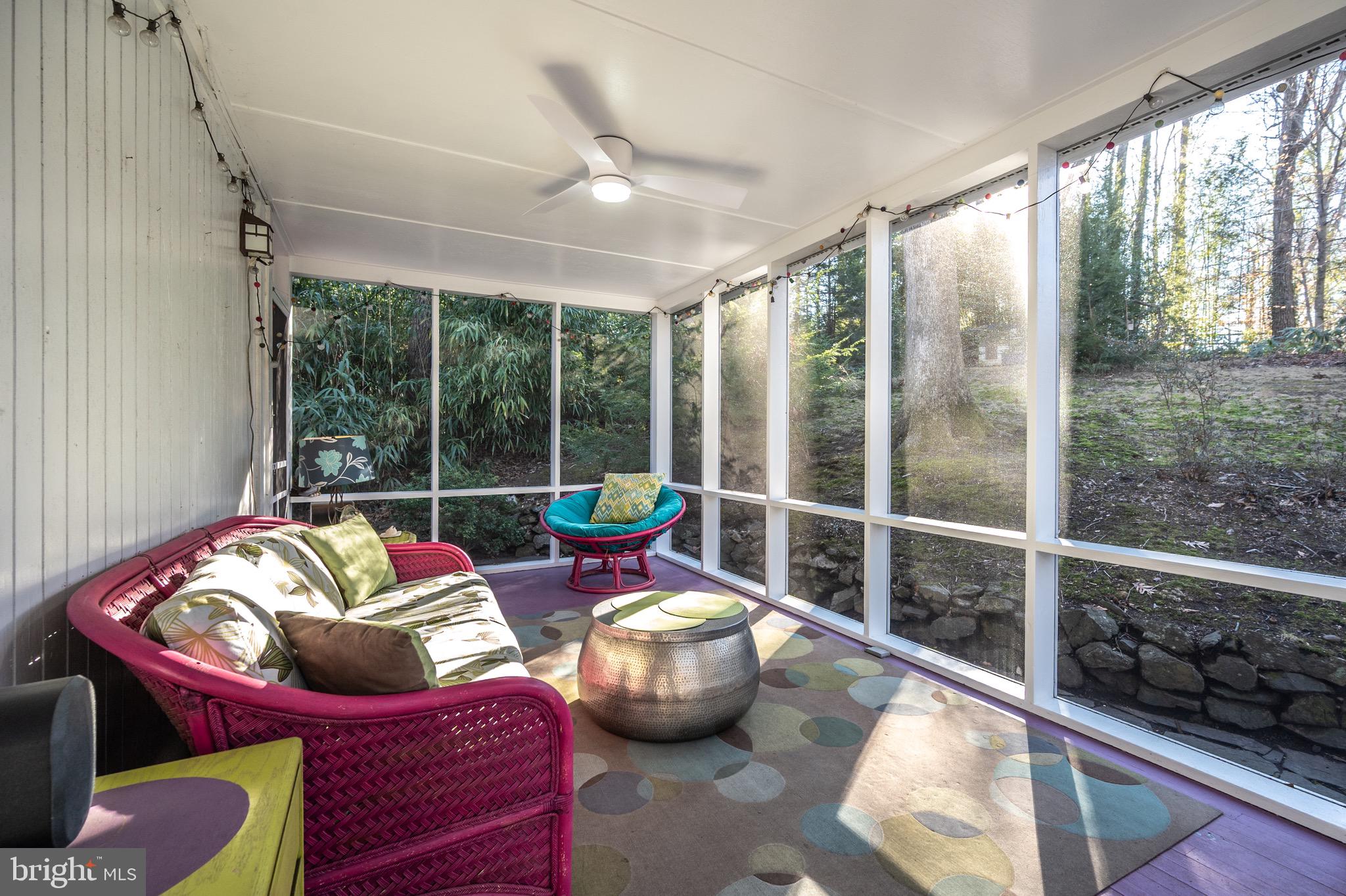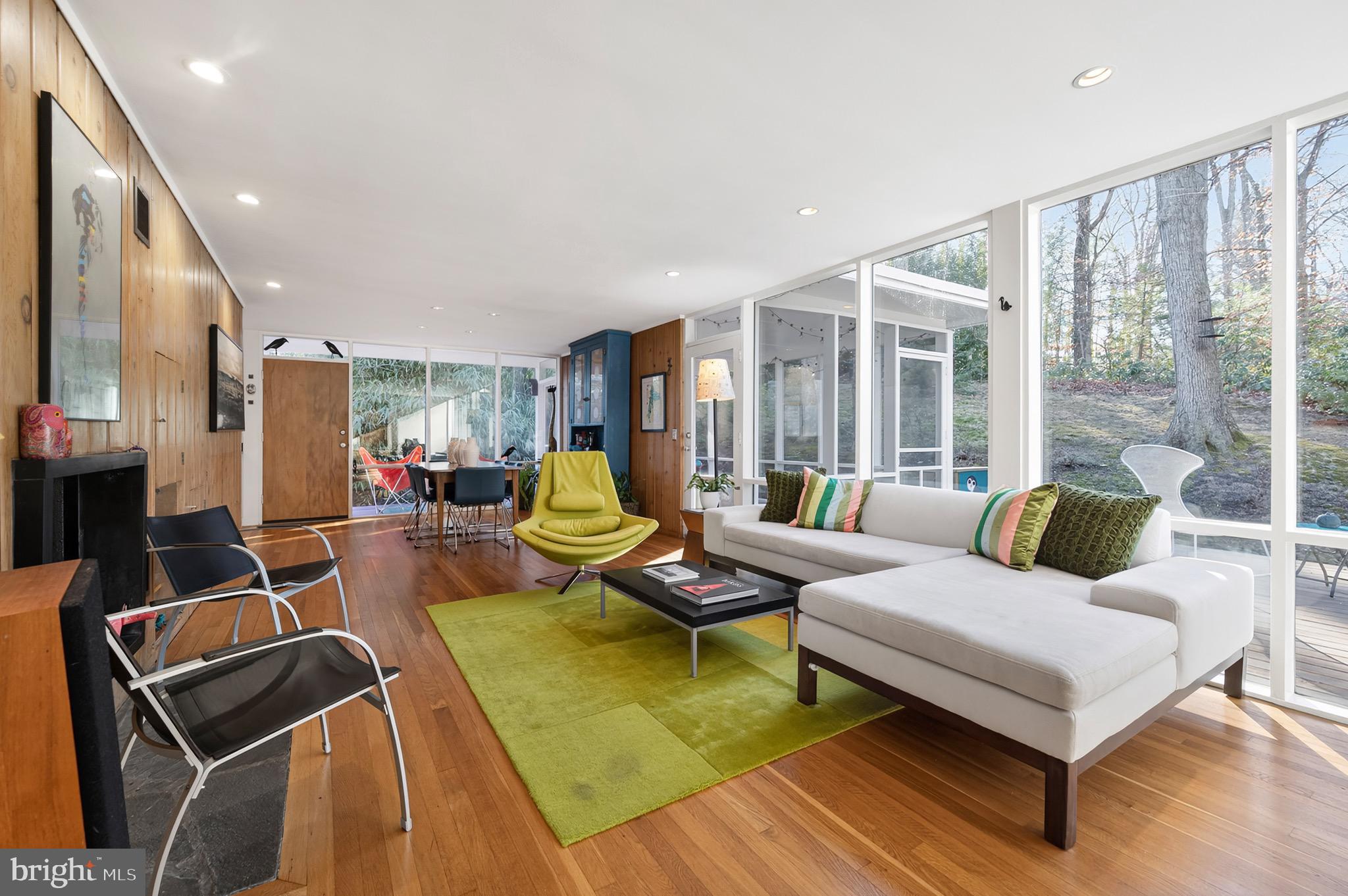 Multiple outdoor living spaces including a large screened-in porch with ceiling fan, expansive rear deck, and two side decks. The walls of double pane glass incorporate the outdoor spaces, yet the placement of the house and thoughtful landscaping make nearby houses disappear.