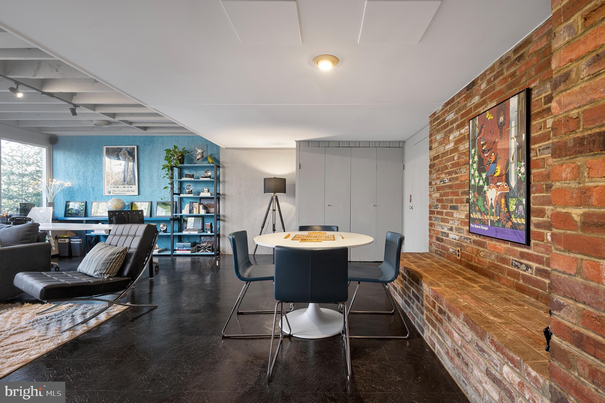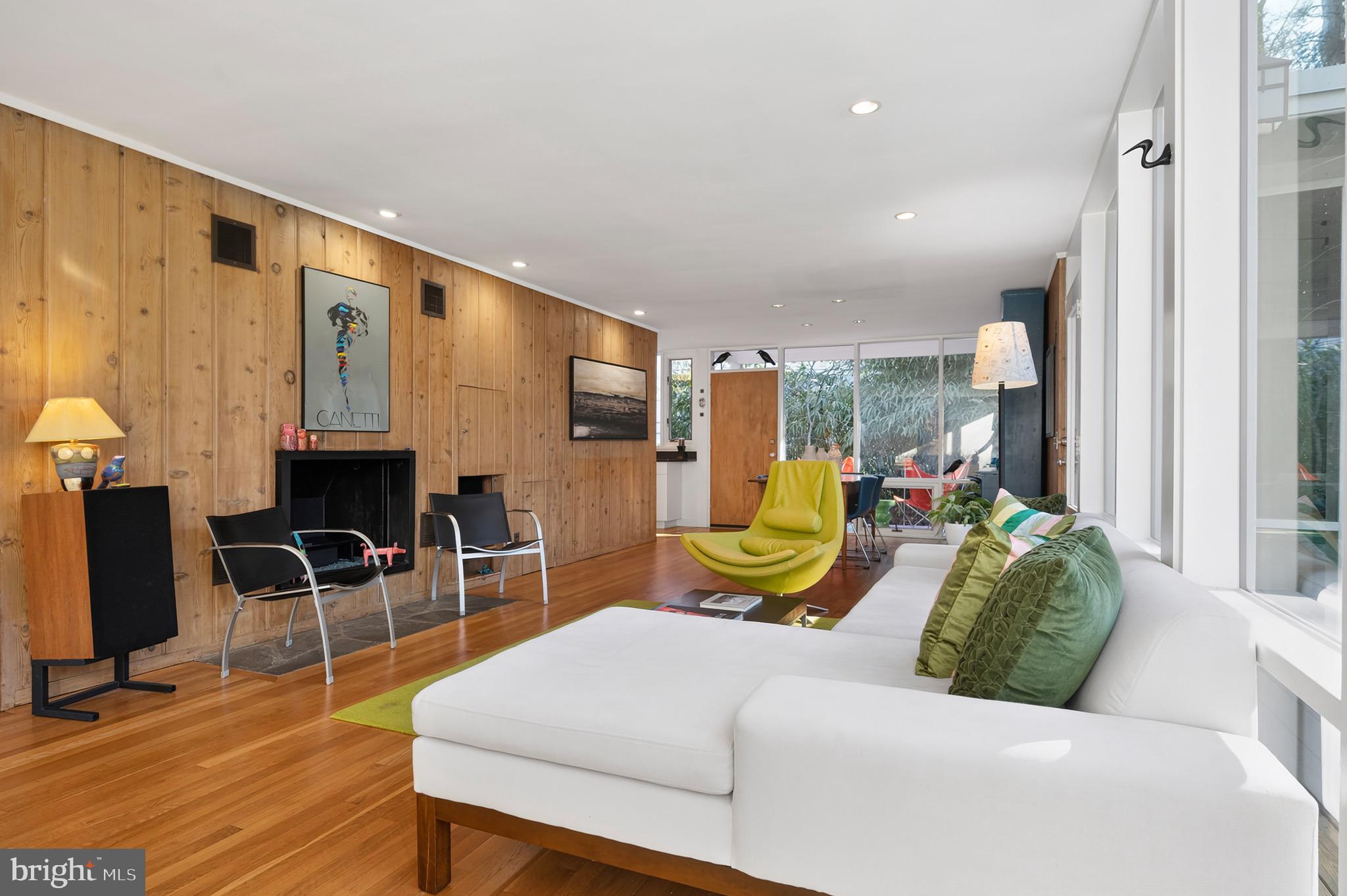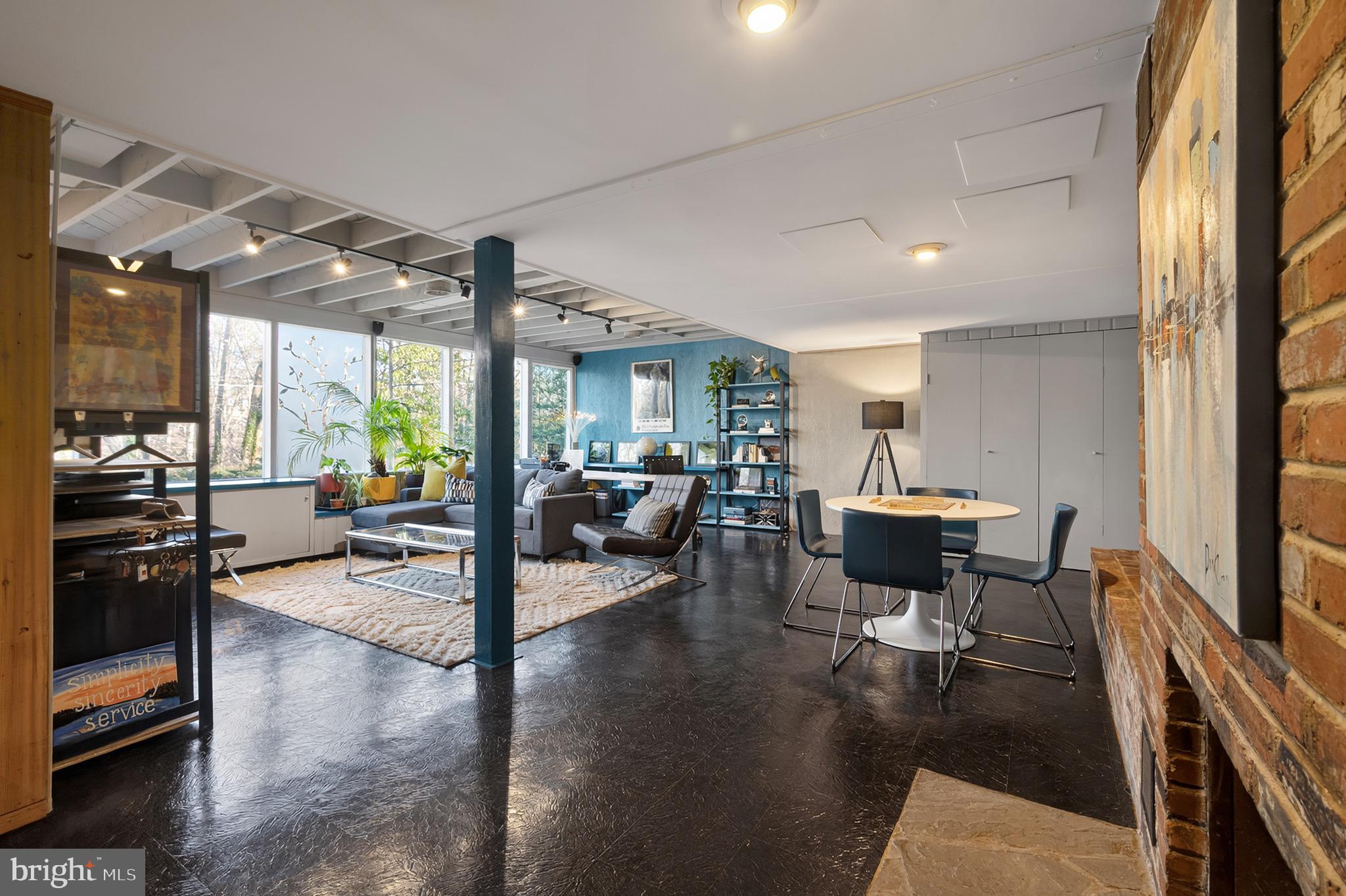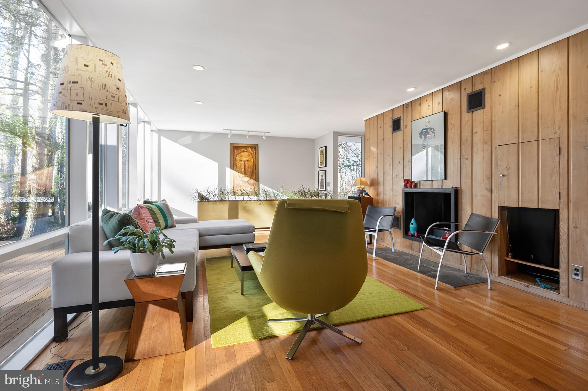 The upper level features an open living and dining area with hardwood floors, a wood-burning fireplace and an updated kitchen with recently refaced Mid-Century style cabinets and a breakfast bar overlooking greenspace. This level also includes the expanded primary suite with a cleverly disguised open dressing room and three custom closets, plus a second large bedroom and full bath with soaring ceilings and transom windows that fill the space with light. The lower level offers a spacious recreation room with a second wood-burning fireplace, an additional bedroom and full bath, and a large utility room with extensive built-in storage. Recent updates include a new HVAC system (2024) and new asphalt driveway (2024).