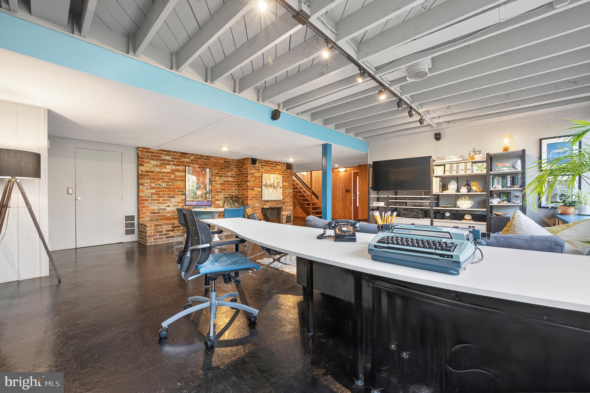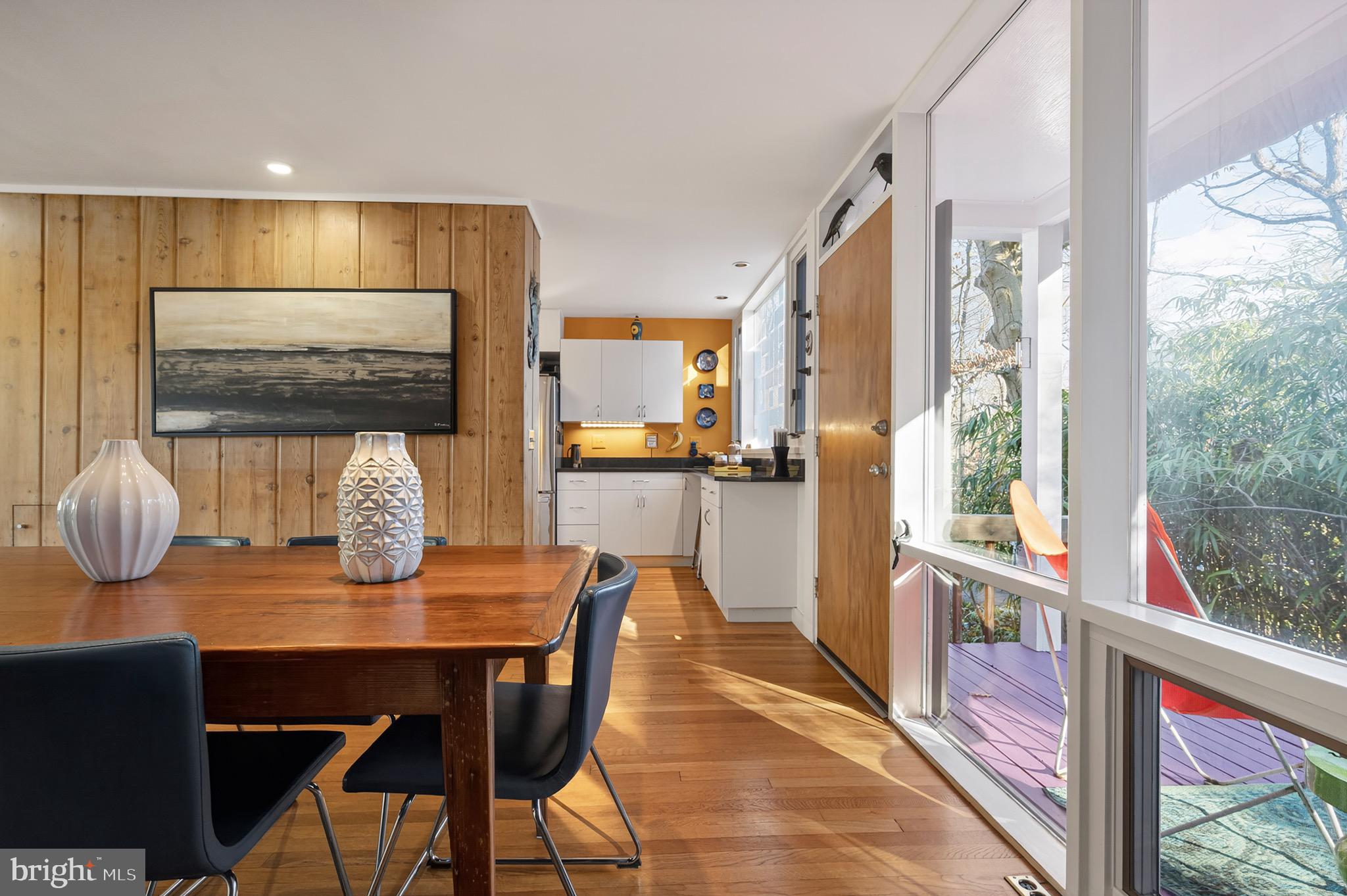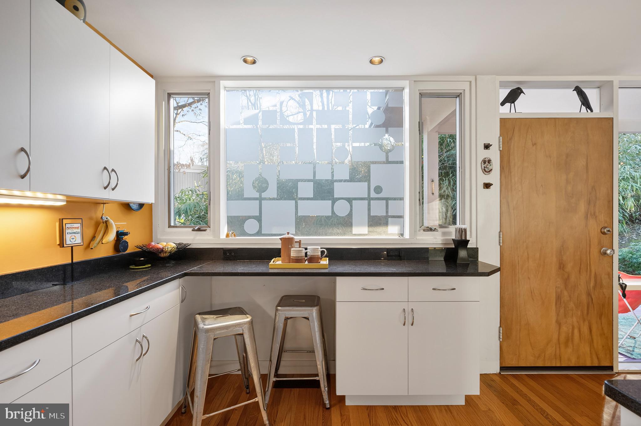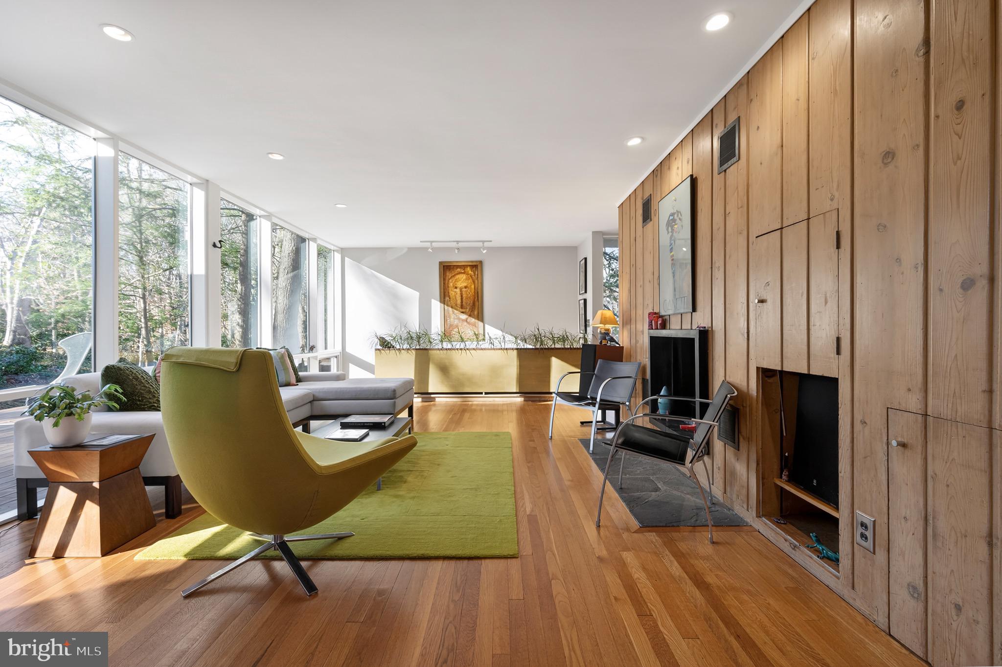 The upper level features an open living and dining area with hardwood floors, a wood-burning fireplace and an updated kitchen with recently refaced Mid-Century style cabinets and a breakfast bar overlooking greenspace. This level also includes the expanded primary suite with a cleverly disguised open dressing room and three custom closets, plus a second large bedroom and full bath with soaring ceilings and transom windows that fill the space with light. The lower level offers a spacious recreation room with a second wood-burning fireplace, an additional bedroom and full bath, and a large utility room with extensive built-in storage. Recent updates include a new HVAC system (2024) and new asphalt driveway (2024).