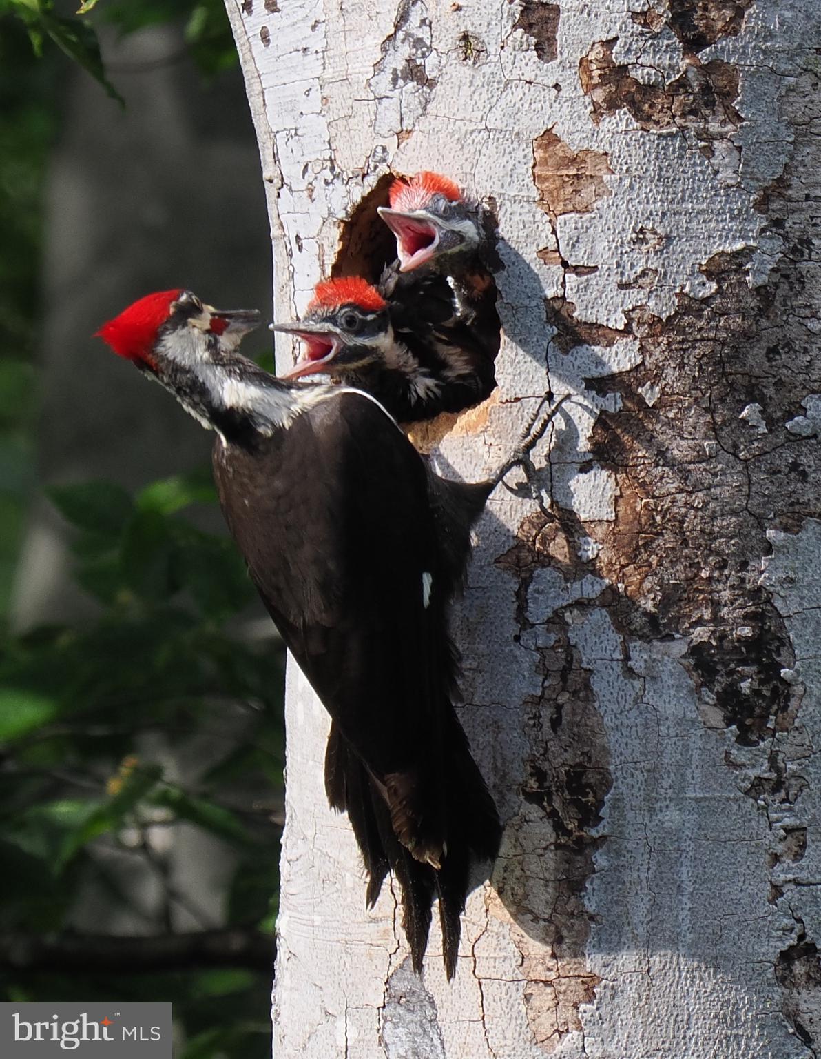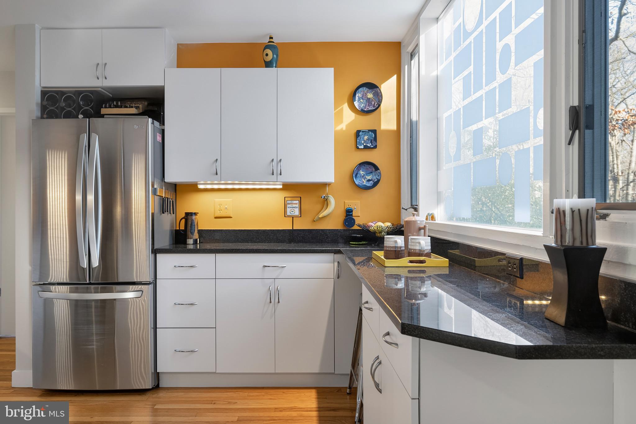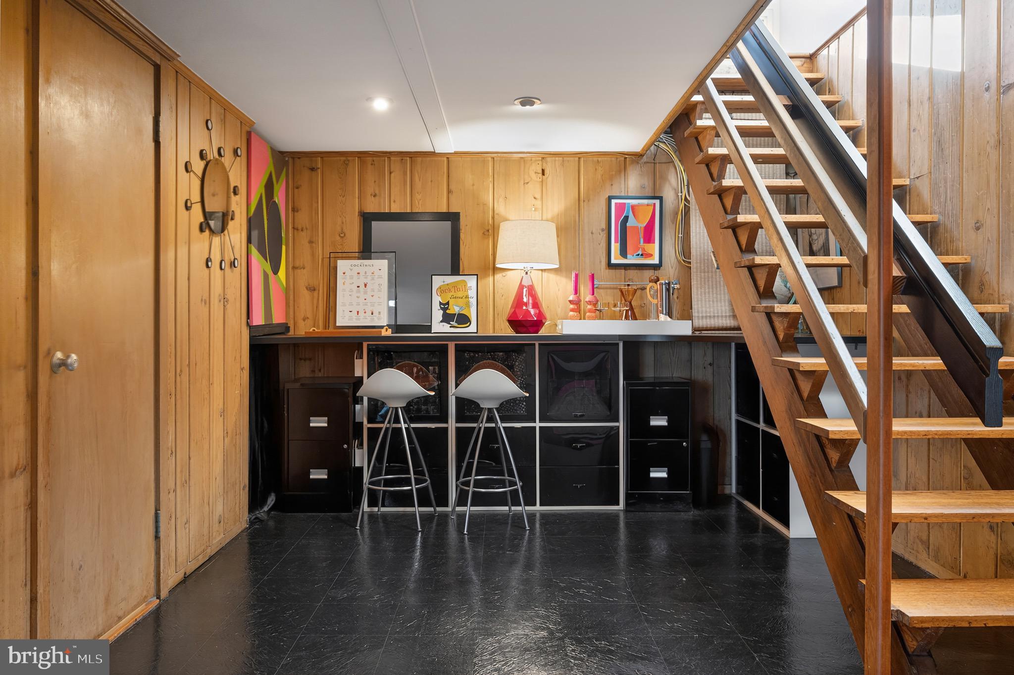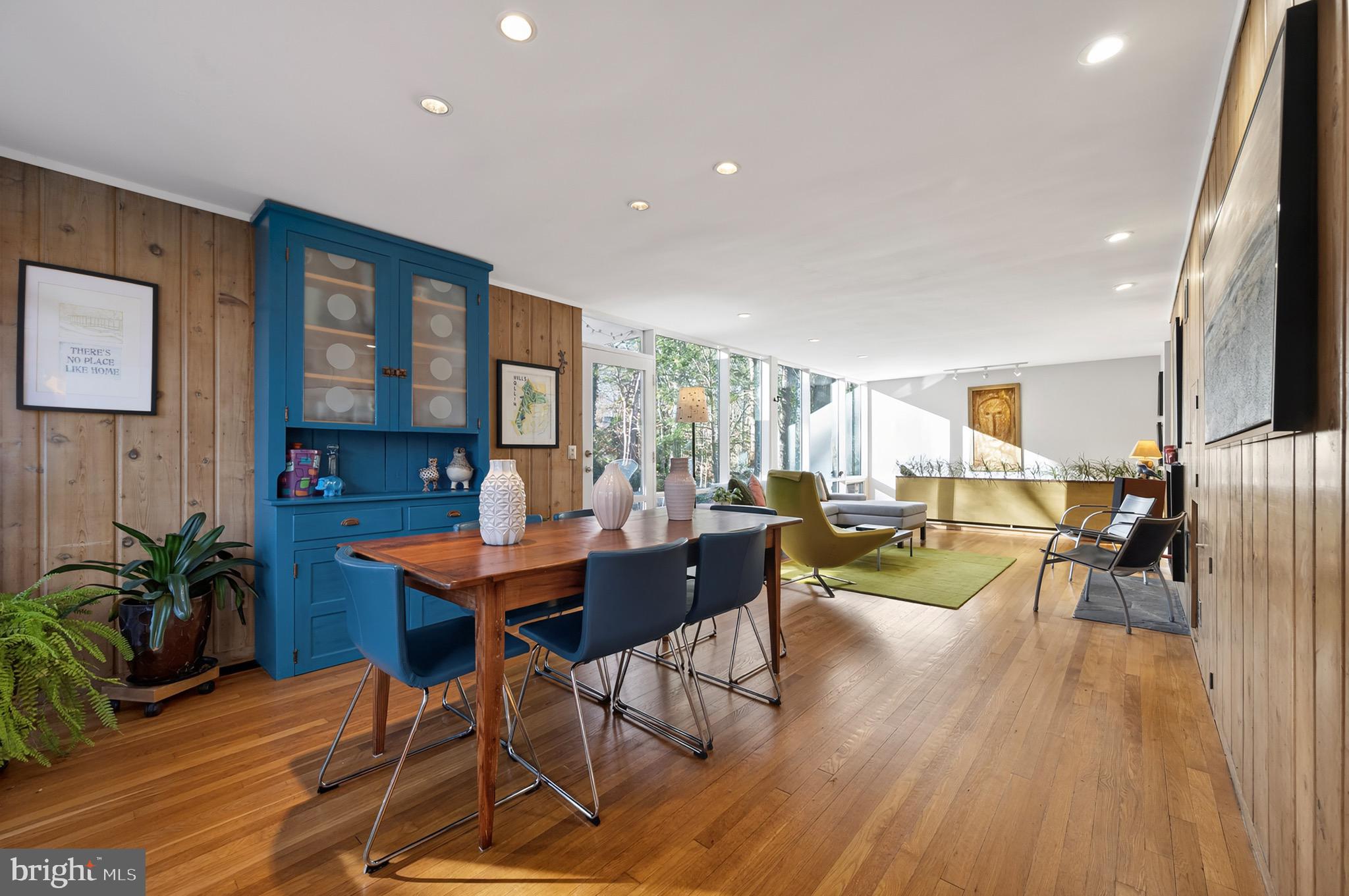 The upper level features an open living and dining area with hardwood floors, a wood-burning fireplace and an updated kitchen with recently refaced Mid-Century style cabinets and a breakfast bar overlooking greenspace. This level also includes the expanded primary suite with a cleverly disguised open dressing room and three custom closets, plus a second large bedroom and full bath with soaring ceilings and transom windows that fill the space with light. The lower level offers a spacious recreation room with a second wood-burning fireplace, an additional bedroom and full bath, and a large utility room with extensive built-in storage. Recent updates include a new HVAC system (2024) and new asphalt driveway (2024).