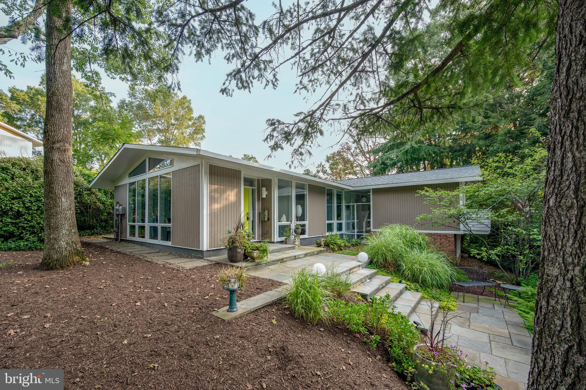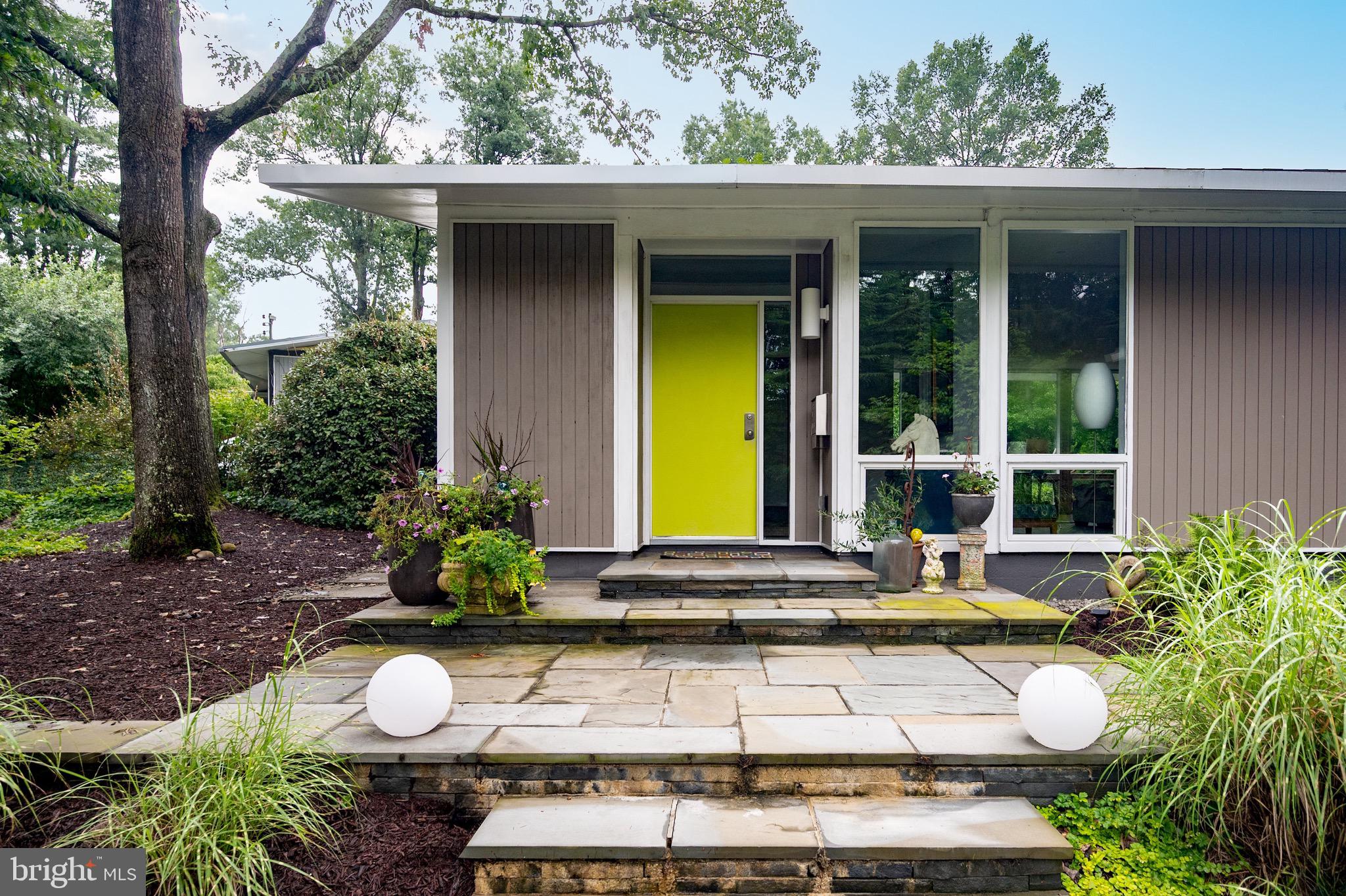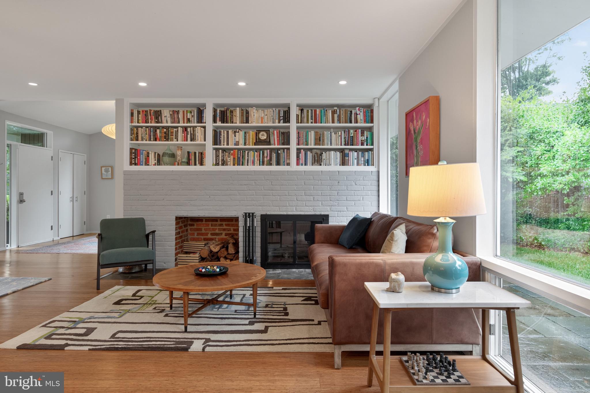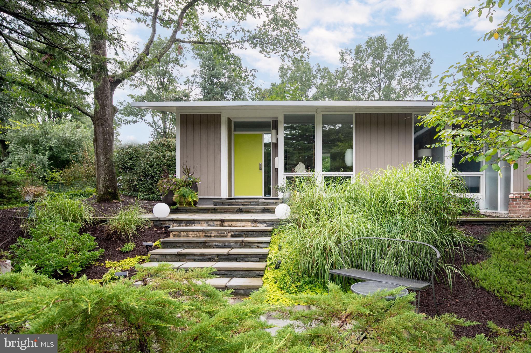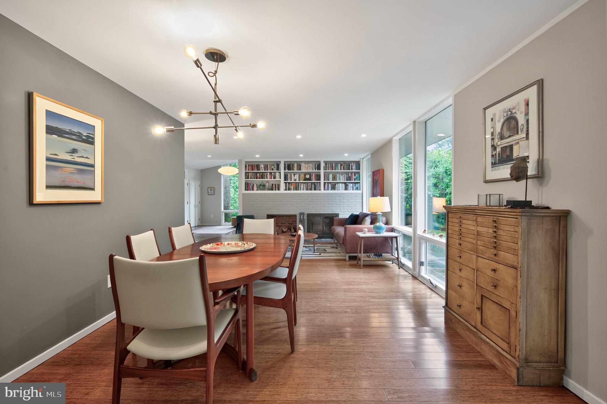 This extraordinary Mid-Century Modern home designed by Architect Charles Goodman is located in the highly sought-after Hollin Hills community. Home has been thoughtfully expanded to over 2,300 square feet with additions by renowned architects Casper Neer and Eason Cross. Extensively remodeled while preserving its iconic MCM charm, the home welcomes you with an impressive entry foyer featuring soaring ceilings, a coat closet, and a striking bubble chandelier. A private home office boasts a brick wall with built-in shelving, ideal for work or study. The open-concept living spaces include a welcoming living room and cozy family room with a wood-burning fireplace and custom built-in bookshelves, as well as a separate dining room perfect for entertaining. The custom kitchen features a large center island with seating, granite countertops, stainless steel appliances, and direct access to the patio, making it a true centerpiece of the home.