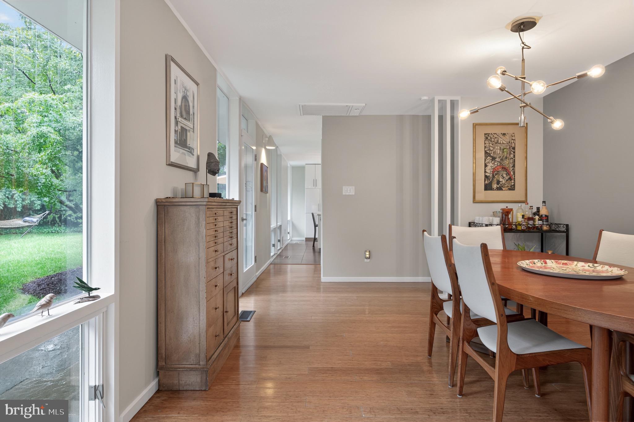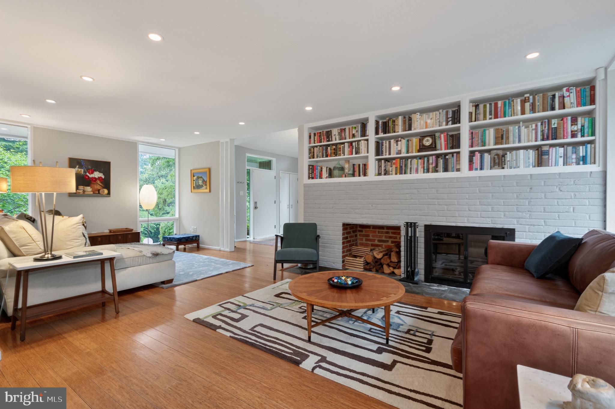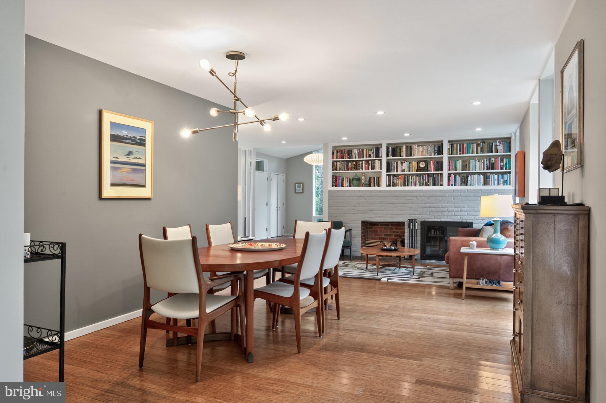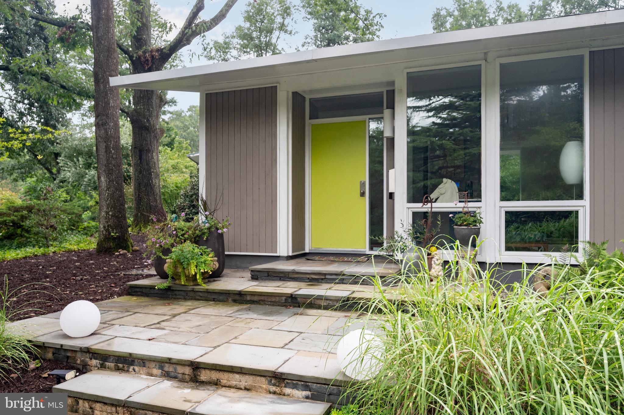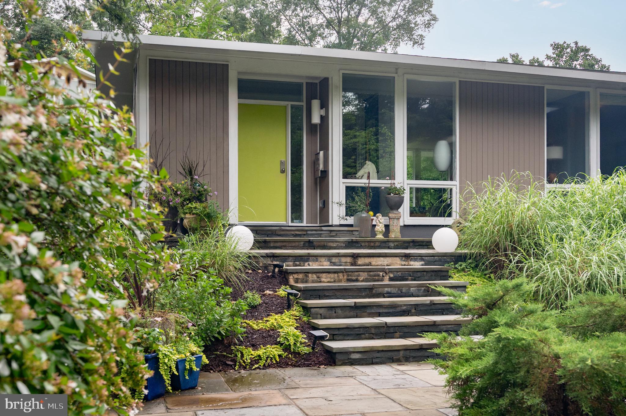 This extraordinary Mid-Century Modern home designed by Architect Charles Goodman is located in the highly sought-after Hollin Hills community. Home has been thoughtfully expanded to over 2,300 square feet with additions by renowned architects Casper Neer and Eason Cross. Extensively remodeled while preserving its iconic MCM charm, the home welcomes you with an impressive entry foyer featuring soaring ceilings, a coat closet, and a striking bubble chandelier. A private home office boasts a brick wall with built-in shelving, ideal for work or study. The open-concept living spaces include a welcoming living room and cozy family room with a wood-burning fireplace and custom built-in bookshelves, as well as a separate dining room perfect for entertaining. The custom kitchen features a large center island with seating, granite countertops, stainless steel appliances, and direct access to the patio, making it a true centerpiece of the home.
