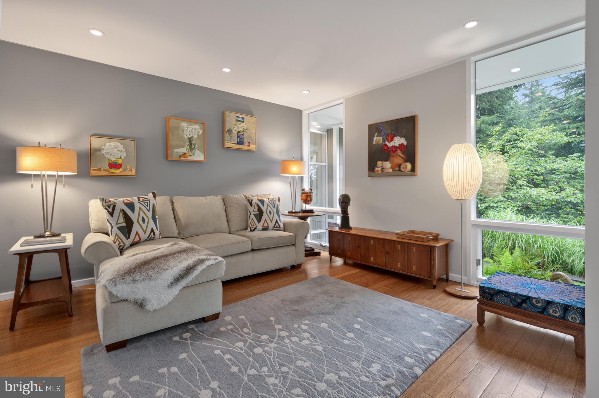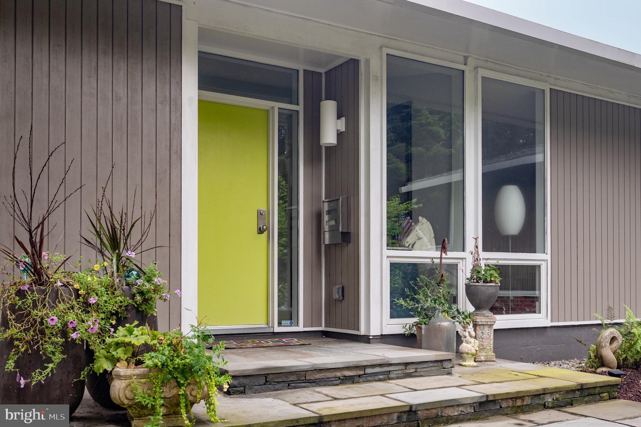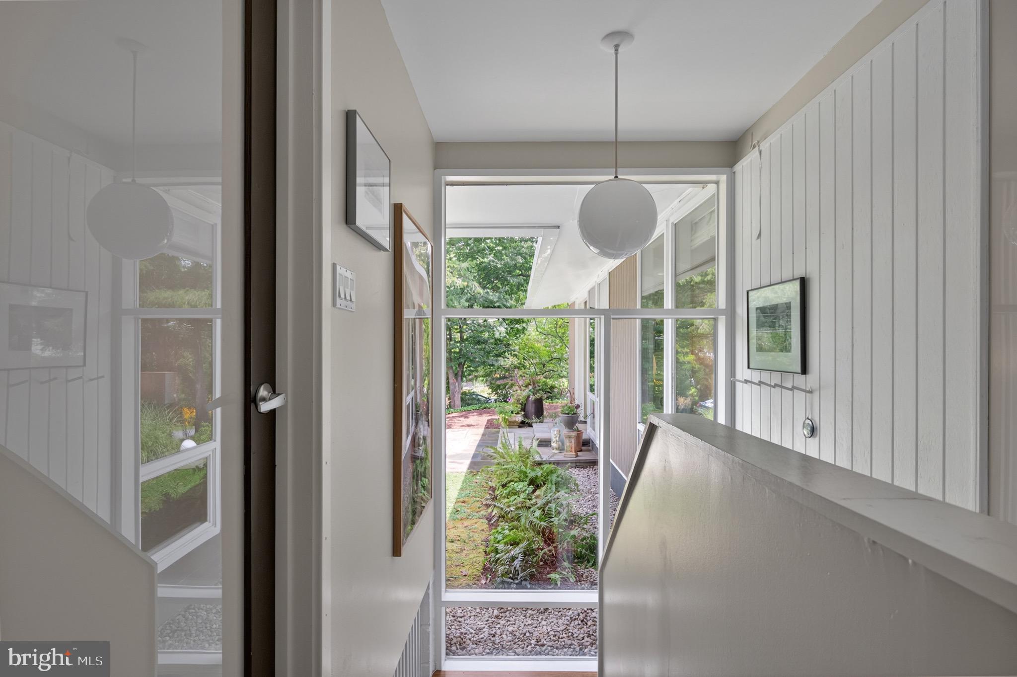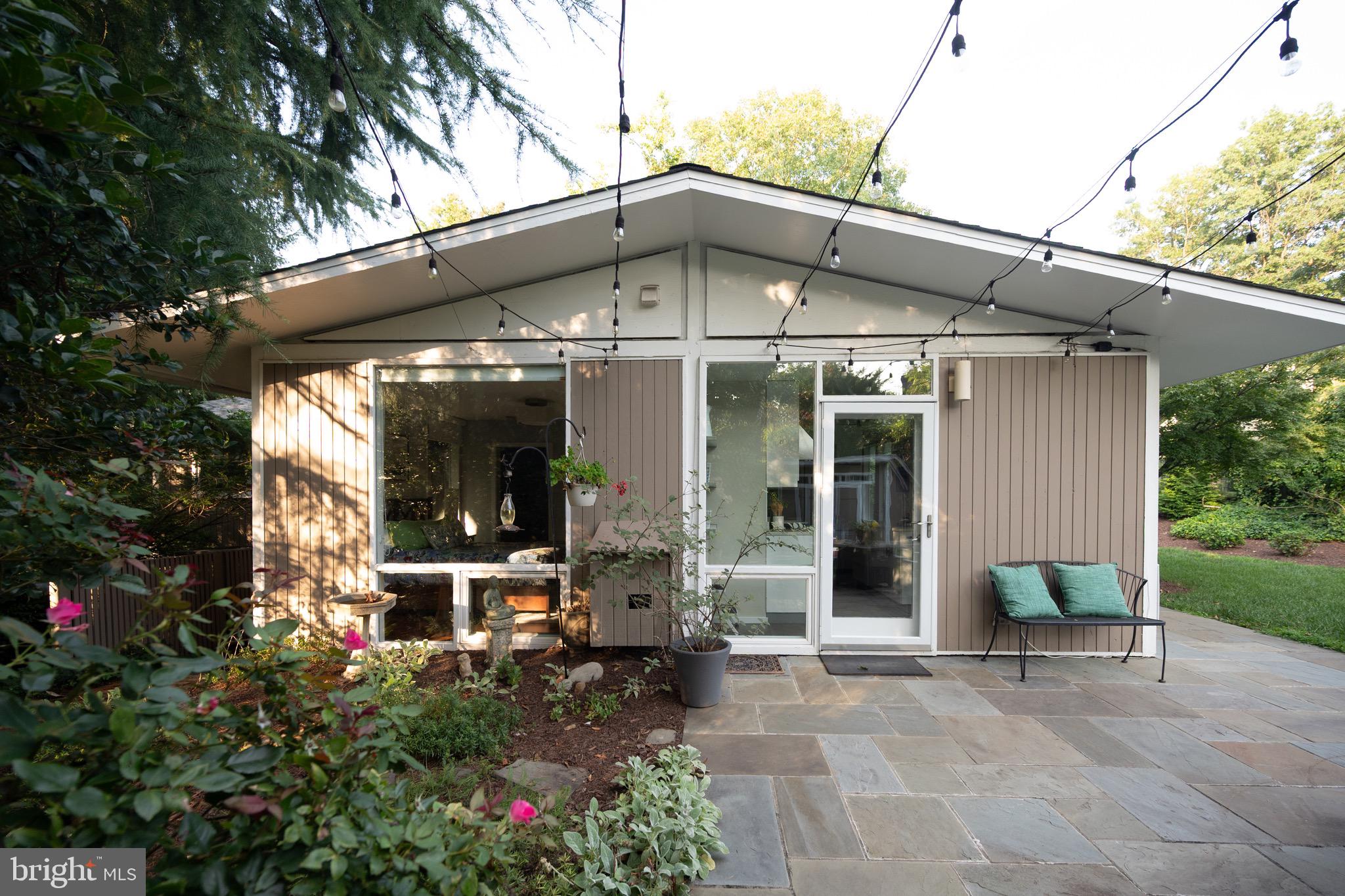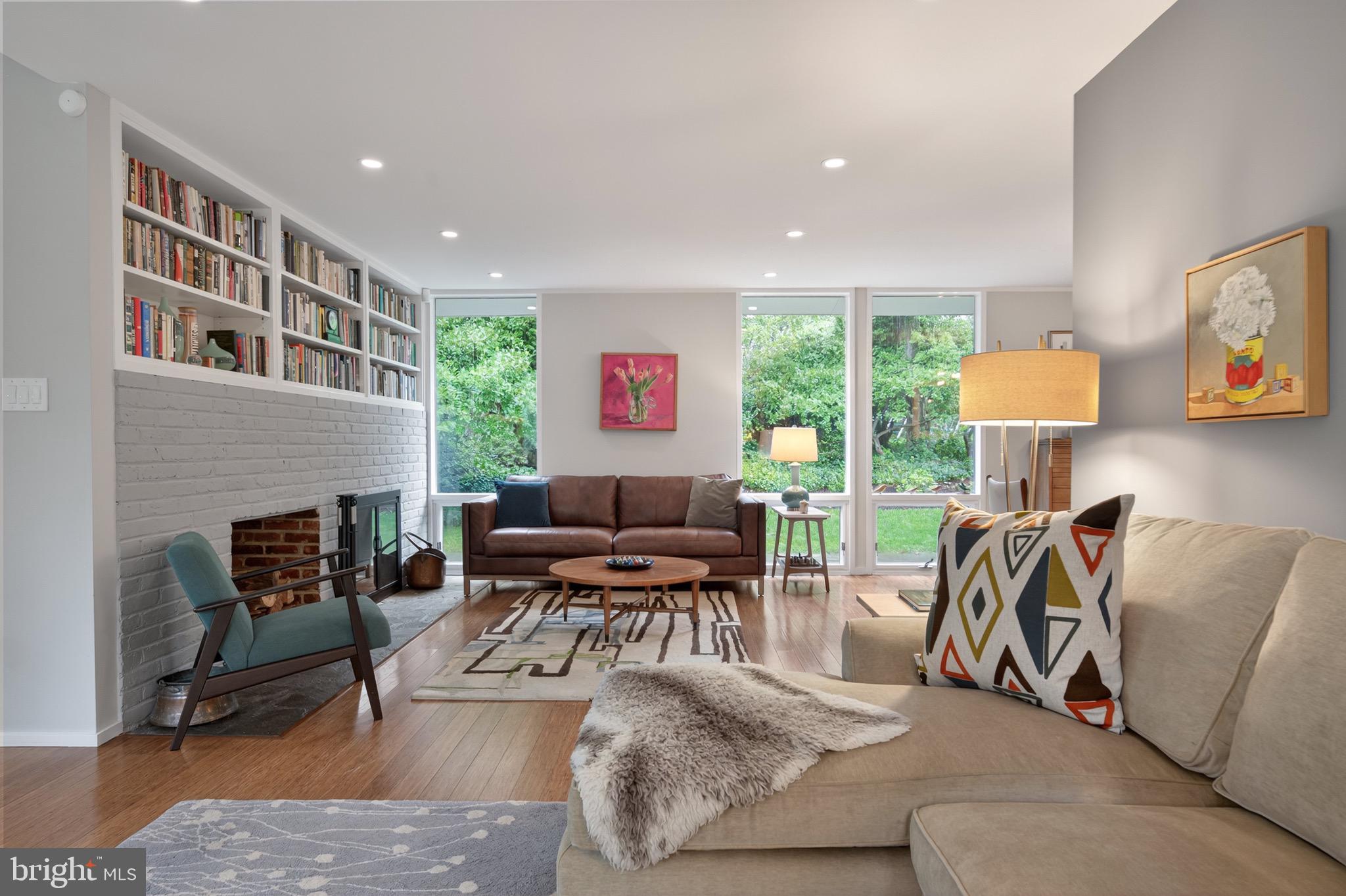 This extraordinary Mid-Century Modern home designed by Architect Charles Goodman is located in the highly sought-after Hollin Hills community. Home has been thoughtfully expanded to over 2,300 square feet with additions by renowned architects Casper Neer and Eason Cross. Extensively remodeled while preserving its iconic MCM charm, the home welcomes you with an impressive entry foyer featuring soaring ceilings, a coat closet, and a striking bubble chandelier. A private home office boasts a brick wall with built-in shelving, ideal for work or study. The open-concept living spaces include a welcoming living room and cozy family room with a wood-burning fireplace and custom built-in bookshelves, as well as a separate dining room perfect for entertaining. The custom kitchen features a large center island with seating, granite countertops, stainless steel appliances, and direct access to the patio, making it a true centerpiece of the home.