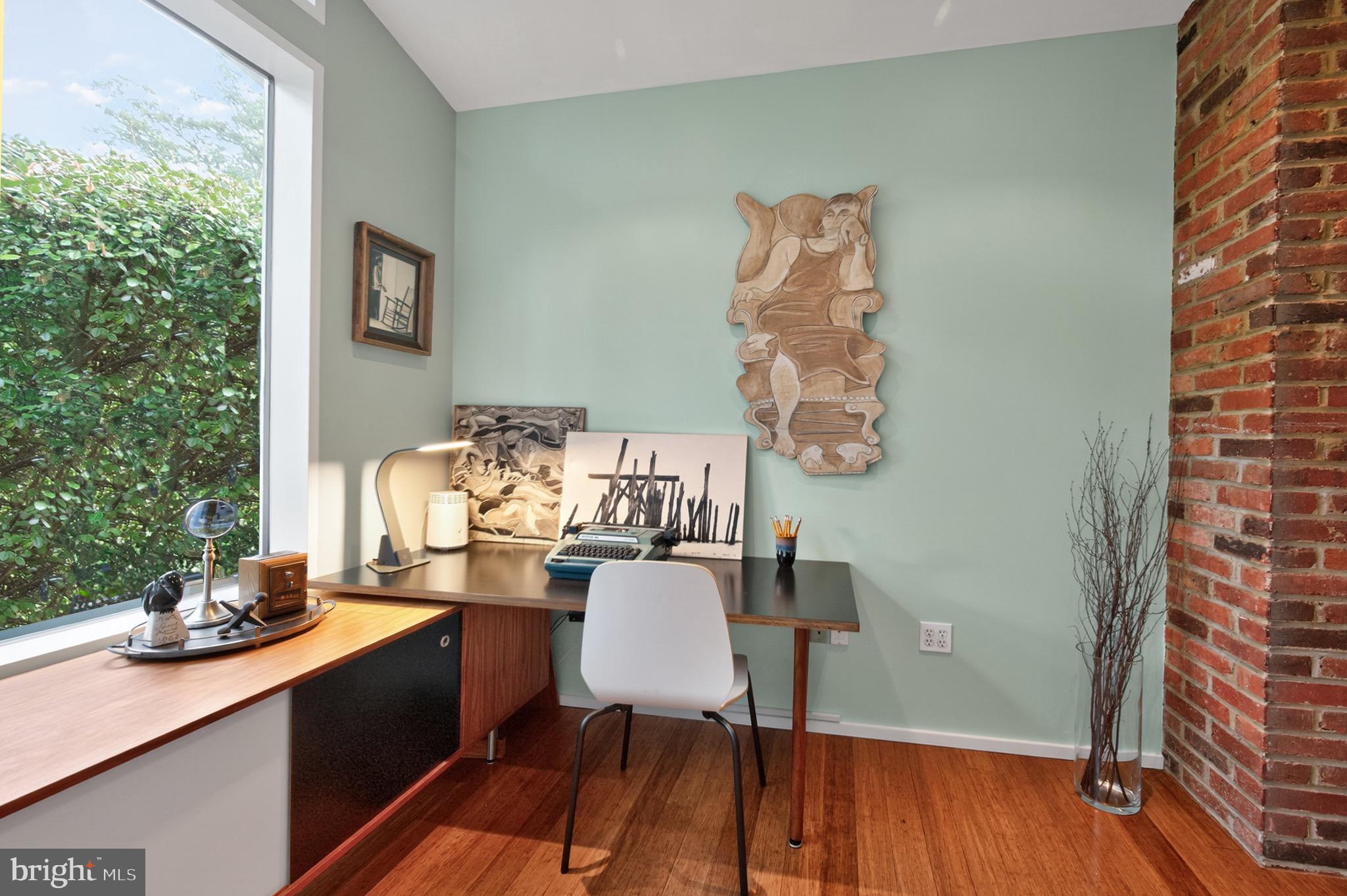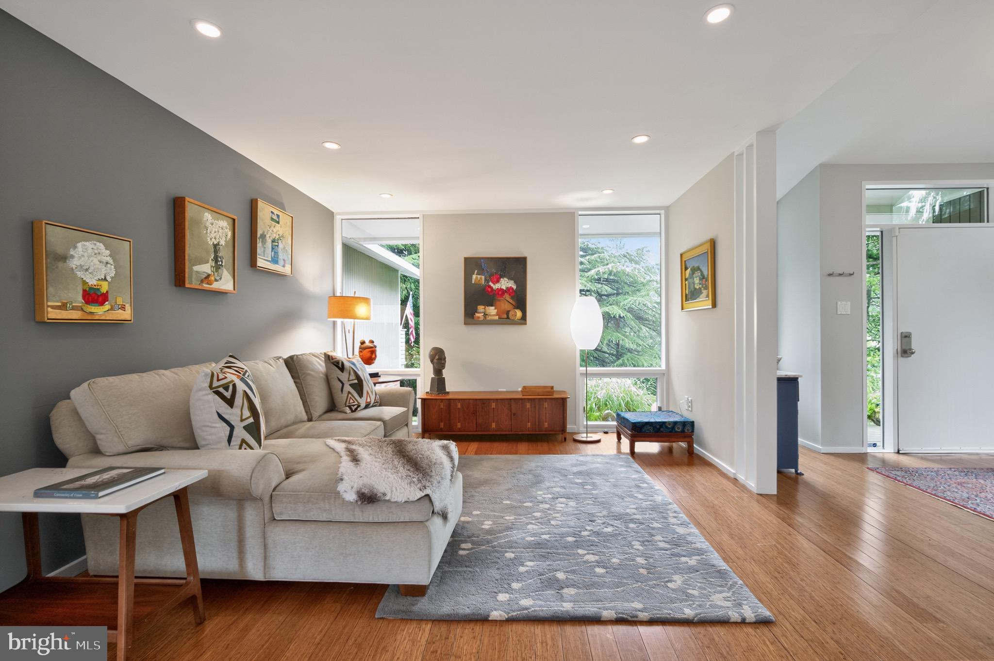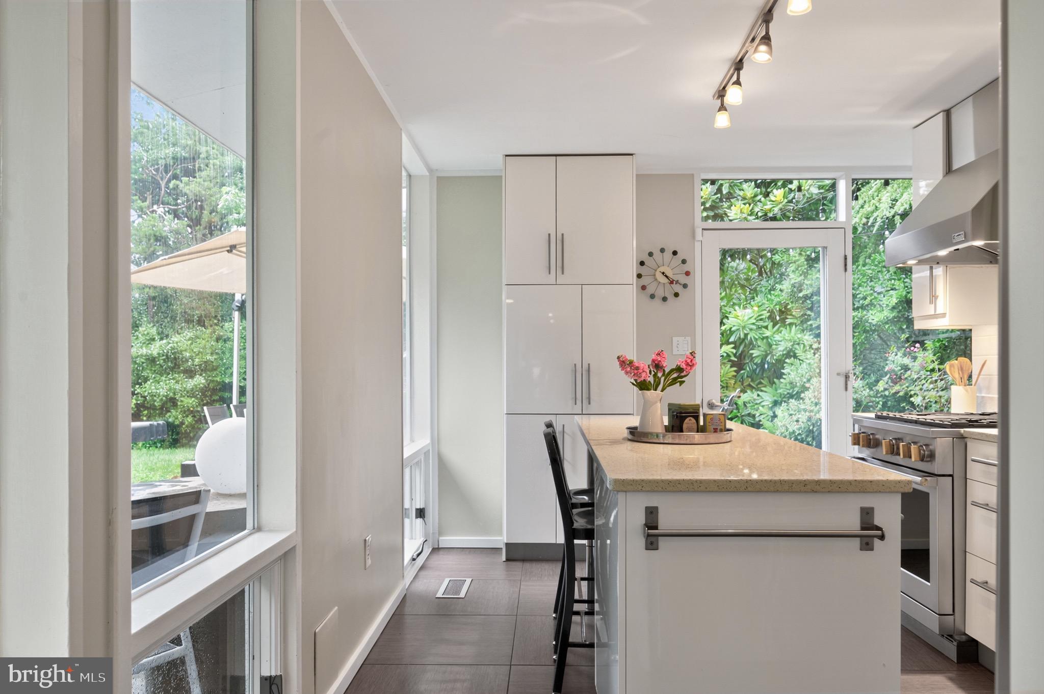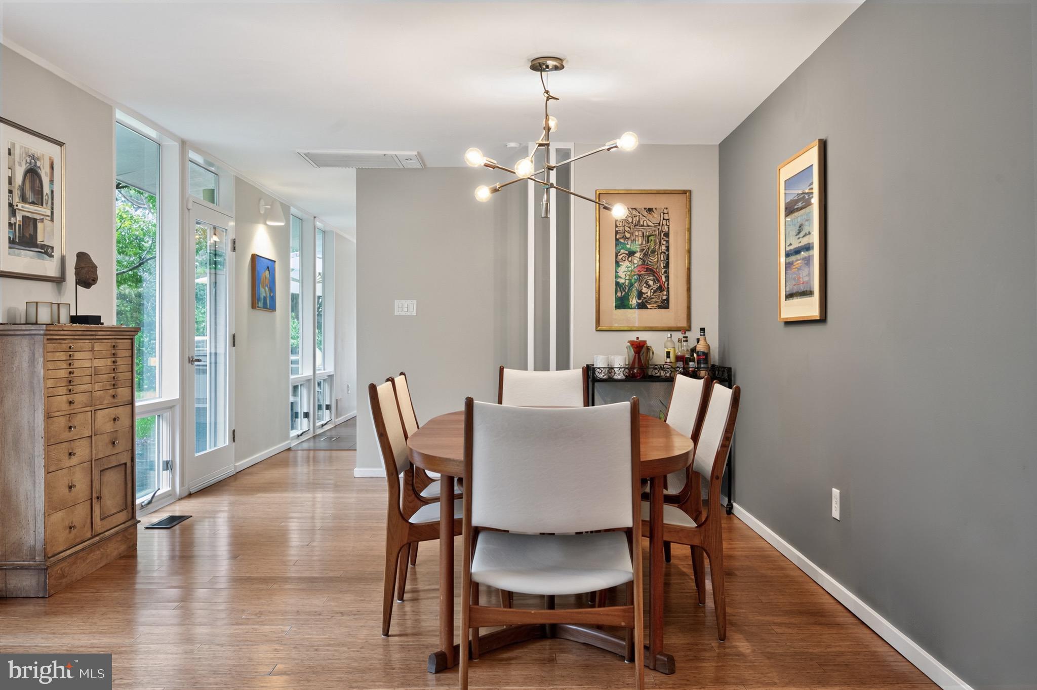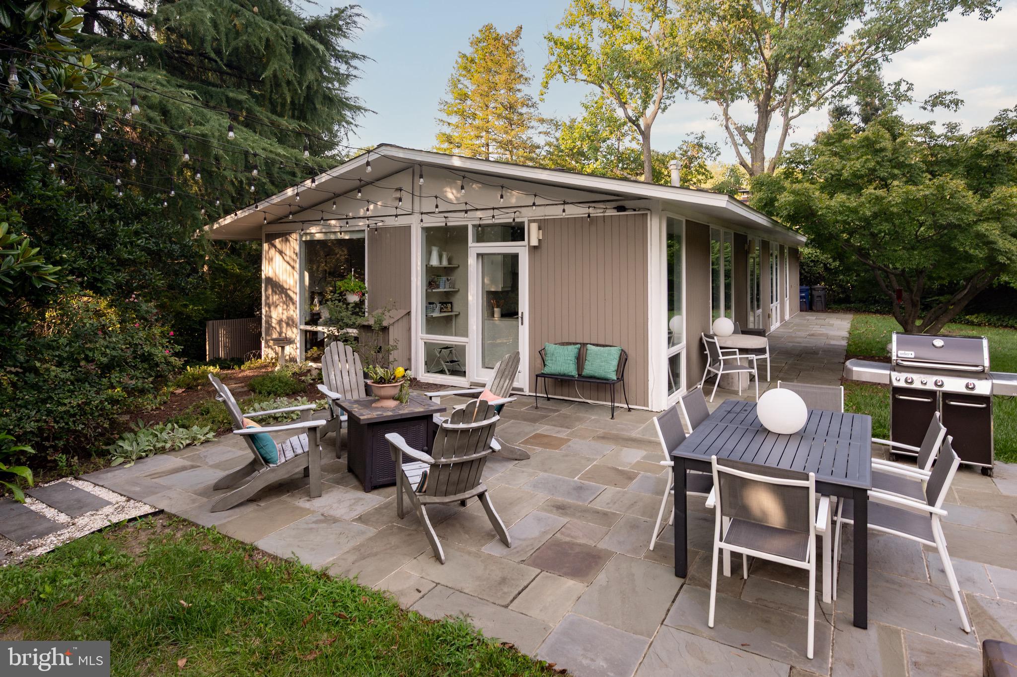 This extraordinary Mid-Century Modern home designed by Architect Charles Goodman is located in the highly sought-after Hollin Hills community. Home has been thoughtfully expanded to over 2,300 square feet with additions by renowned architects Casper Neer and Eason Cross. Extensively remodeled while preserving its iconic MCM charm, the home welcomes you with an impressive entry foyer featuring soaring ceilings, a coat closet, and a striking bubble chandelier. A private home office boasts a brick wall with built-in shelving, ideal for work or study. The open-concept living spaces include a welcoming living room and cozy family room with a wood-burning fireplace and custom built-in bookshelves, as well as a separate dining room perfect for entertaining. The custom kitchen features a large center island with seating, granite countertops, stainless steel appliances, and direct access to the patio, making it a true centerpiece of the home.