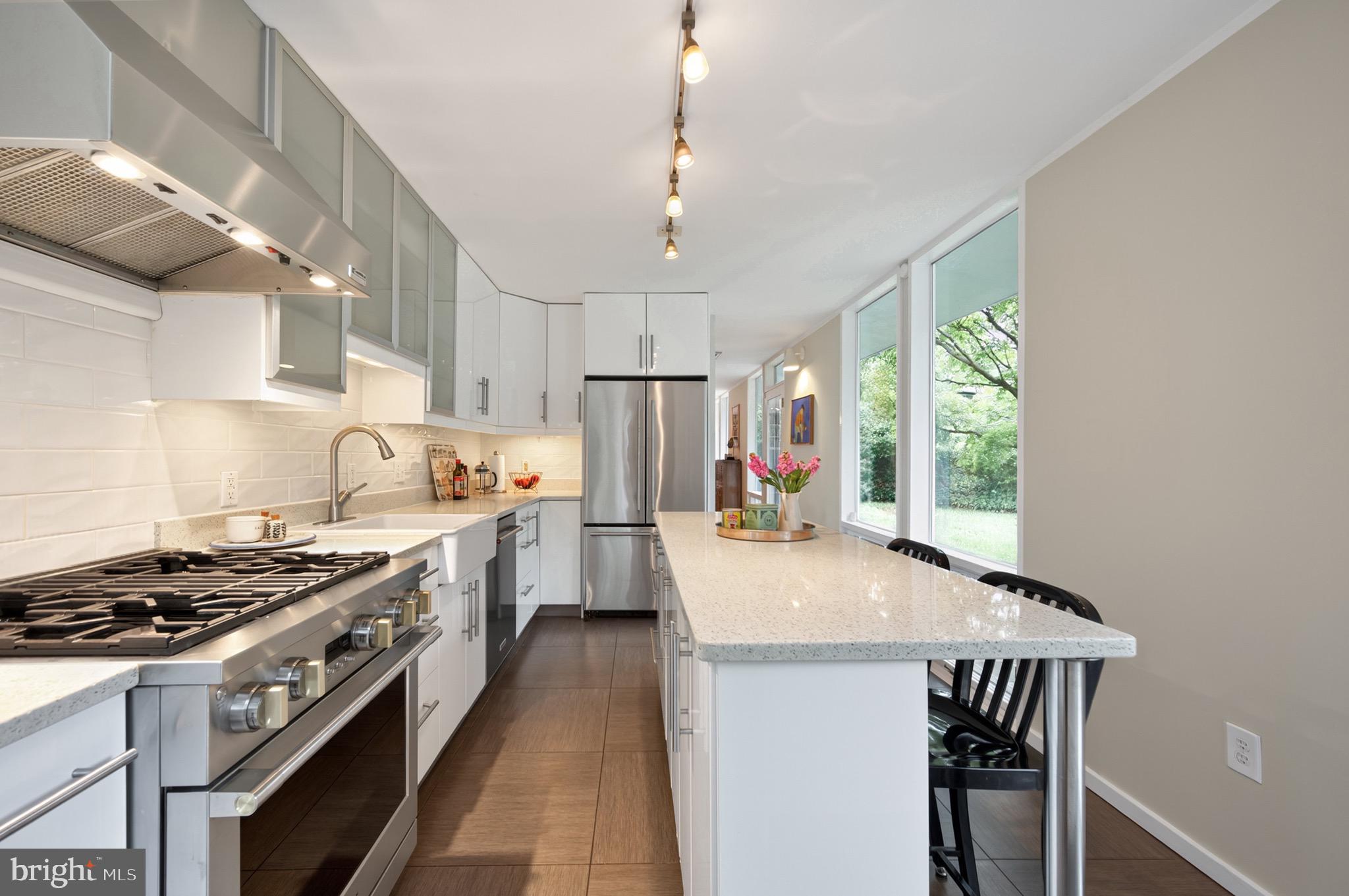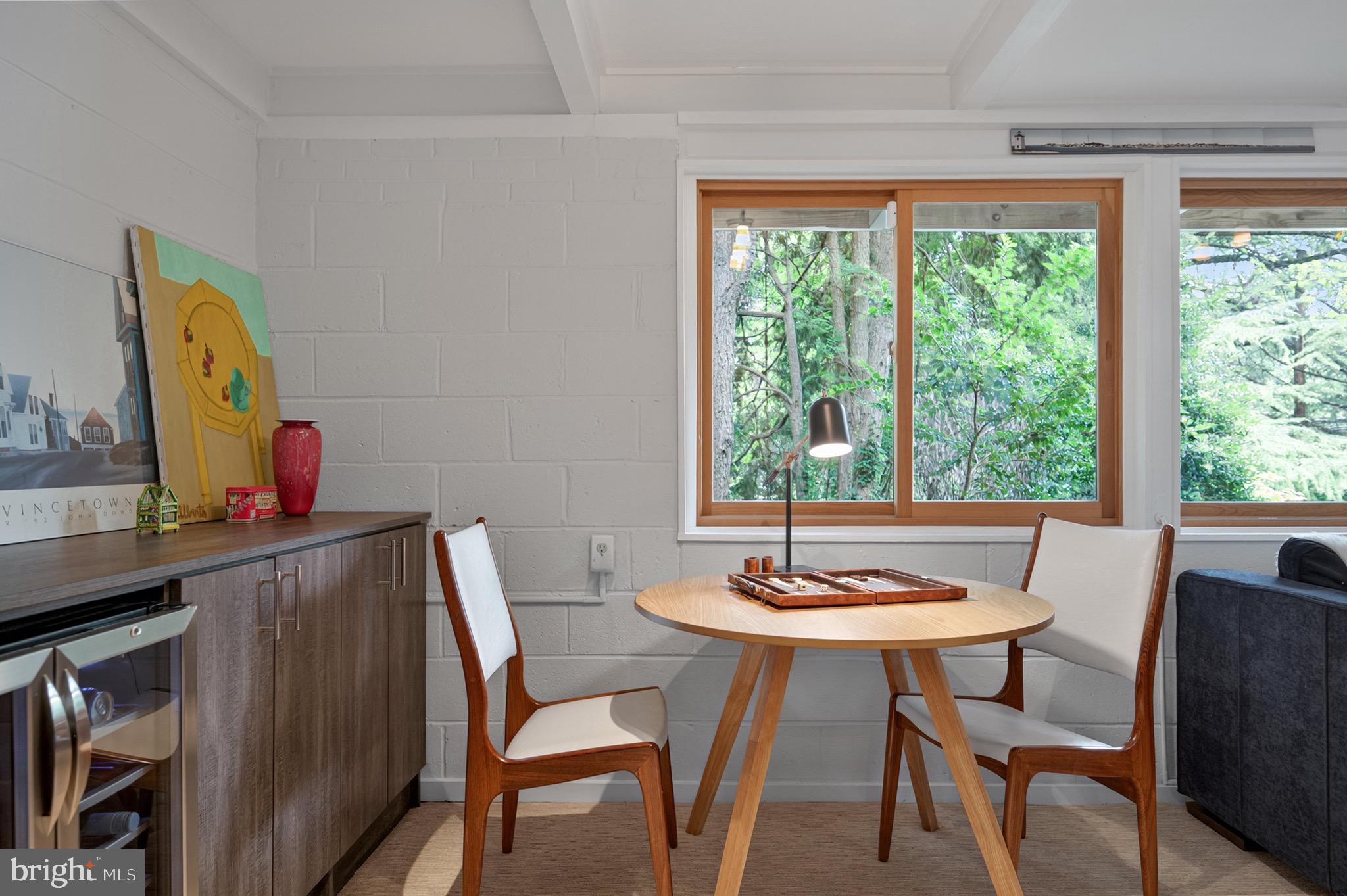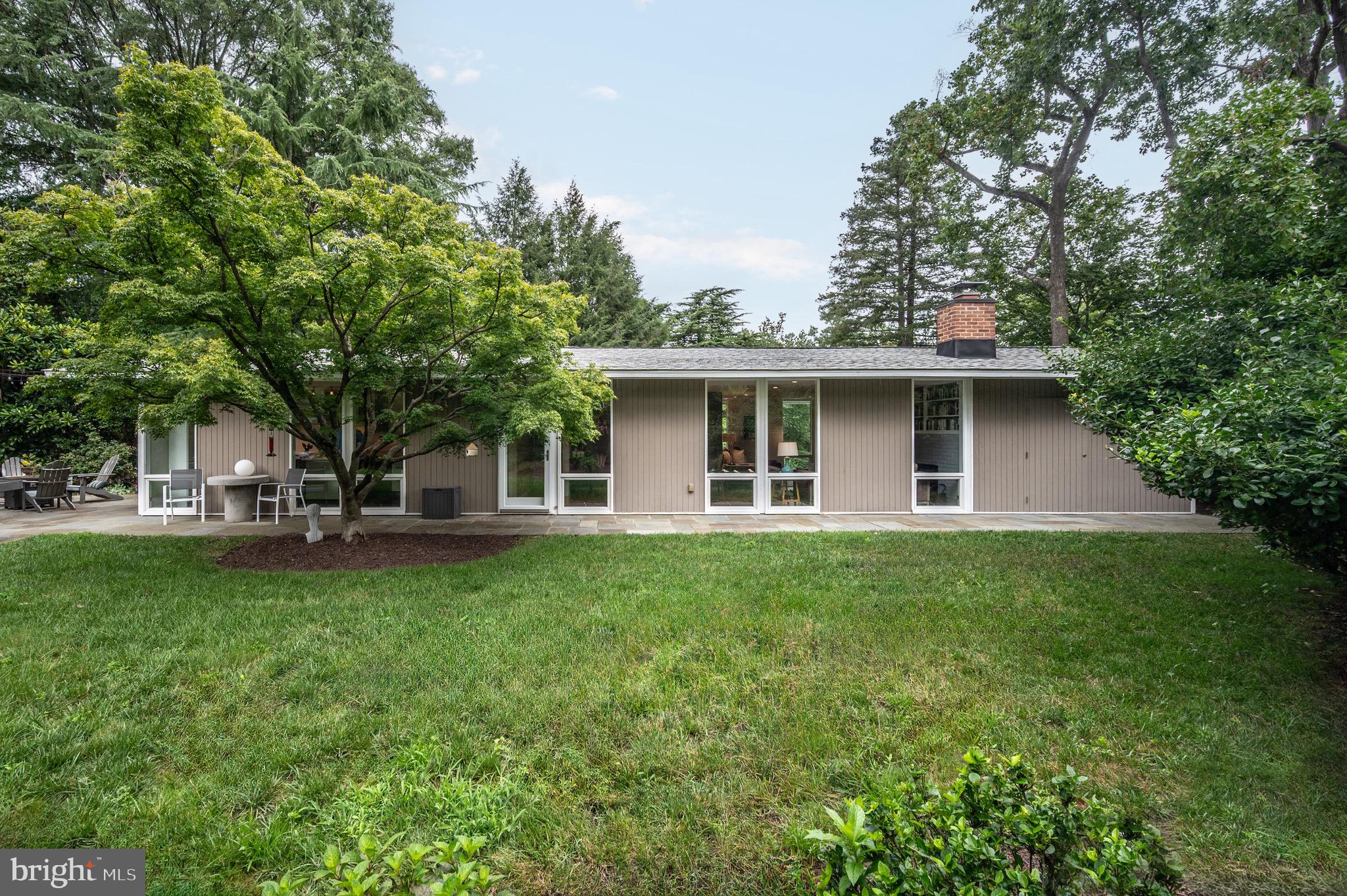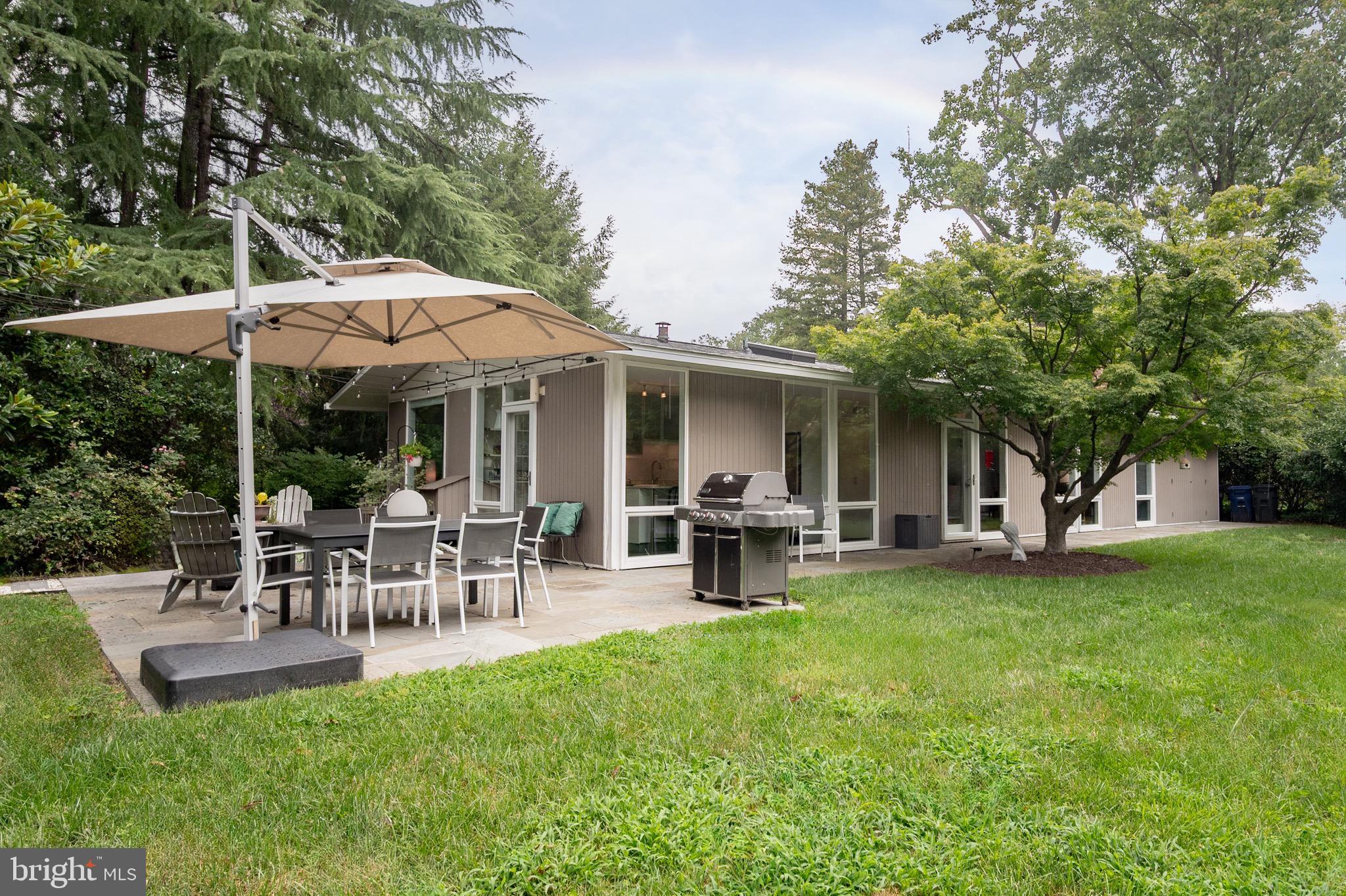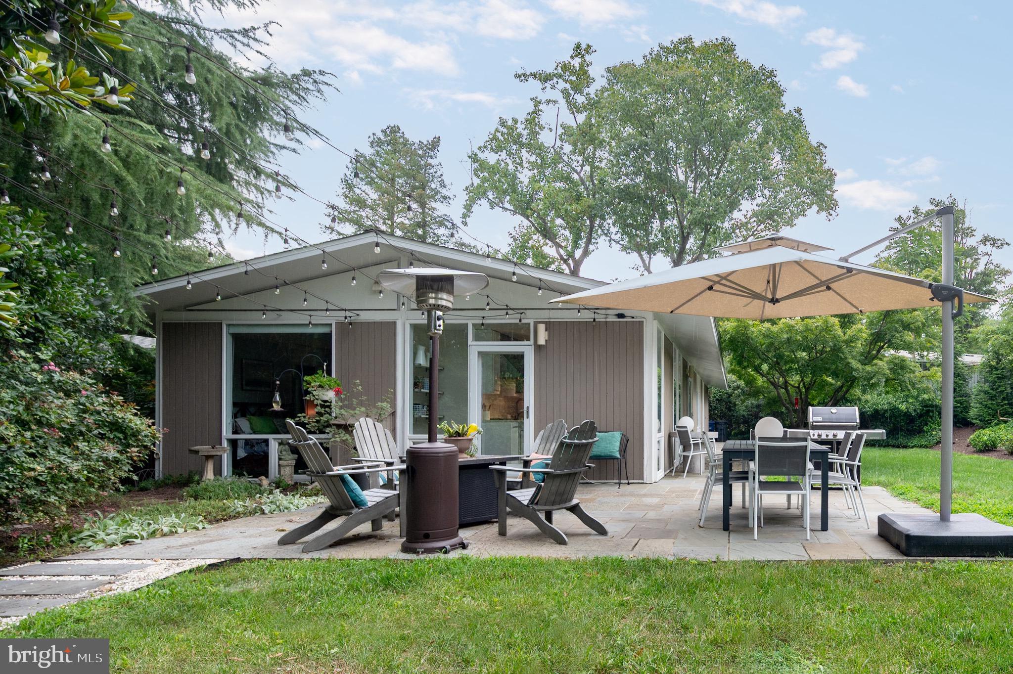 This extraordinary Mid-Century Modern home designed by Architect Charles Goodman is located in the highly sought-after Hollin Hills community. Home has been thoughtfully expanded to over 2,300 square feet with additions by renowned architects Casper Neer and Eason Cross. Extensively remodeled while preserving its iconic MCM charm, the home welcomes you with an impressive entry foyer featuring soaring ceilings, a coat closet, and a striking bubble chandelier. A private home office boasts a brick wall with built-in shelving, ideal for work or study. The open-concept living spaces include a welcoming living room and cozy family room with a wood-burning fireplace and custom built-in bookshelves, as well as a separate dining room perfect for entertaining. The custom kitchen features a large center island with seating, granite countertops, stainless steel appliances, and direct access to the patio, making it a true centerpiece of the home.