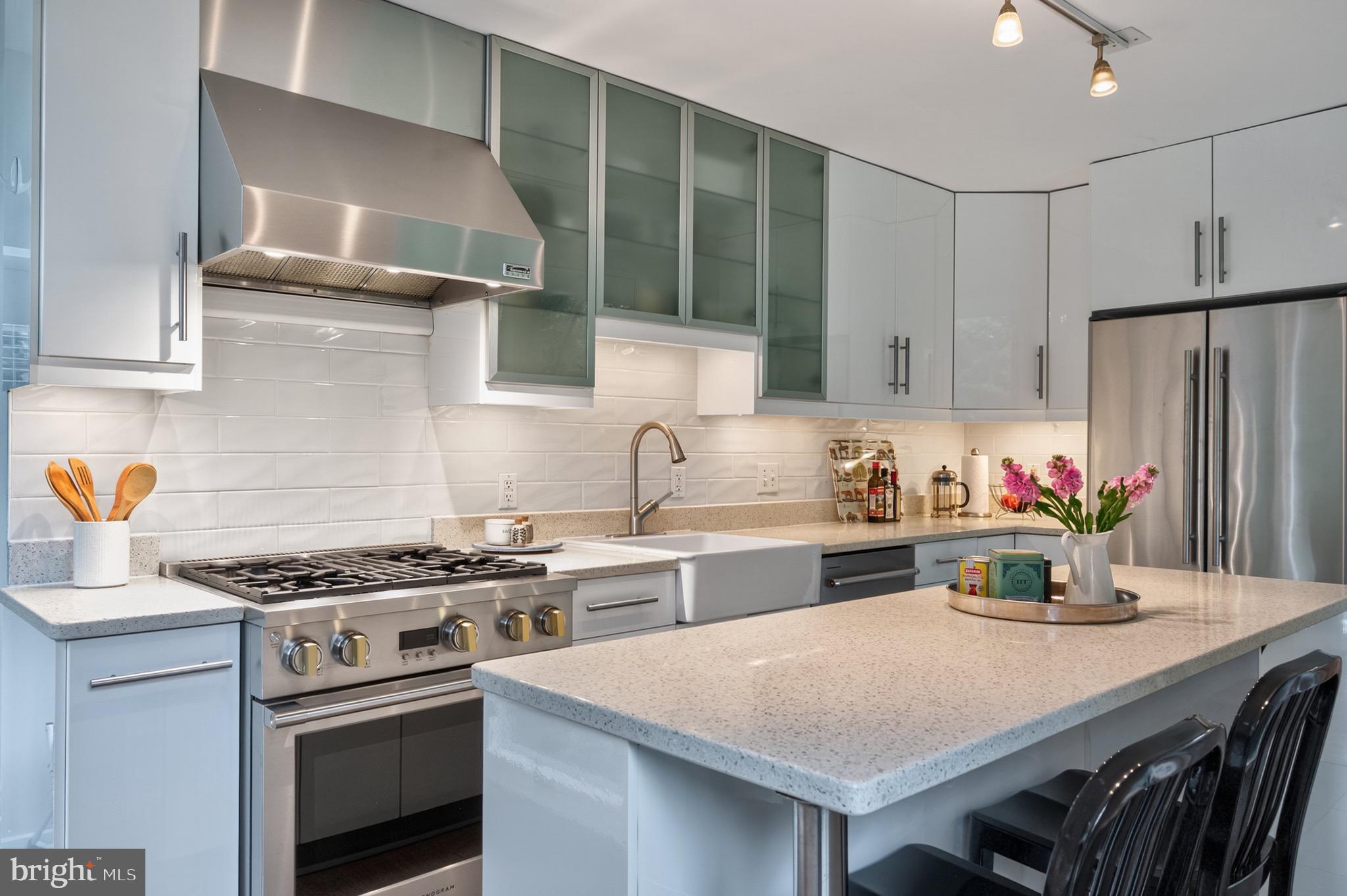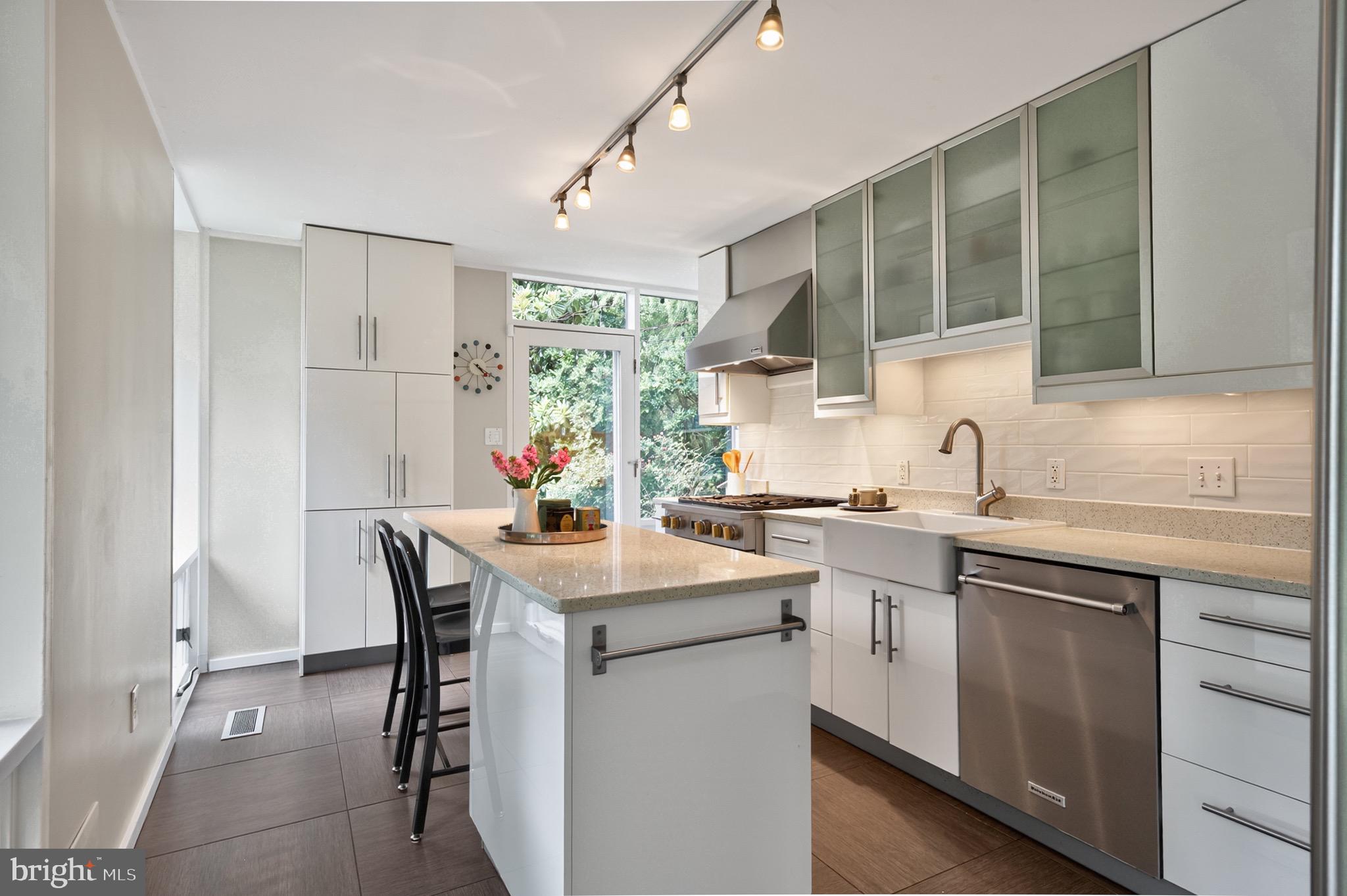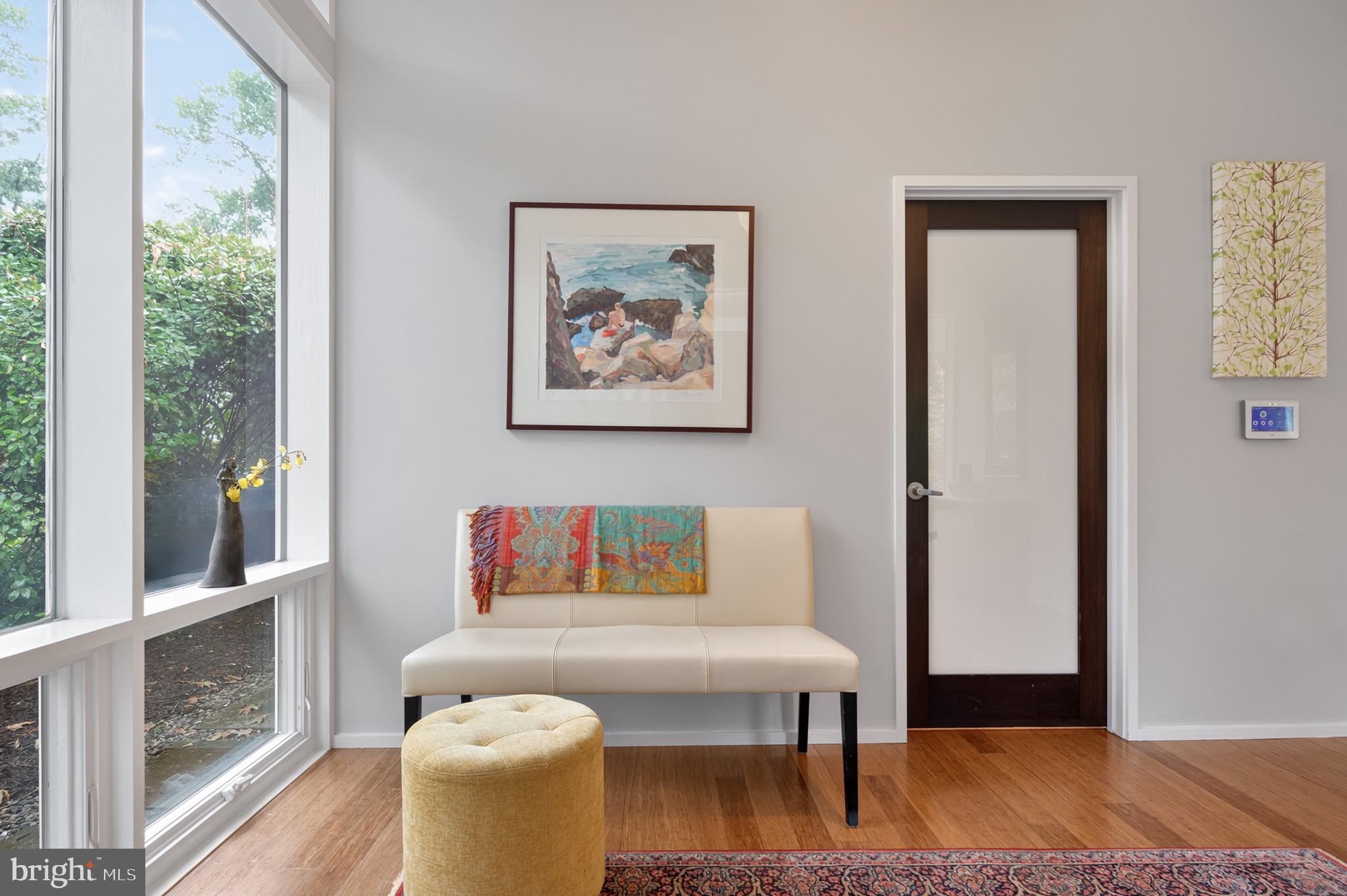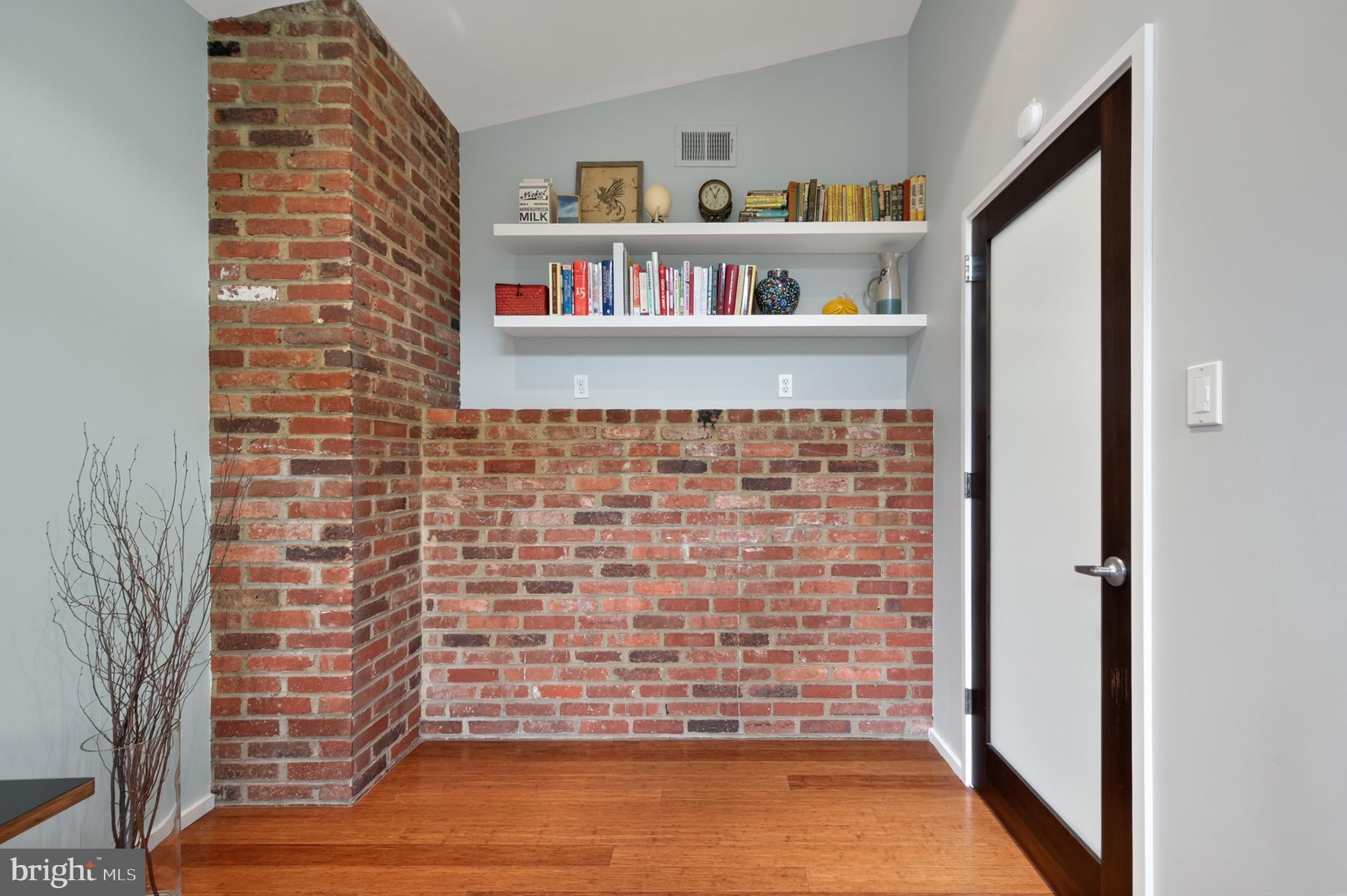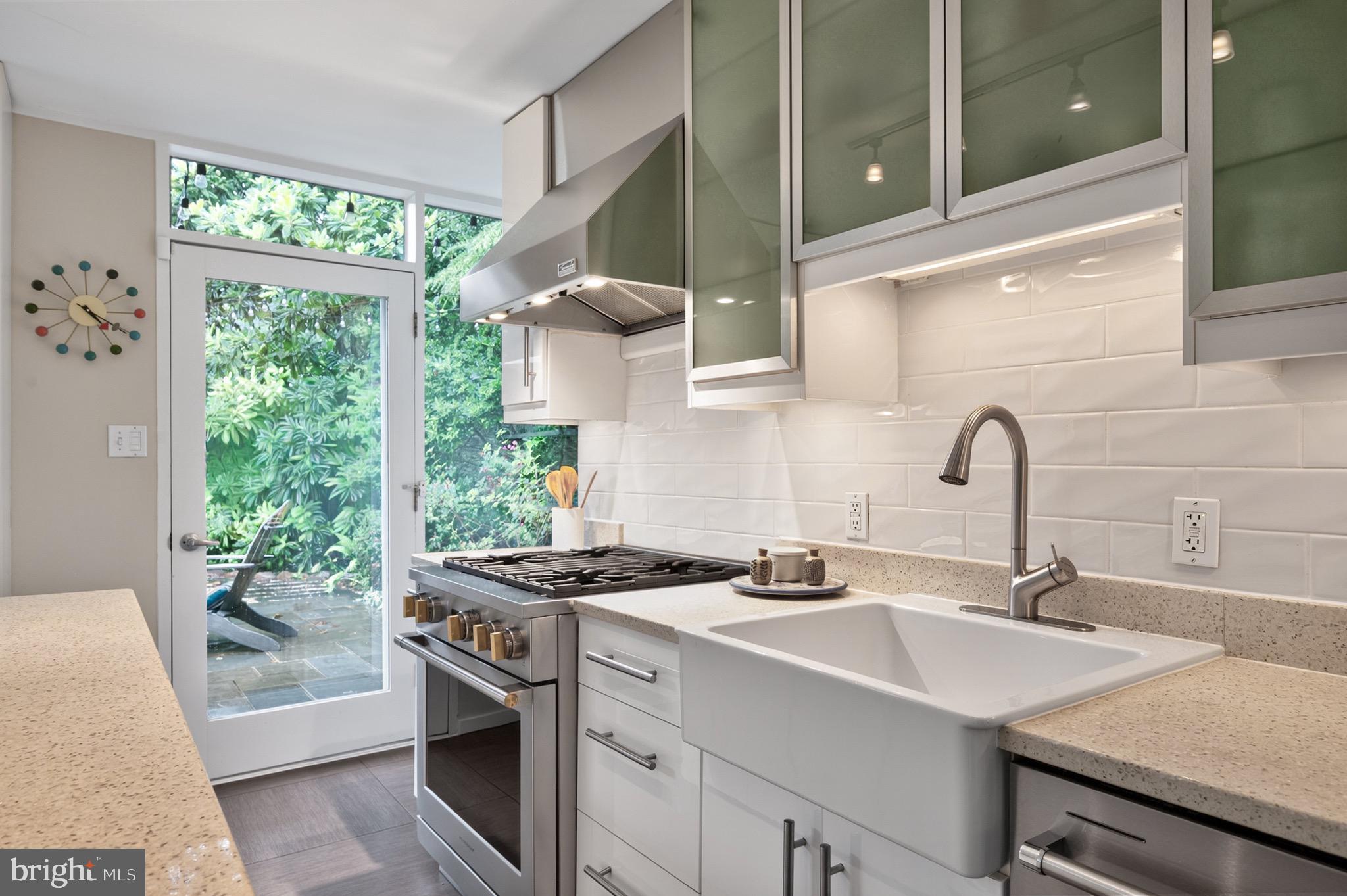 This extraordinary Mid-Century Modern home designed by Architect Charles Goodman is located in the highly sought-after Hollin Hills community. Home has been thoughtfully expanded to over 2,300 square feet with additions by renowned architects Casper Neer and Eason Cross. Extensively remodeled while preserving its iconic MCM charm, the home welcomes you with an impressive entry foyer featuring soaring ceilings, a coat closet, and a striking bubble chandelier. A private home office boasts a brick wall with built-in shelving, ideal for work or study. The open-concept living spaces include a welcoming living room and cozy family room with a wood-burning fireplace and custom built-in bookshelves, as well as a separate dining room perfect for entertaining. The custom kitchen features a large center island with seating, granite countertops, stainless steel appliances, and direct access to the patio, making it a true centerpiece of the home.