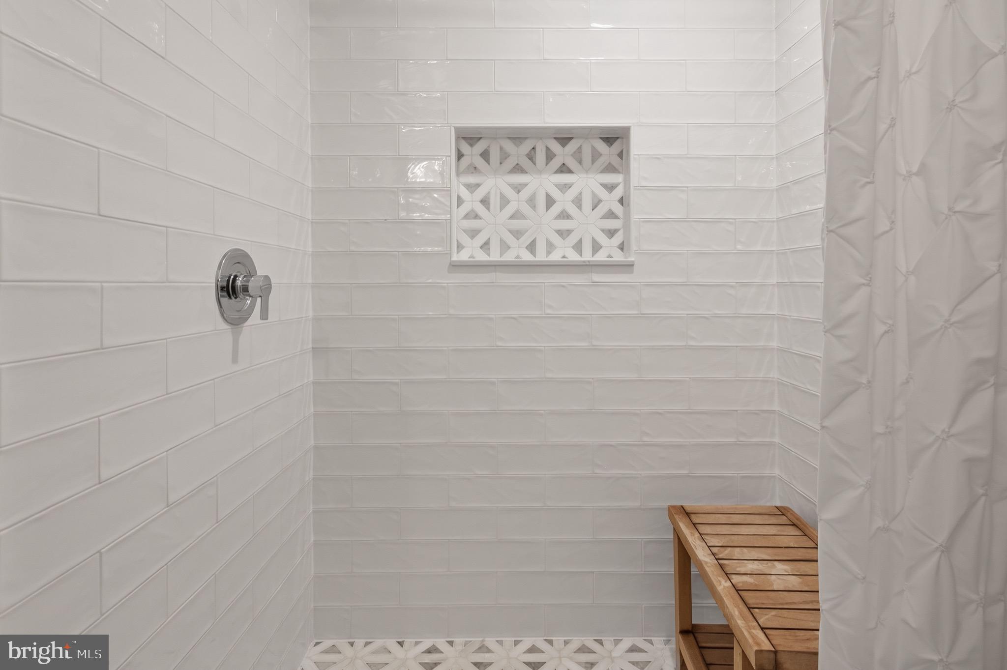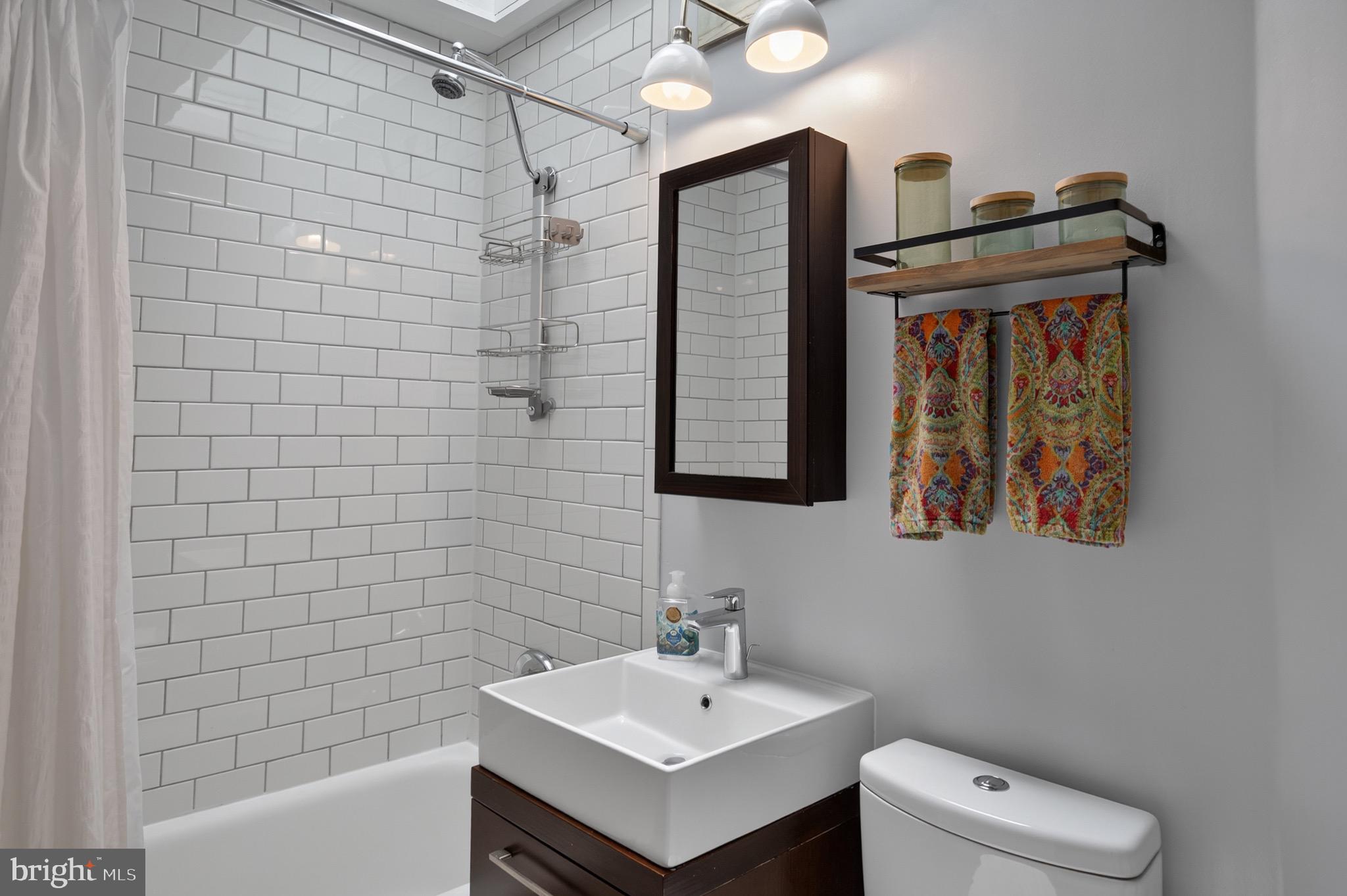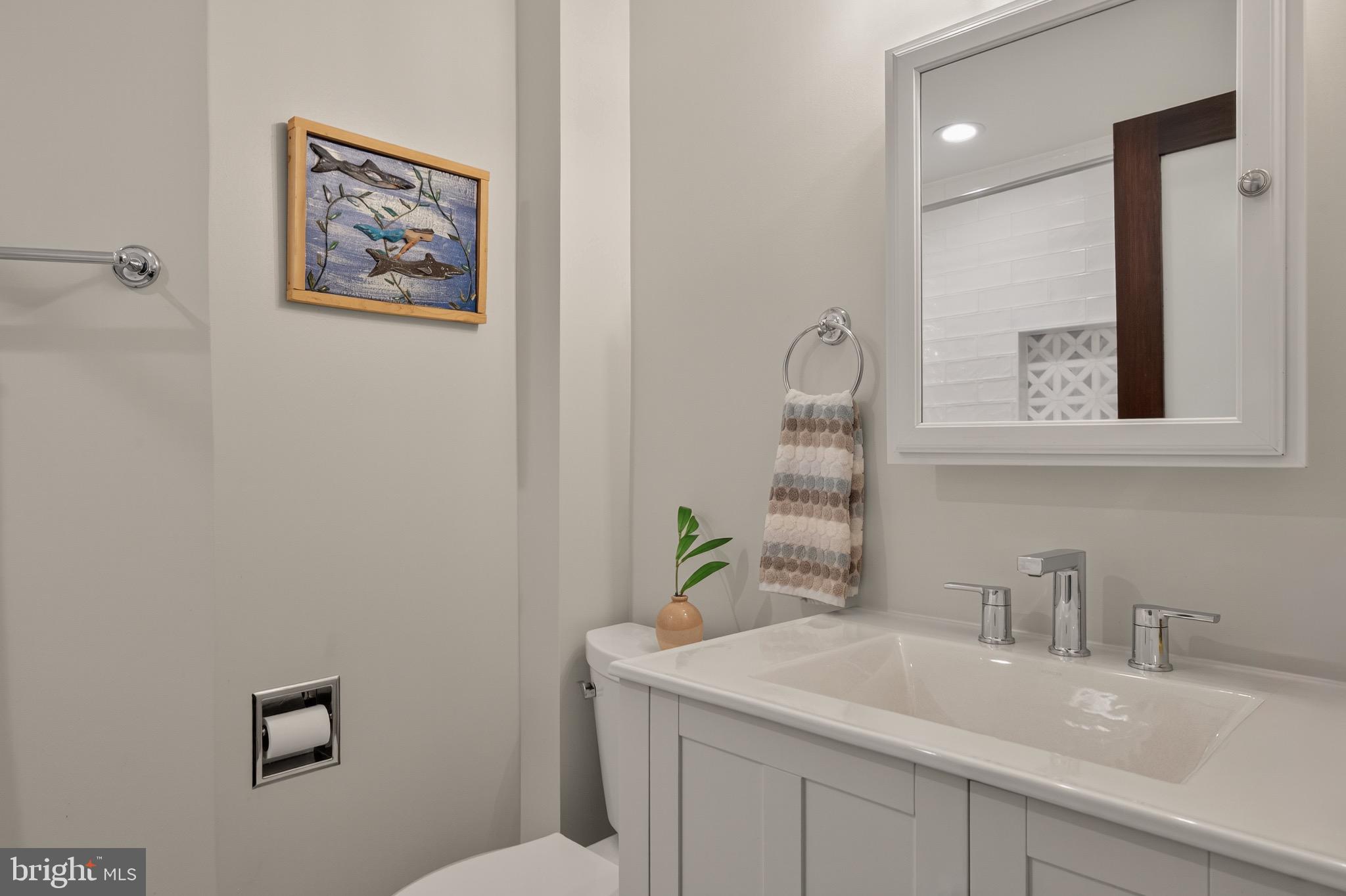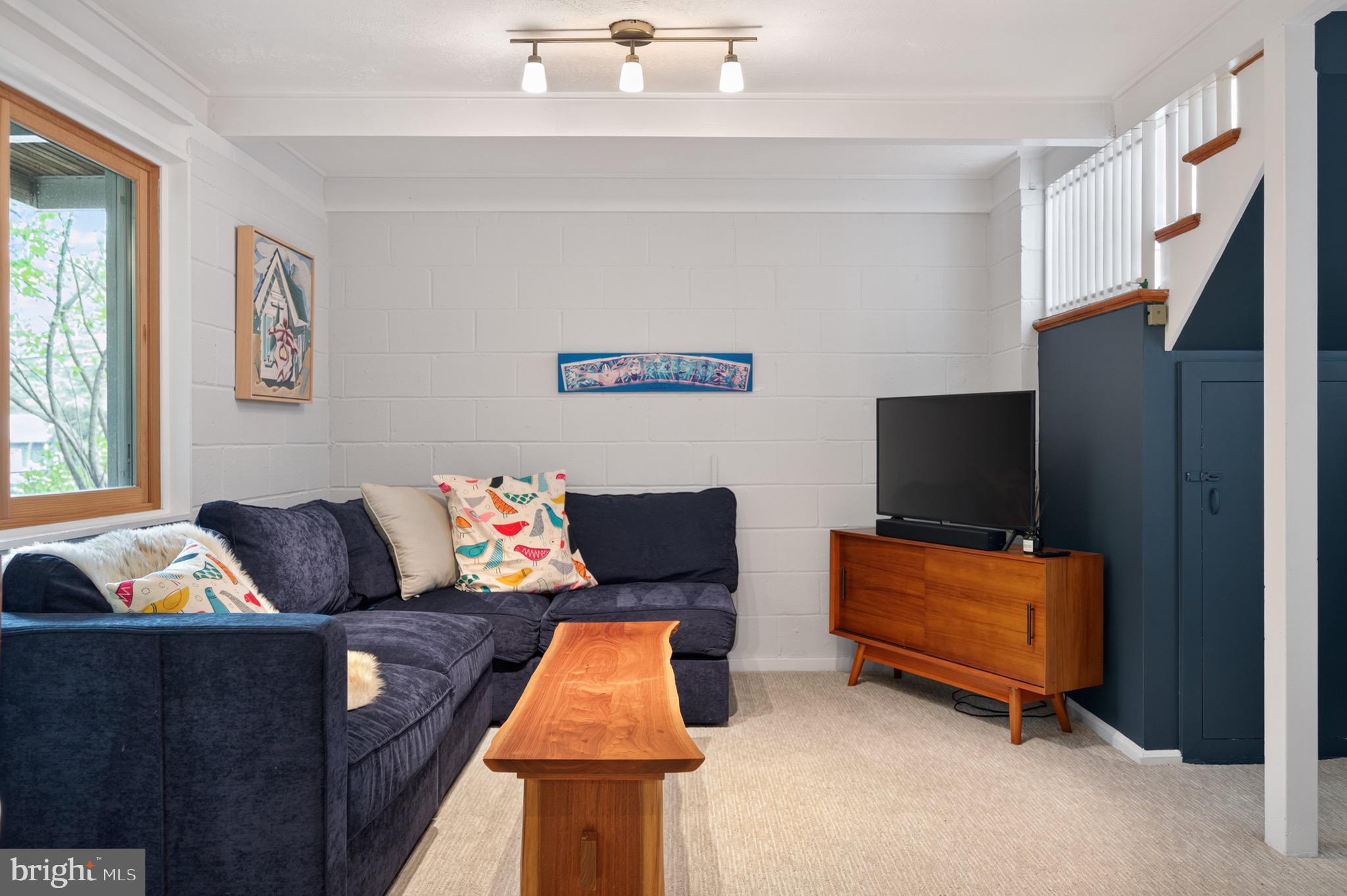 The main level includes a spacious primary suite with a built-in dresser, a large custom closet, and a beautifully remodeled en-suite bathroom showcasing a walk-in shower with custom marble tile. A second main-level bedroom offers a custom closet organizer and light filled windows. There is another remodeled full bathroom, complete with a skylight. A convenient main-level laundry closet adds to the home's functionality. Upstairs, two additional bedrooms offer access to a Juliet balcony, with one bedroom featuring a walk-in closet. The large, sunlit lower-level recreation room provides additional living space, ideal for relaxing or entertaining as well as additional storage.