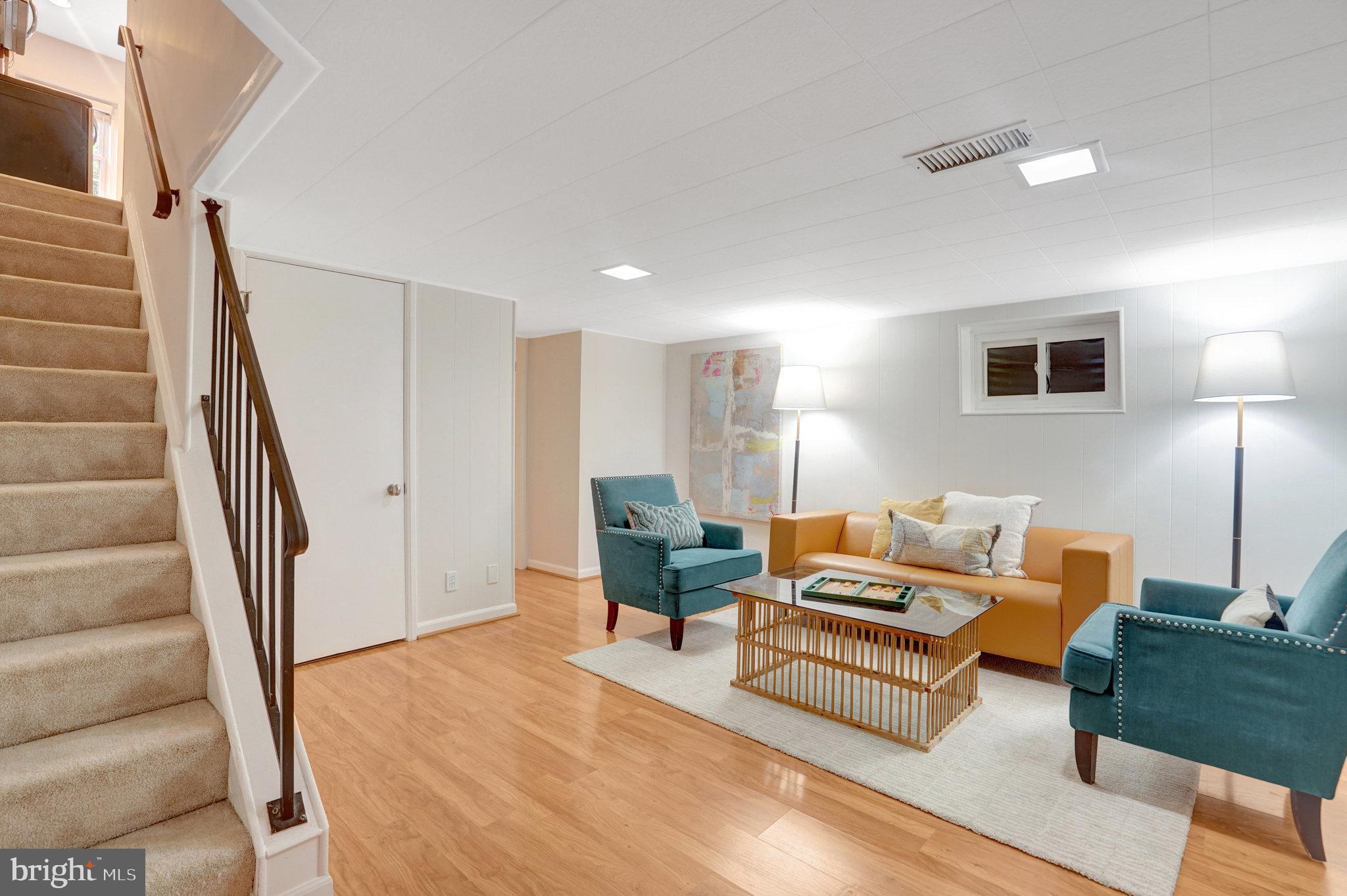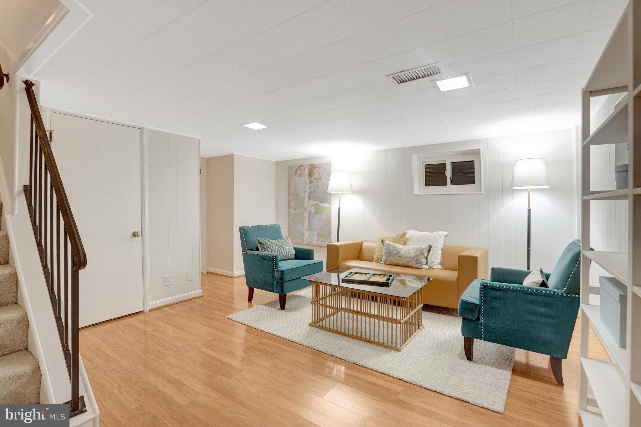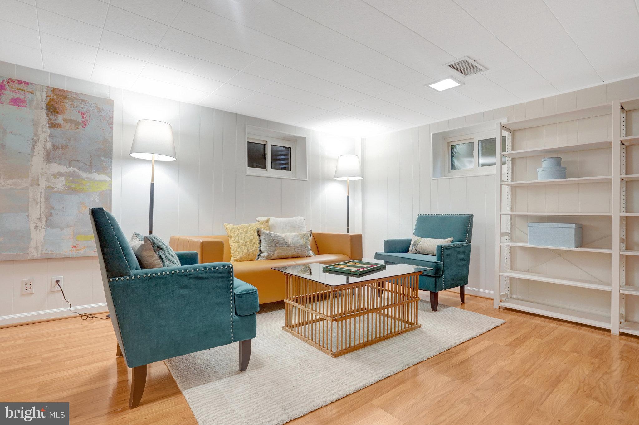 The Lower-level family room has hardwood style flooring with built in wall shelves. Small bedroom/office/den with full bath and laundry.