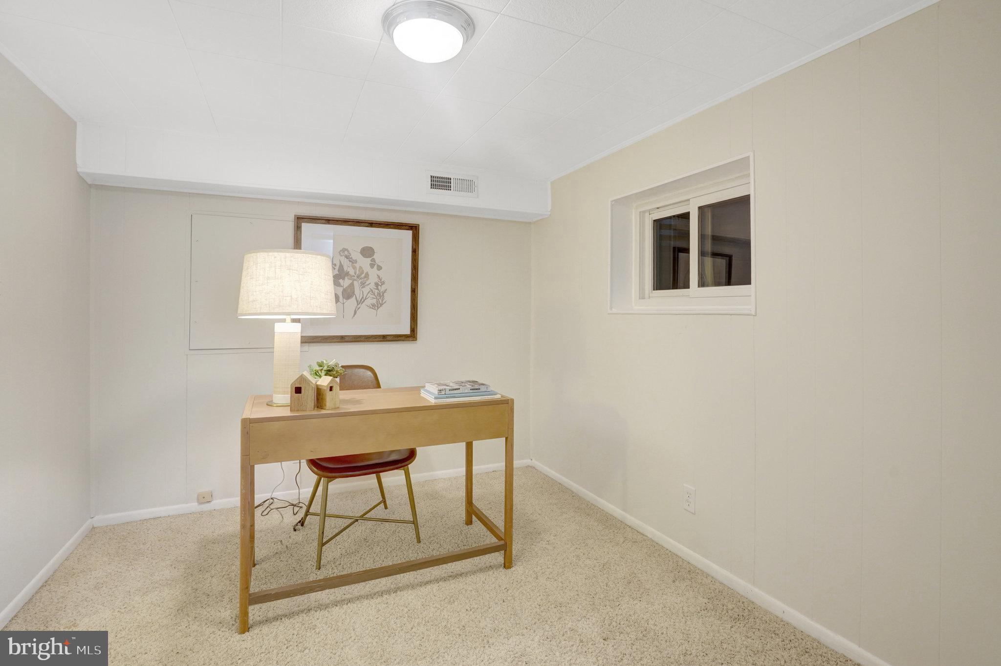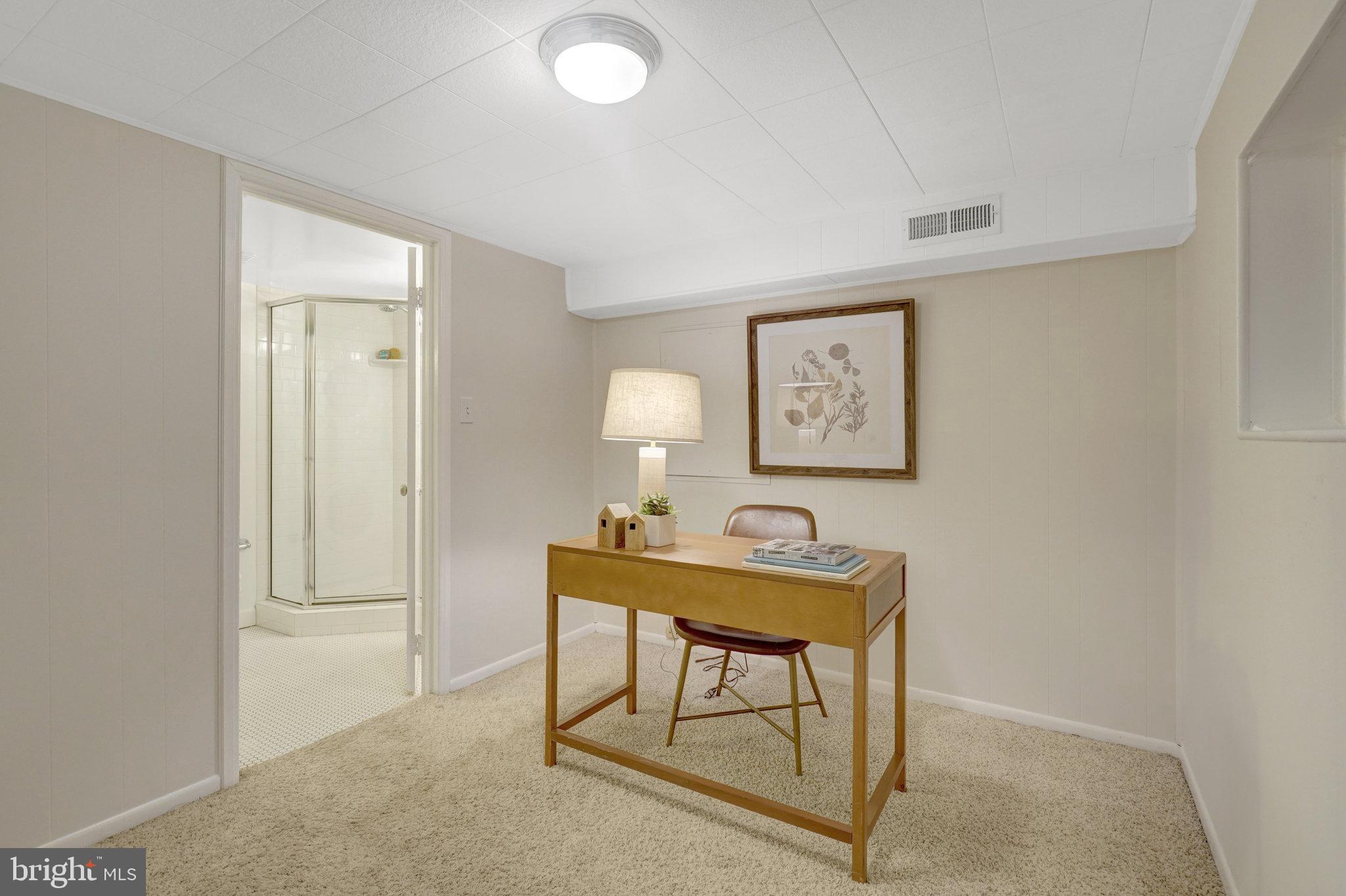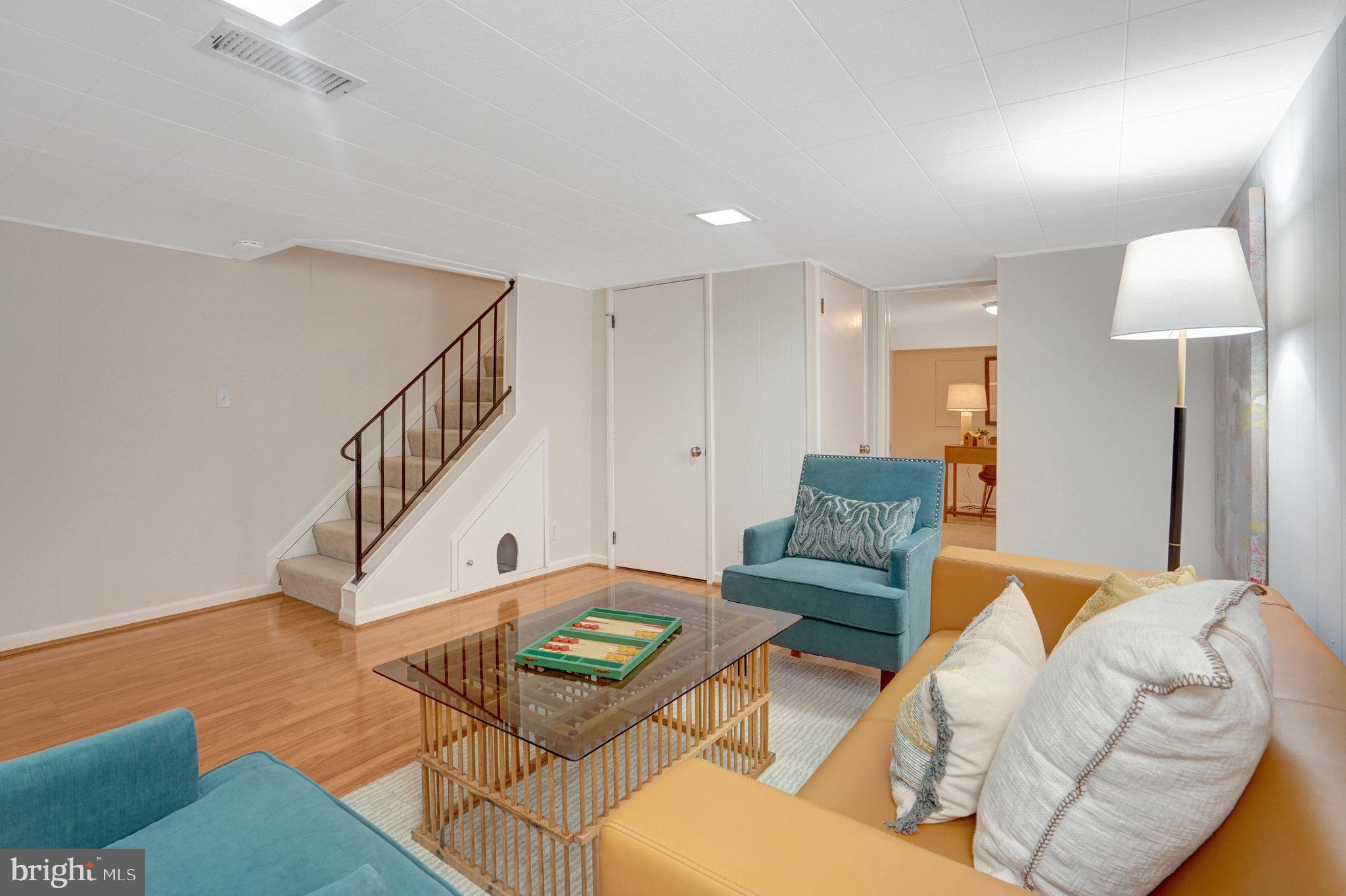 The Lower-level family room has hardwood style flooring with built in wall shelves. Small bedroom/office/den with full bath and laundry.