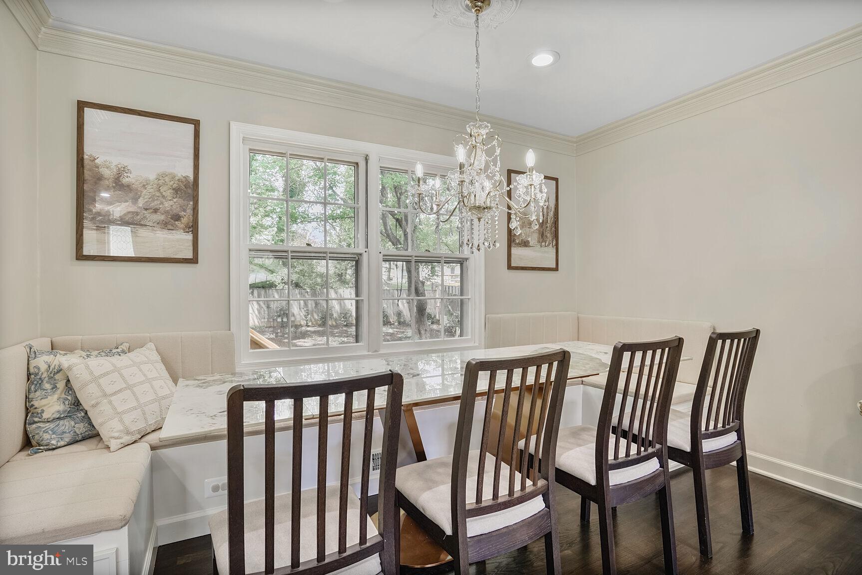 Inside, the heart of the home is the fully remodeled open-concept kitchen featuring a custom quartz island, built-in banquette seating with a handcrafted table, and seamless flow into the bright main living areas. Refinished natural wood floors, recessed lighting in every room, and whole-home repainting create a fresh, elevated ambiance.
