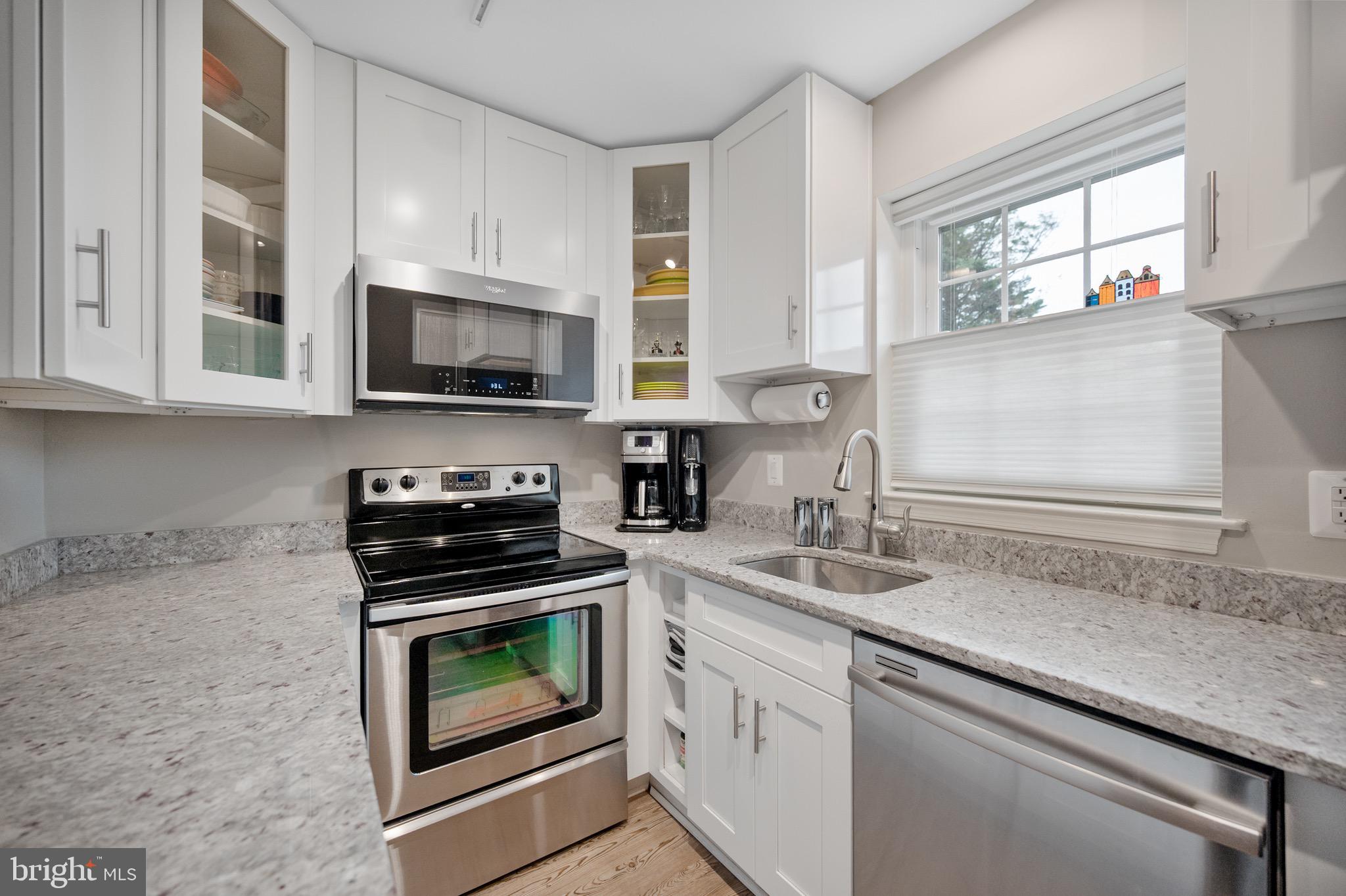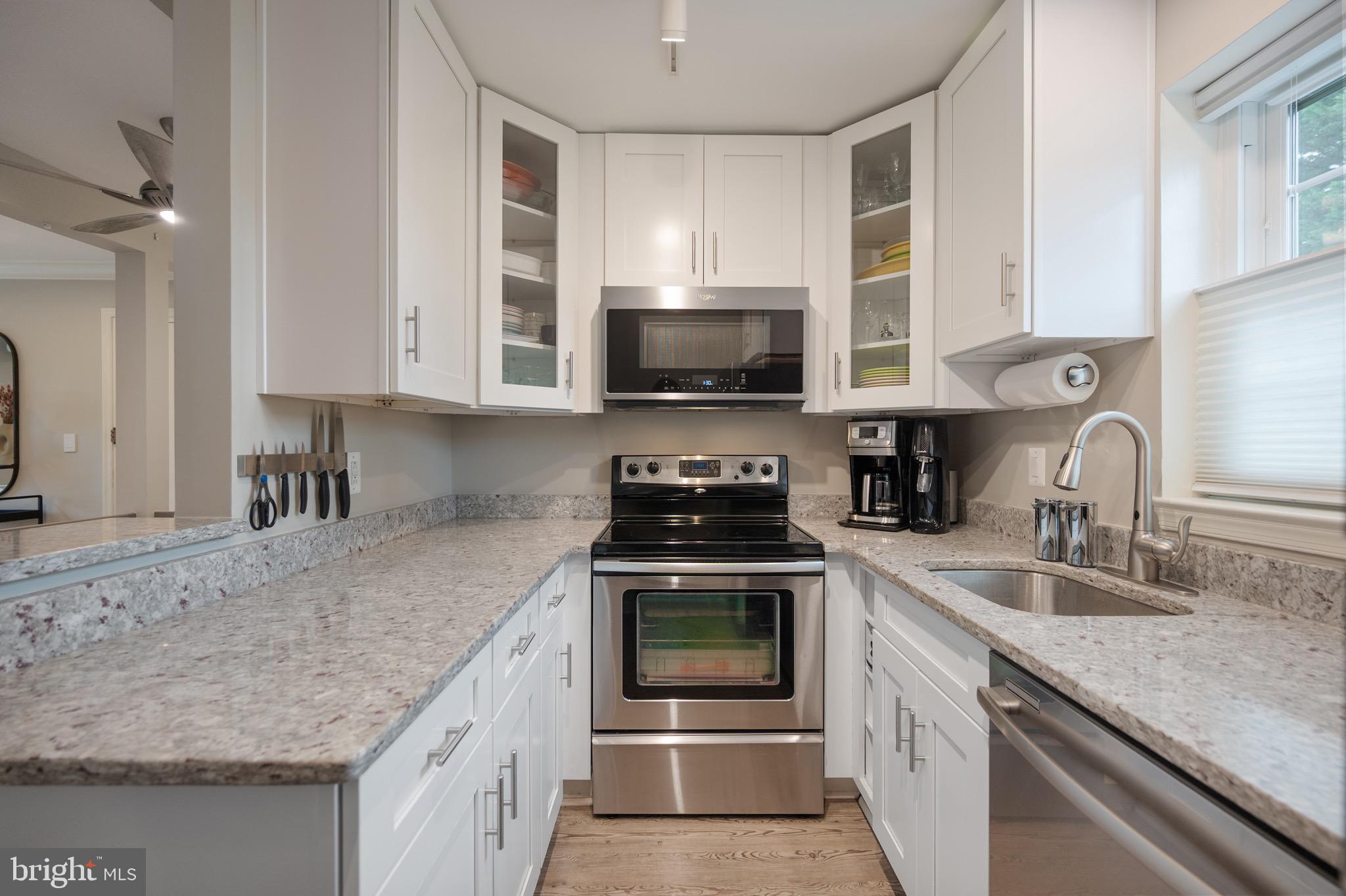 The gourmet kitchen is a chef's dream, featuring granite countertops, stainless steel appliances, and timeless white, glass-front cabinetry--perfect for keeping your culinary essentials organized and within reach.