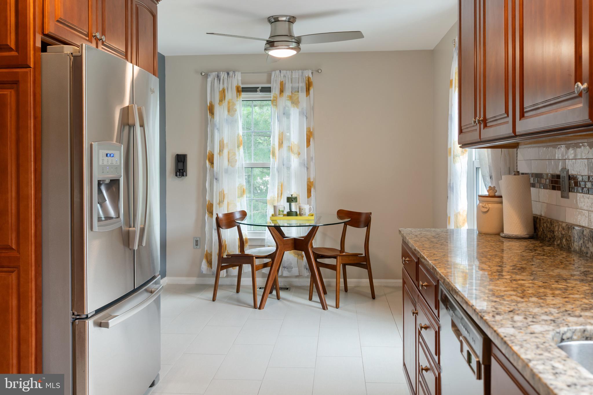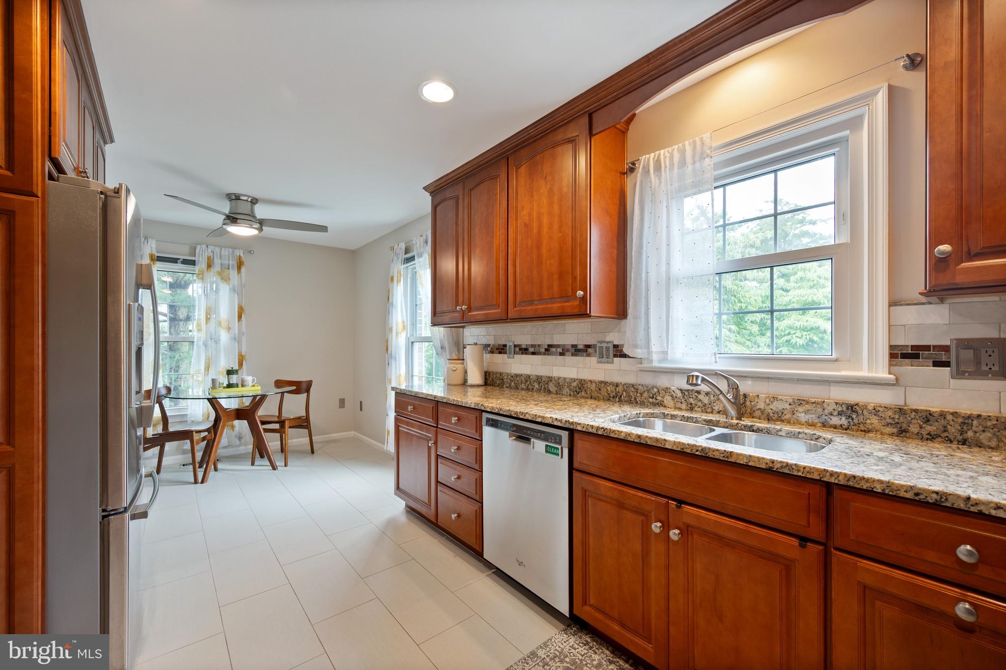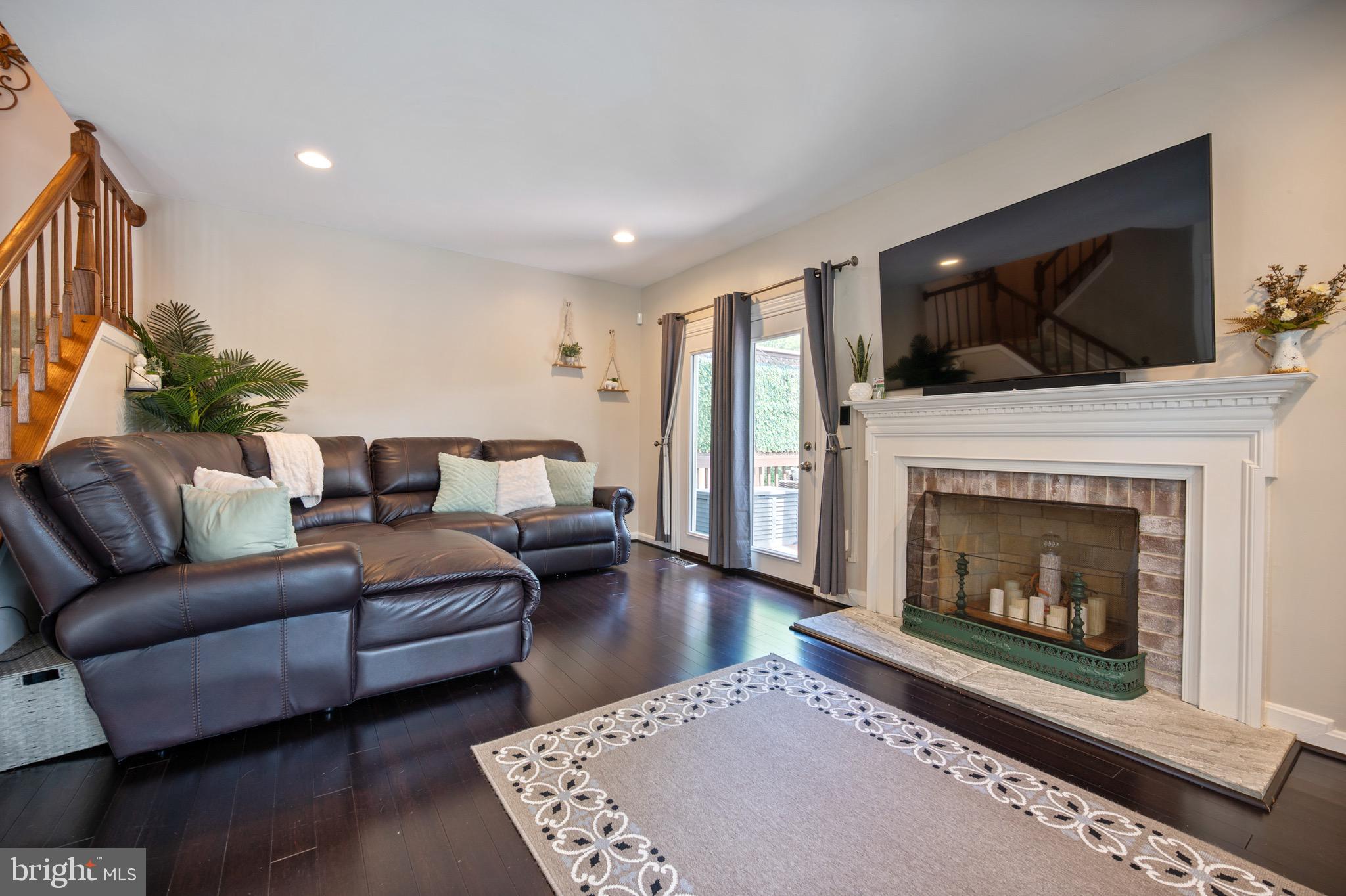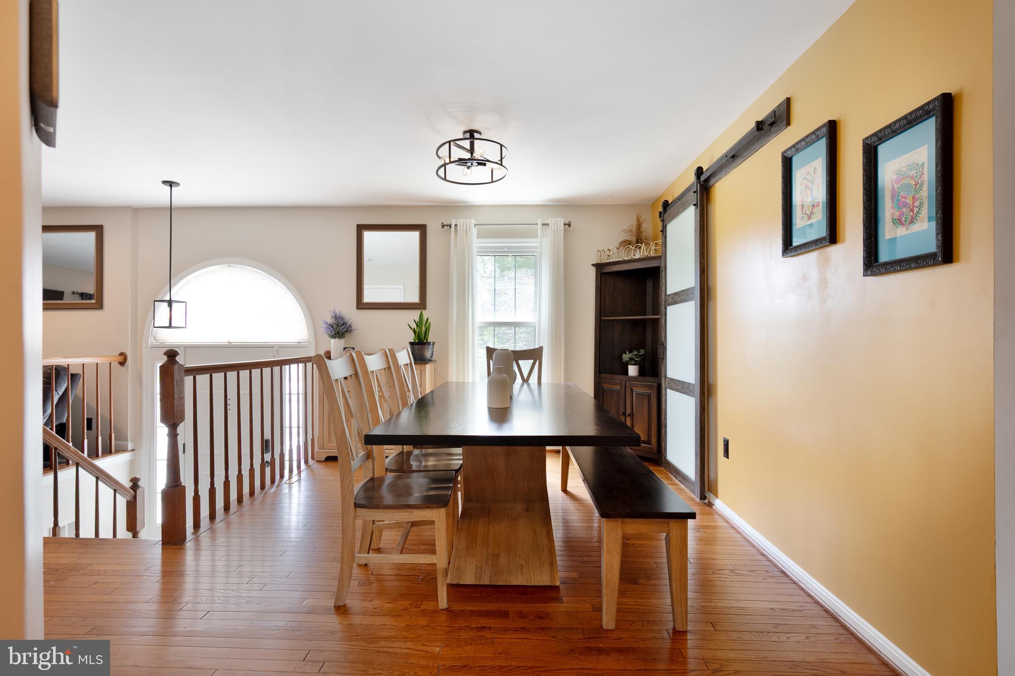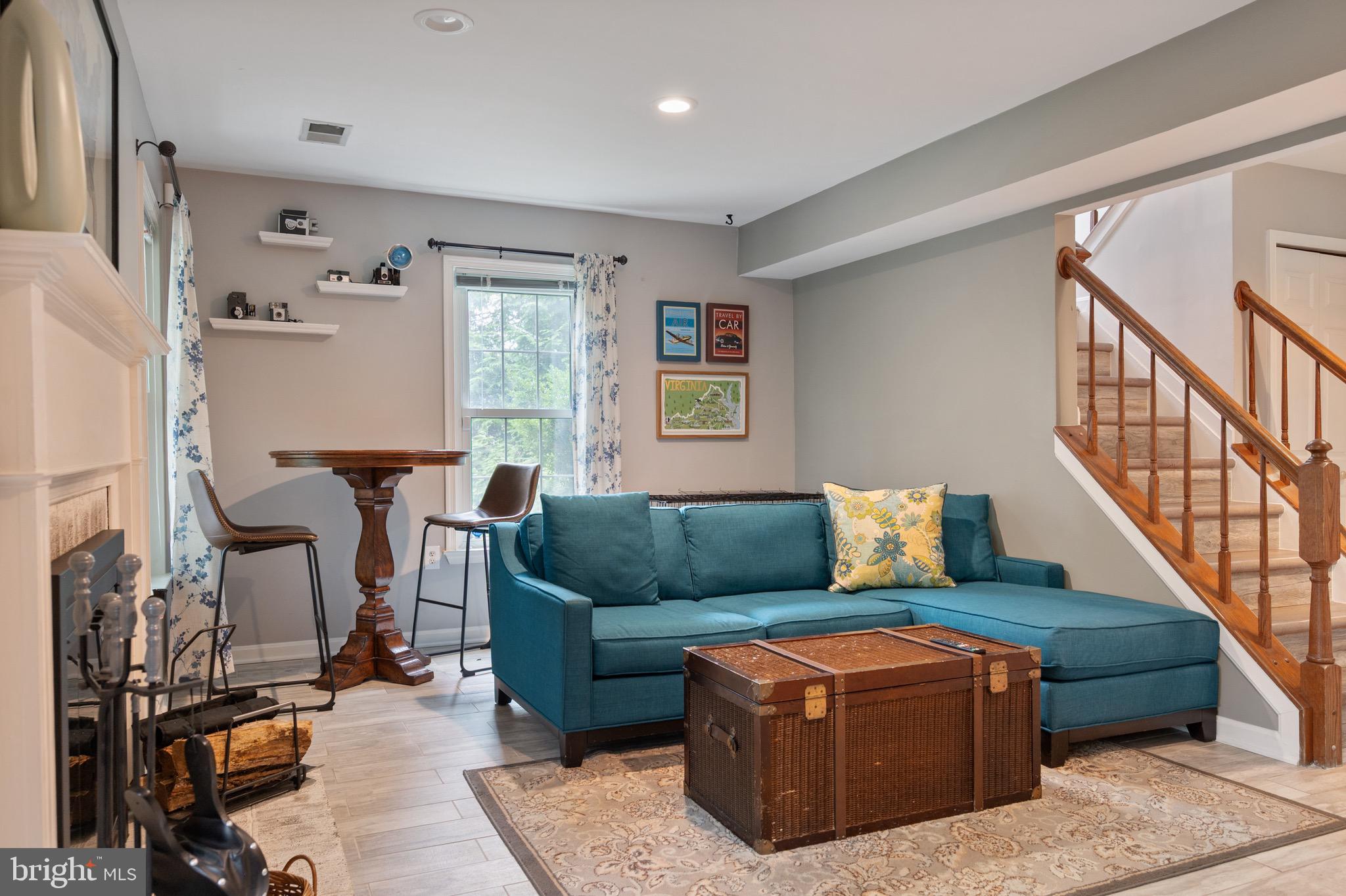 This fabulous end-unit townhouse in the sought-after Kingstowne community offers spacious and stylish living with a classic brick exterior and an ideal layout. With four bedrooms and three and a half bathrooms, the 2440 square foot home provides ample space for comfortable everyday living and entertaining. The open main-level living room features a cozy wood-burning fireplace, while the separate dining room is perfect for formal gatherings. The large, sunny eat-in kitchen boasts granite countertops, updated stainless steel appliances, and a charming opened wall with a sliding barn door, blending functionality with modern farmhouse appeal. Half bath has also been remodeled and has second sliding barn door. Upstairs, you'll find three generously sized bedrooms, including a luxurious primary suite with vaulted ceilings, complete with a spa-like bathroom and a walk-in closet. The light-filled lower level includes a fourth bedroom, a full bathroom, and a recreation room highlighted by a custom-built wet bar with wine and beverage refrigerators and a second wood-burning fireplace. Sliding glass doors open to a beautifully landscaped, fenced-in paver patio, while a spacious deck off the main level provides additional outdoor living space. Extensive updating throughout including all bathrooms have been remodeled. A one-car garage completes this exceptional property.