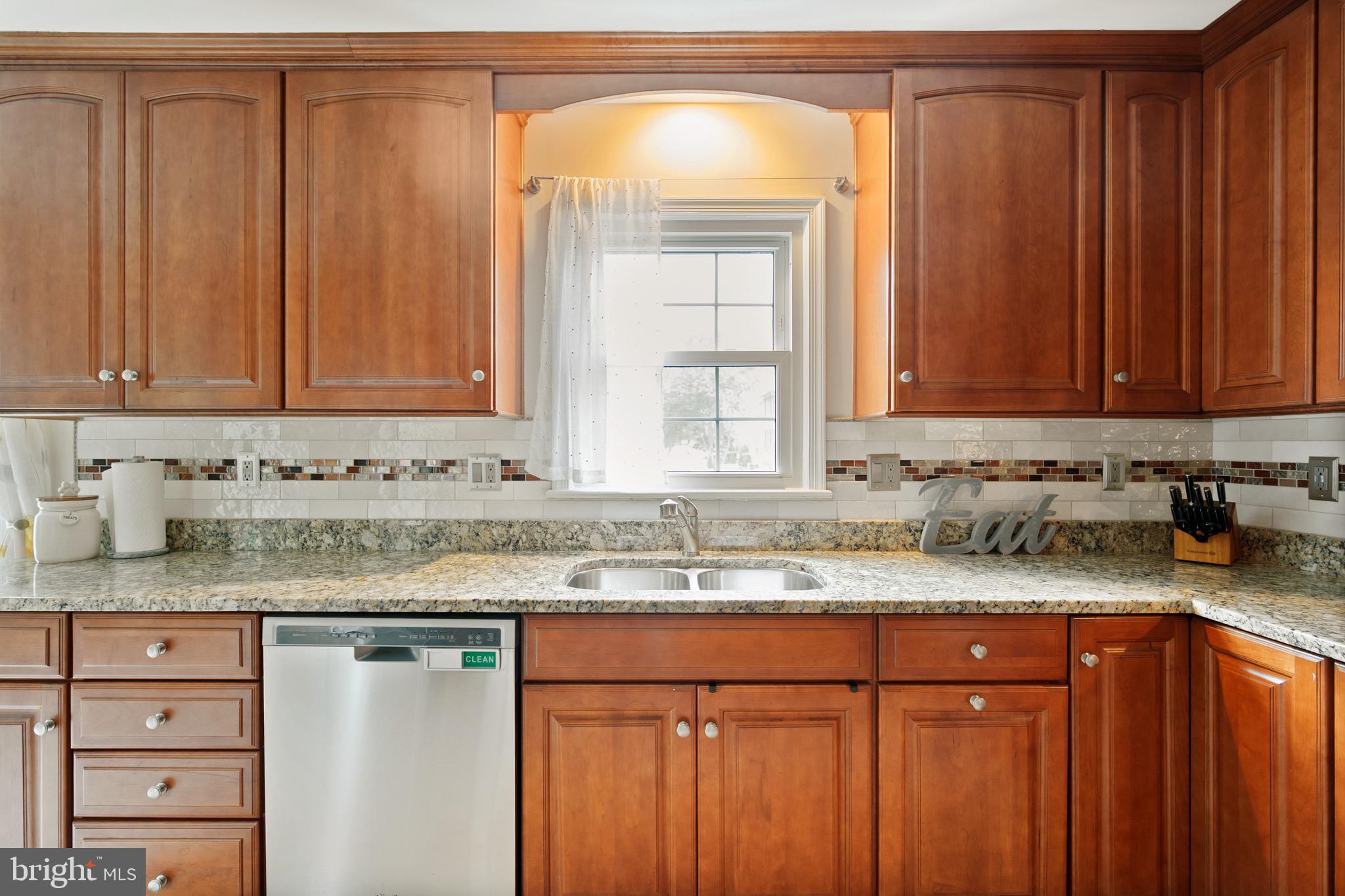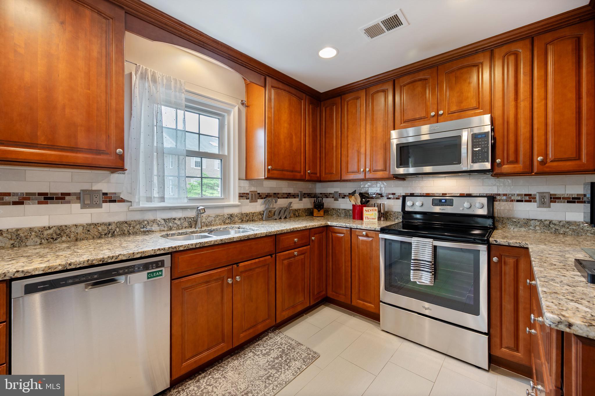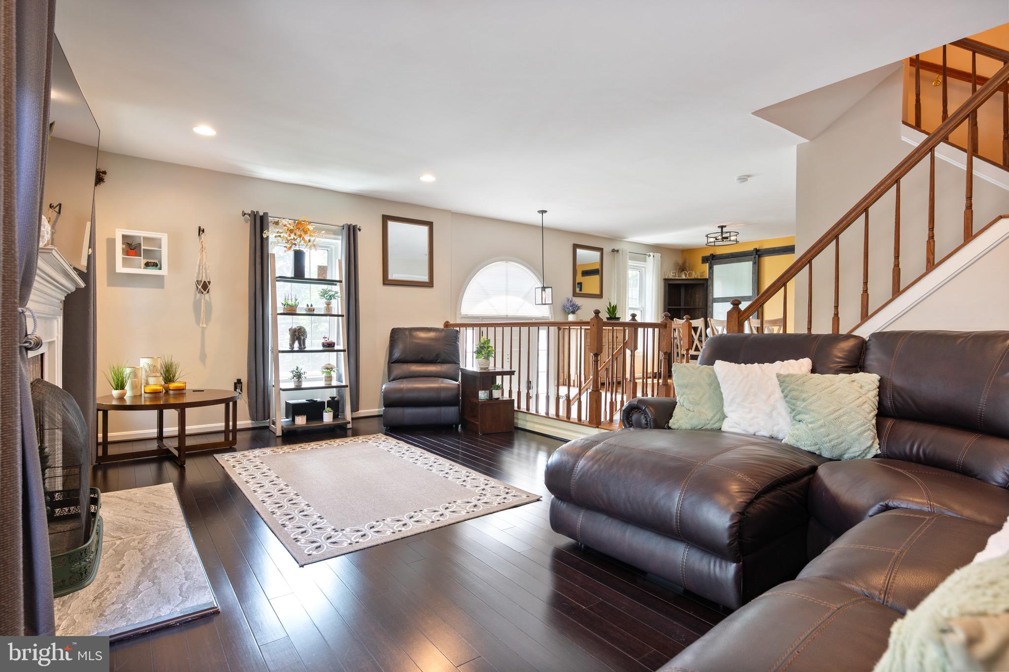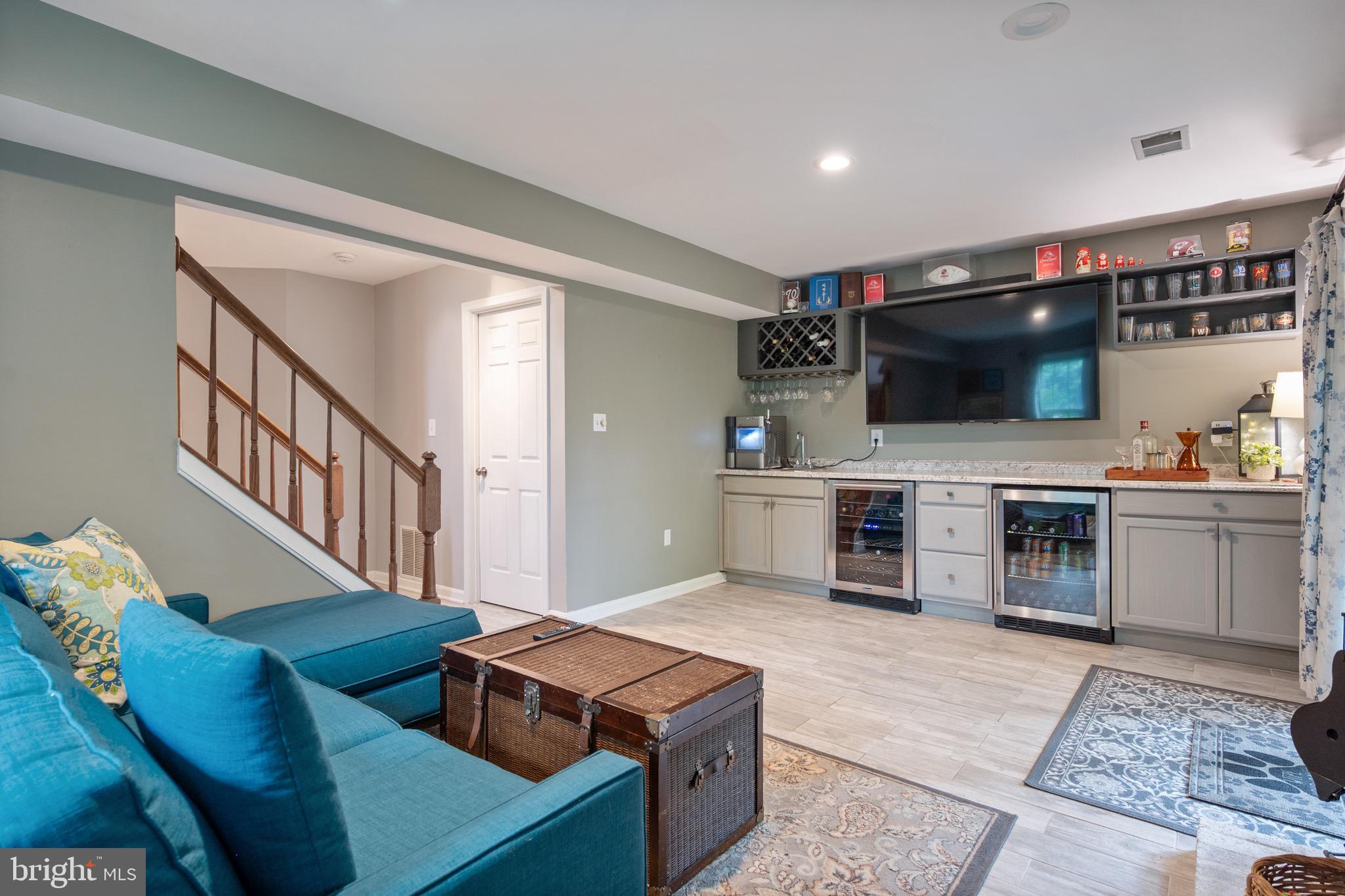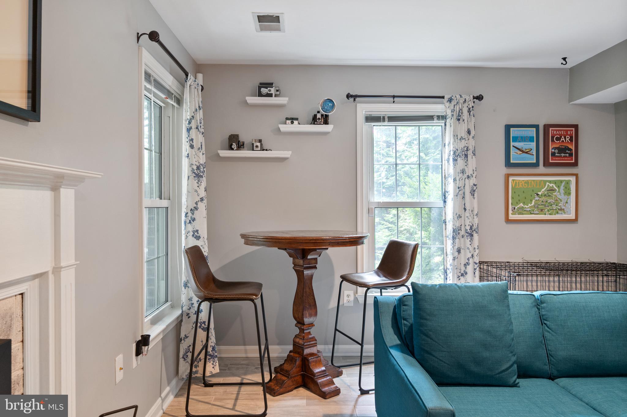 This fabulous end-unit townhouse in the sought-after Kingstowne community offers spacious and stylish living with a classic brick exterior and an ideal layout. With four bedrooms and three and a half bathrooms, the 2440 square foot home provides ample space for comfortable everyday living and entertaining. The open main-level living room features a cozy wood-burning fireplace, while the separate dining room is perfect for formal gatherings. The large, sunny eat-in kitchen boasts granite countertops, updated stainless steel appliances, and a charming opened wall with a sliding barn door, blending functionality with modern farmhouse appeal. Half bath has also been remodeled and has second sliding barn door. Upstairs, you'll find three generously sized bedrooms, including a luxurious primary suite with vaulted ceilings, complete with a spa-like bathroom and a walk-in closet. The light-filled lower level includes a fourth bedroom, a full bathroom, and a recreation room highlighted by a custom-built wet bar with wine and beverage refrigerators and a second wood-burning fireplace. Sliding glass doors open to a beautifully landscaped, fenced-in paver patio, while a spacious deck off the main level provides additional outdoor living space. Extensive updating throughout including all bathrooms have been remodeled. A one-car garage completes this exceptional property.