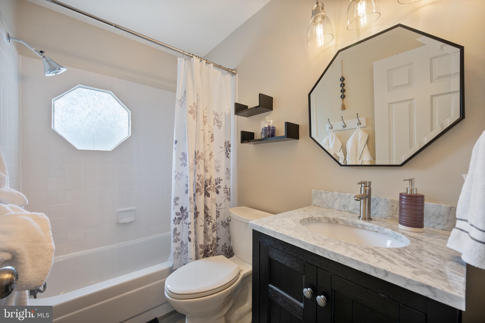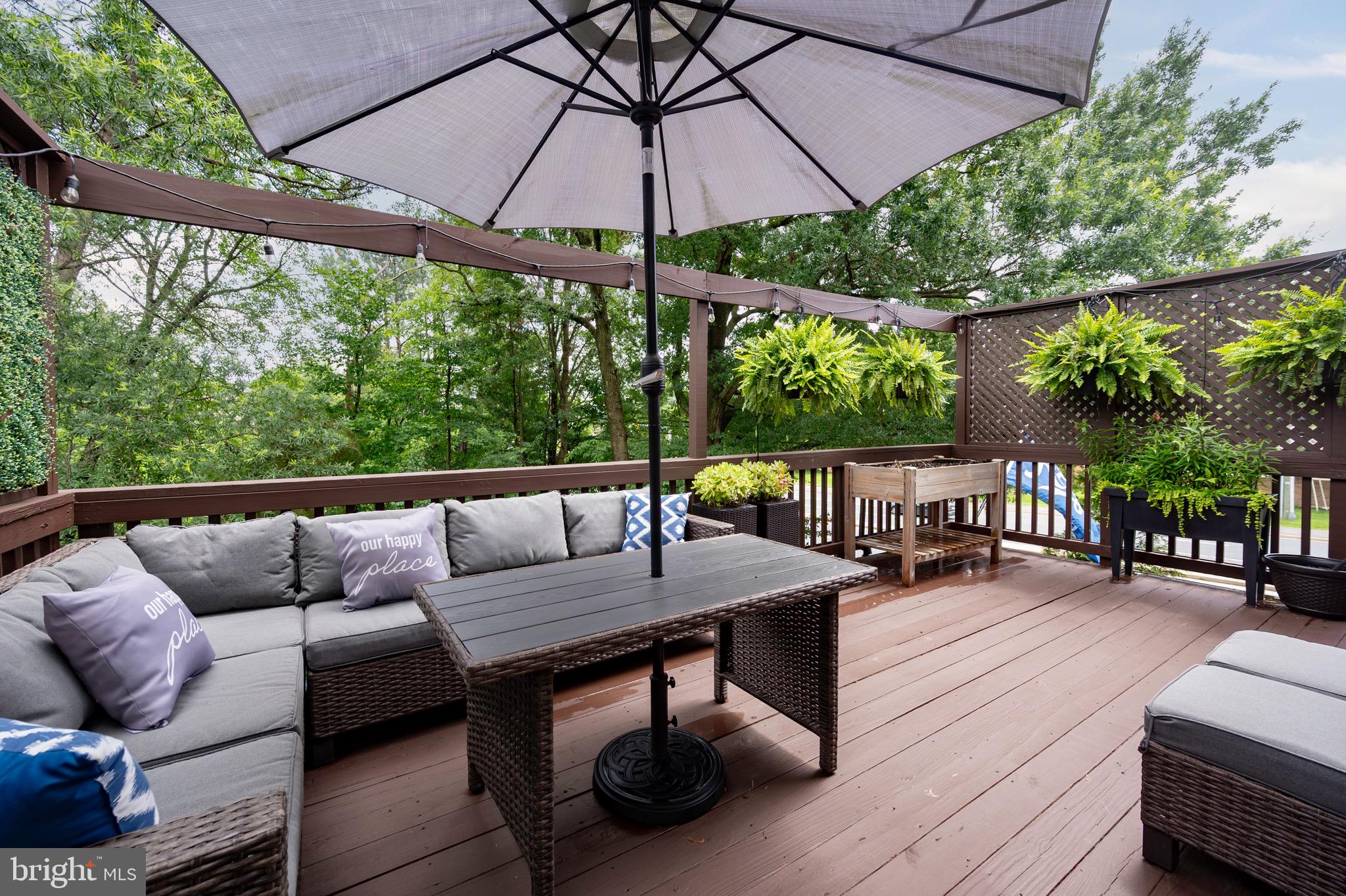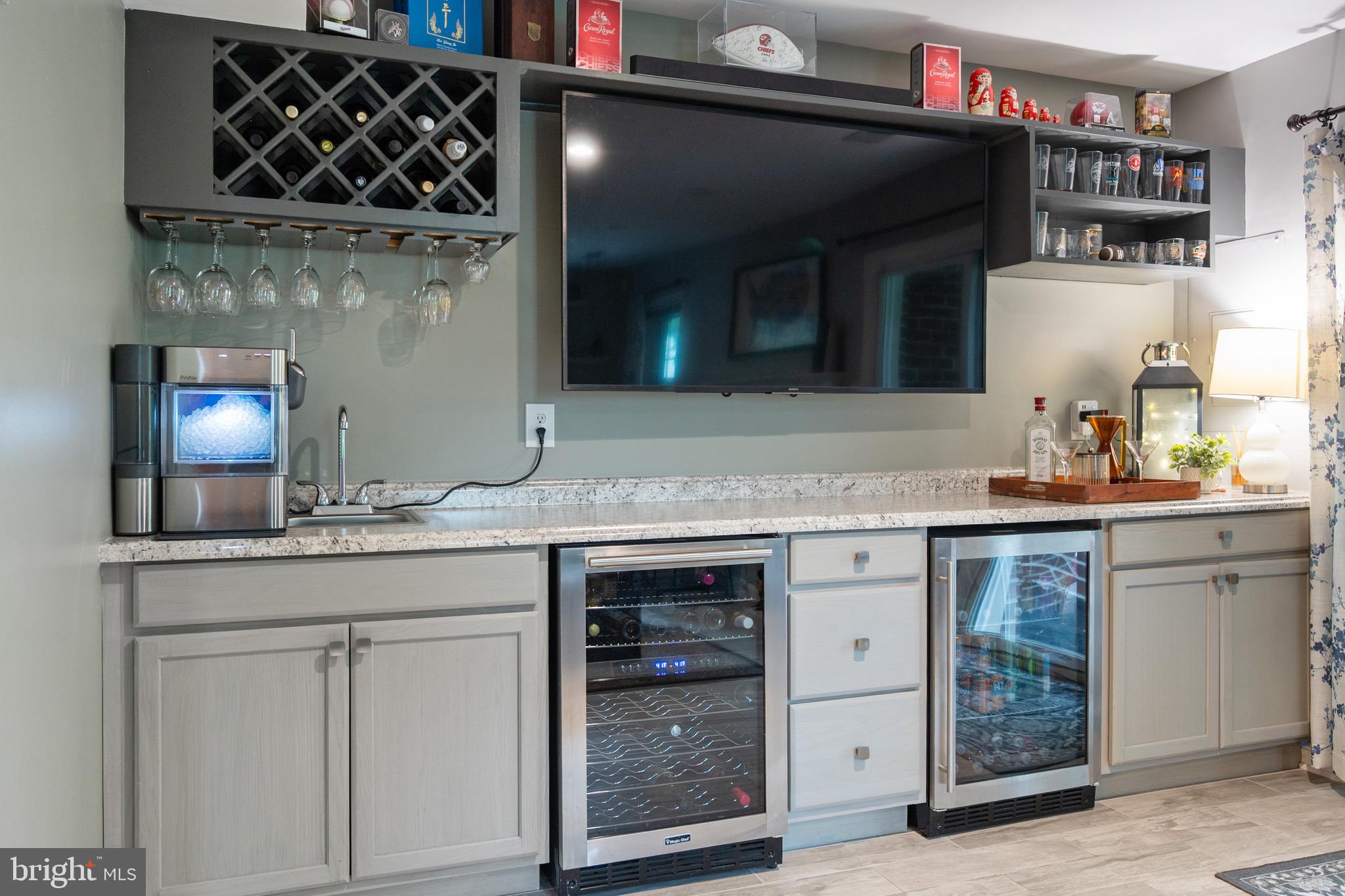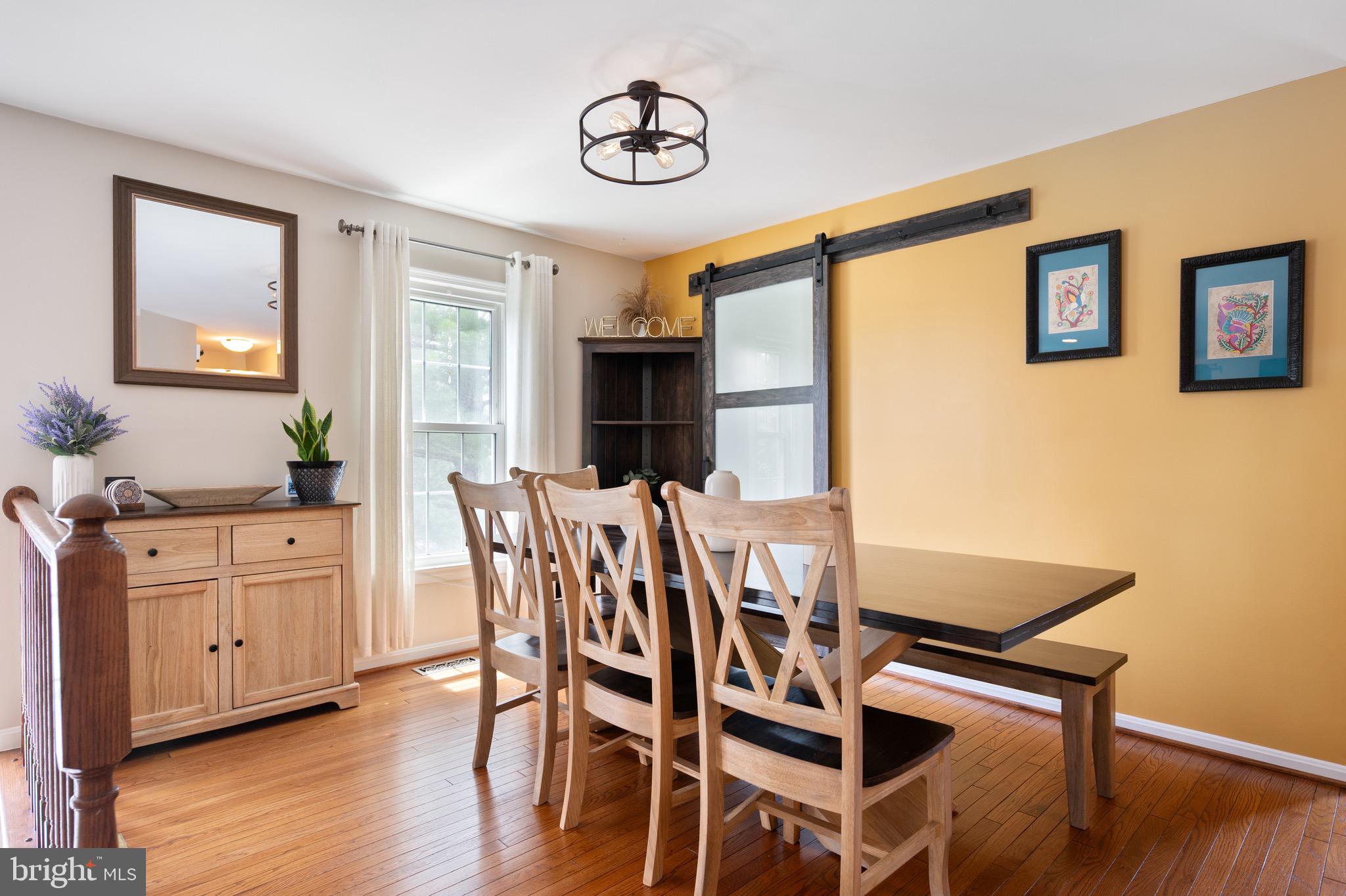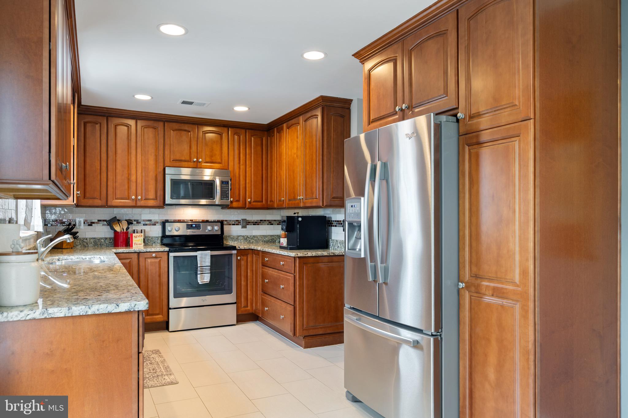 This fabulous end-unit townhouse in the sought-after Kingstowne community offers spacious and stylish living with a classic brick exterior and an ideal layout. With four bedrooms and three and a half bathrooms, the 2440 square foot home provides ample space for comfortable everyday living and entertaining. The open main-level living room features a cozy wood-burning fireplace, while the separate dining room is perfect for formal gatherings. The large, sunny eat-in kitchen boasts granite countertops, updated stainless steel appliances, and a charming opened wall with a sliding barn door, blending functionality with modern farmhouse appeal. Half bath has also been remodeled and has second sliding barn door. Upstairs, you'll find three generously sized bedrooms, including a luxurious primary suite with vaulted ceilings, complete with a spa-like bathroom and a walk-in closet. The light-filled lower level includes a fourth bedroom, a full bathroom, and a recreation room highlighted by a custom-built wet bar with wine and beverage refrigerators and a second wood-burning fireplace. Sliding glass doors open to a beautifully landscaped, fenced-in paver patio, while a spacious deck off the main level provides additional outdoor living space. Extensive updating throughout including all bathrooms have been remodeled. A one-car garage completes this exceptional property.