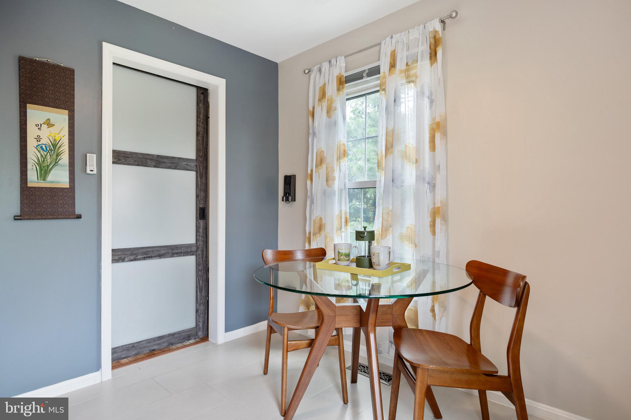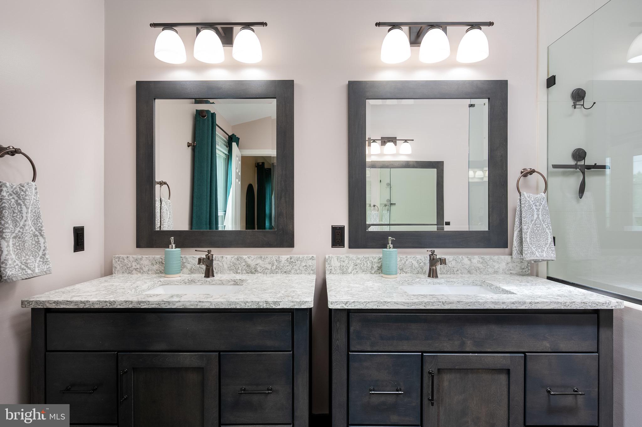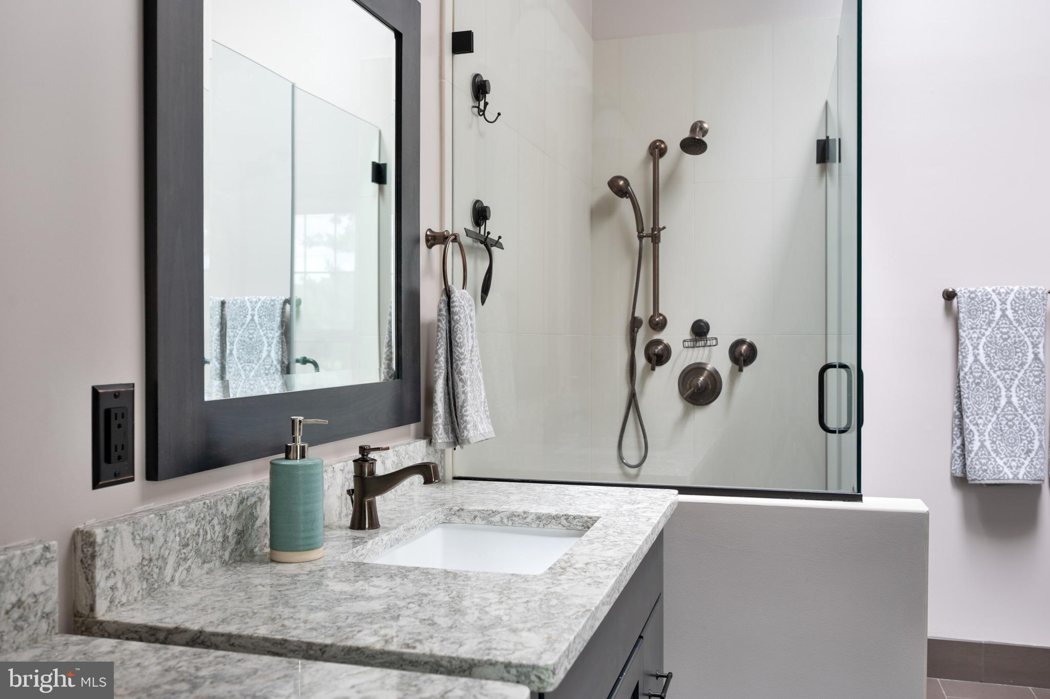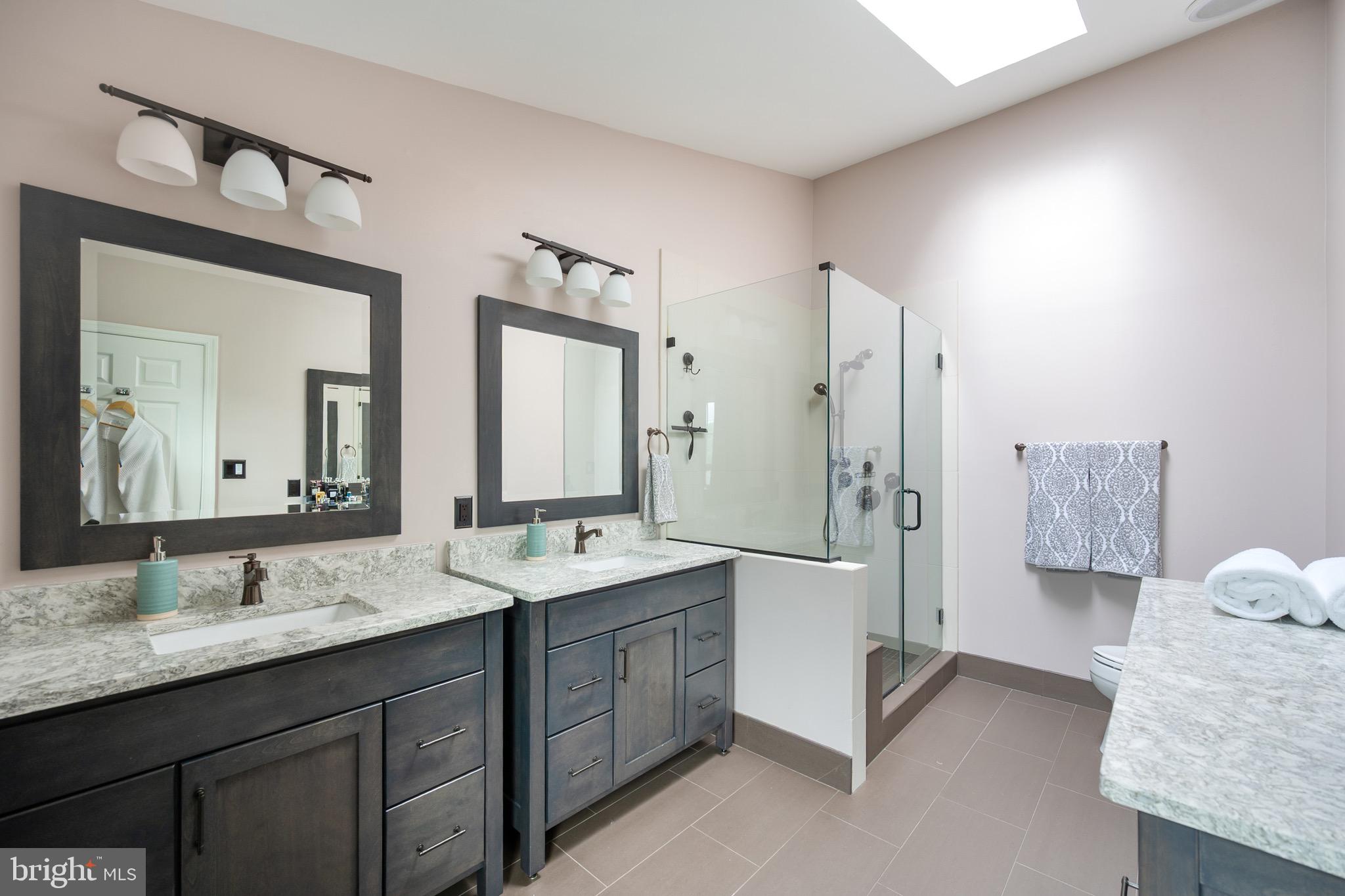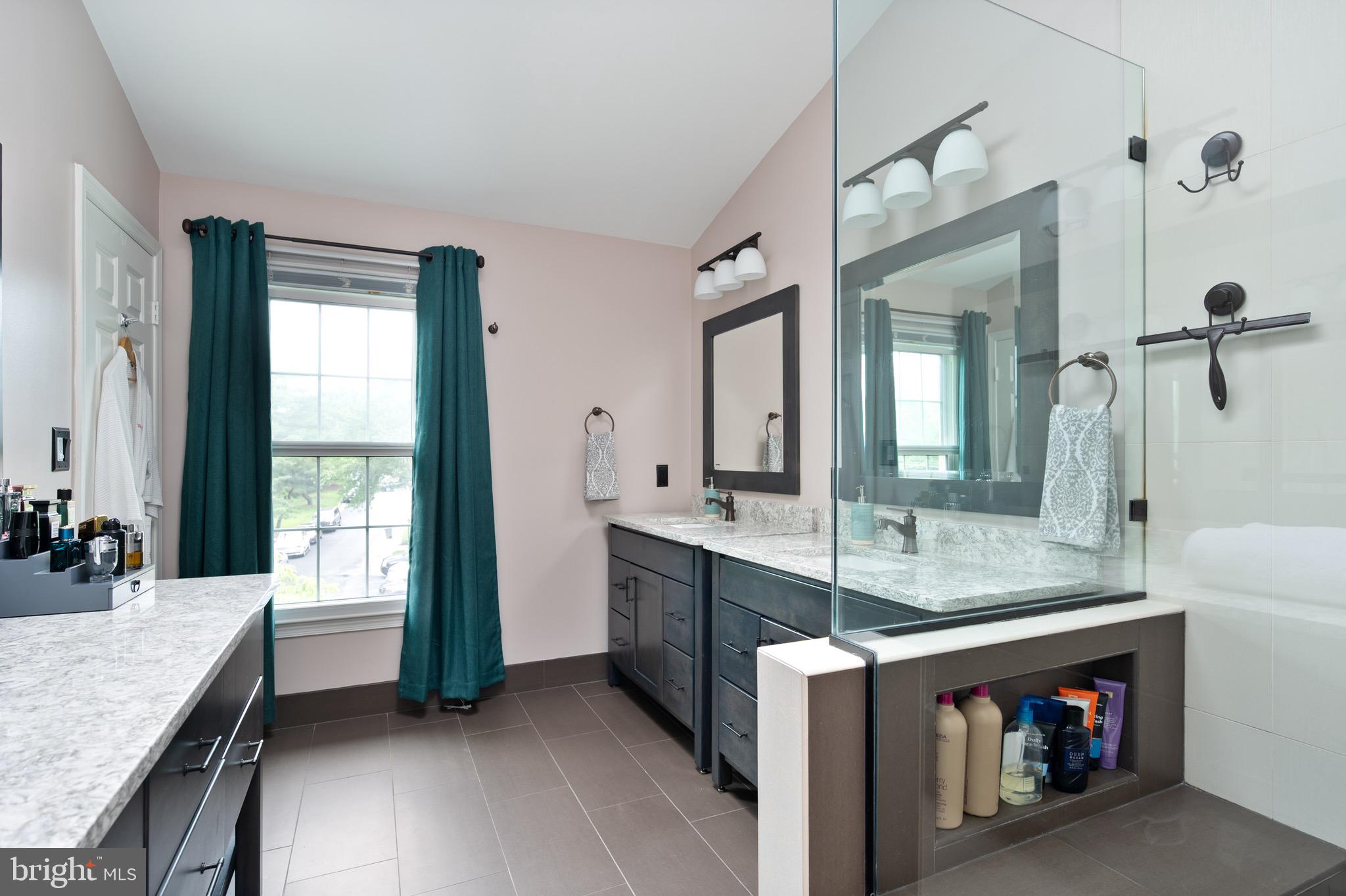 This fabulous end-unit townhouse in the sought-after Kingstowne community offers spacious and stylish living with a classic brick exterior and an ideal layout. With four bedrooms and three and a half bathrooms, the 2440 square foot home provides ample space for comfortable everyday living and entertaining. The open main-level living room features a cozy wood-burning fireplace, while the separate dining room is perfect for formal gatherings. The large, sunny eat-in kitchen boasts granite countertops, updated stainless steel appliances, and a charming opened wall with a sliding barn door, blending functionality with modern farmhouse appeal. Half bath has also been remodeled and has second sliding barn door. Upstairs, you'll find three generously sized bedrooms, including a luxurious primary suite with vaulted ceilings, complete with a spa-like bathroom and a walk-in closet. The light-filled lower level includes a fourth bedroom, a full bathroom, and a recreation room highlighted by a custom-built wet bar with wine and beverage refrigerators and a second wood-burning fireplace. Sliding glass doors open to a beautifully landscaped, fenced-in paver patio, while a spacious deck off the main level provides additional outdoor living space. Extensive updating throughout including all bathrooms have been remodeled. A one-car garage completes this exceptional property.
