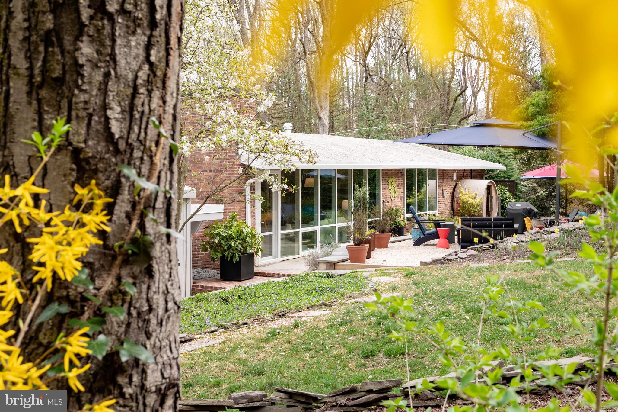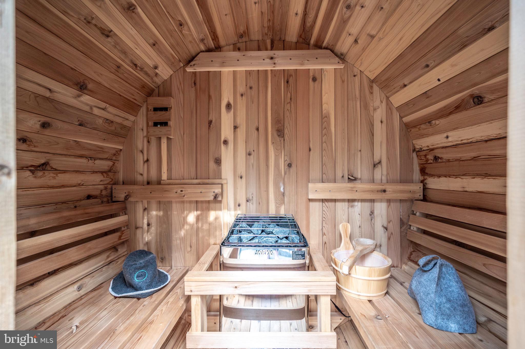 A charming dining room area is enhanced by a Nelson bubble lamp, creating a stylish and inviting space for meals. Custom window coverings are installed throughout, ensuring a cohesive and refined aesthetic. Outside, the home offers extensive hardscaping and landscaping, featuring various patios and mature plantings designed with privacy in mind. A new sauna with a heater is an added luxury.