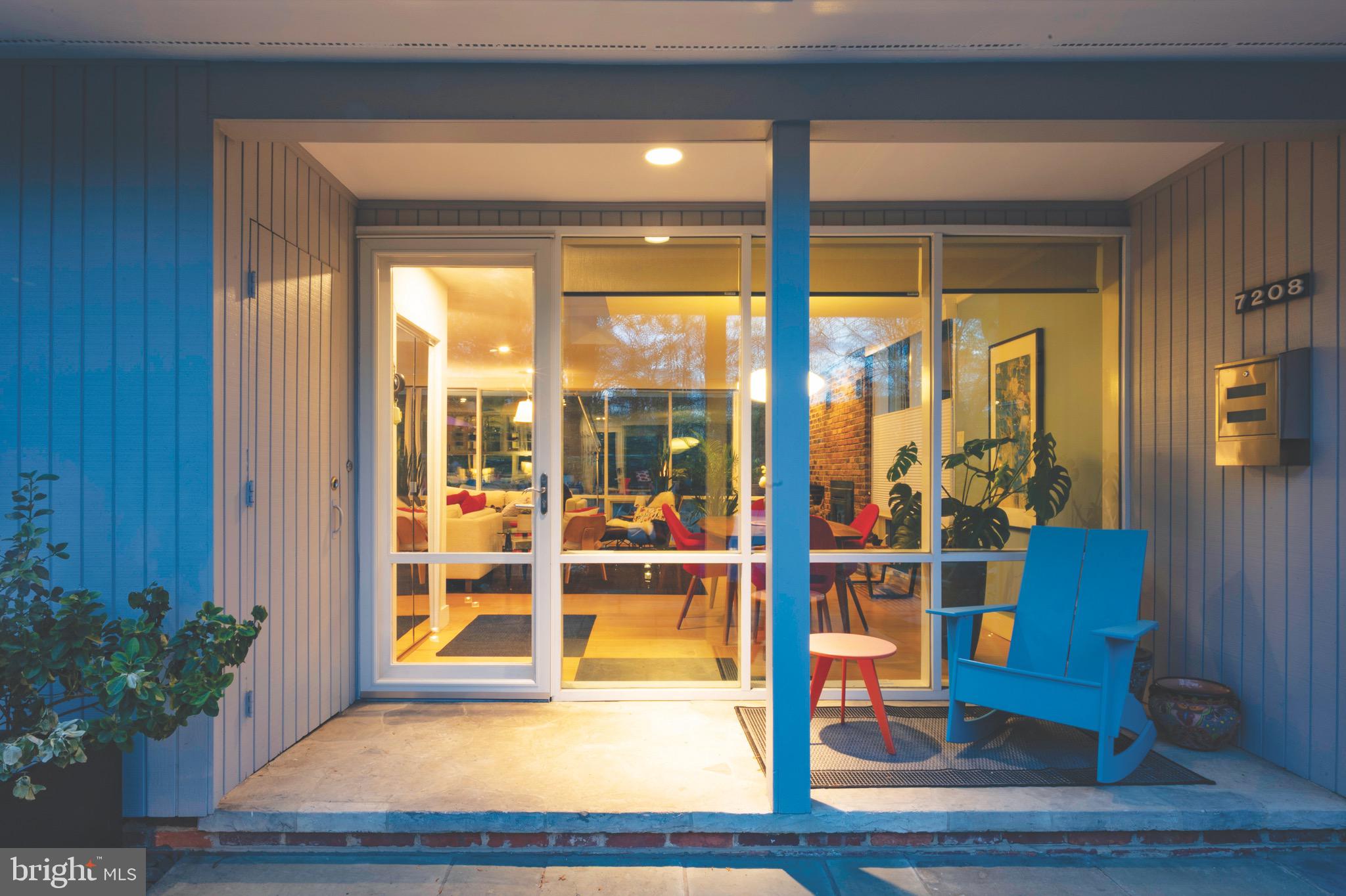 This stunning Mid-Century Modern home, located in the sought-after Hollin Hills neighborhood, was designed by renowned architect Charles Goodman. Offering one-level living at its finest, the home features three spacious bedrooms and two full bathrooms, with floor-to-ceiling windows throughout that bring in abundant natural light. The open living room is highlighted by skylights, recessed lighting, and a full wall of brick with a wood-burning insert fireplace, creating a warm and inviting atmosphere. A wall of built-in shelves neatly houses the TV, adding dramatic focal point.
