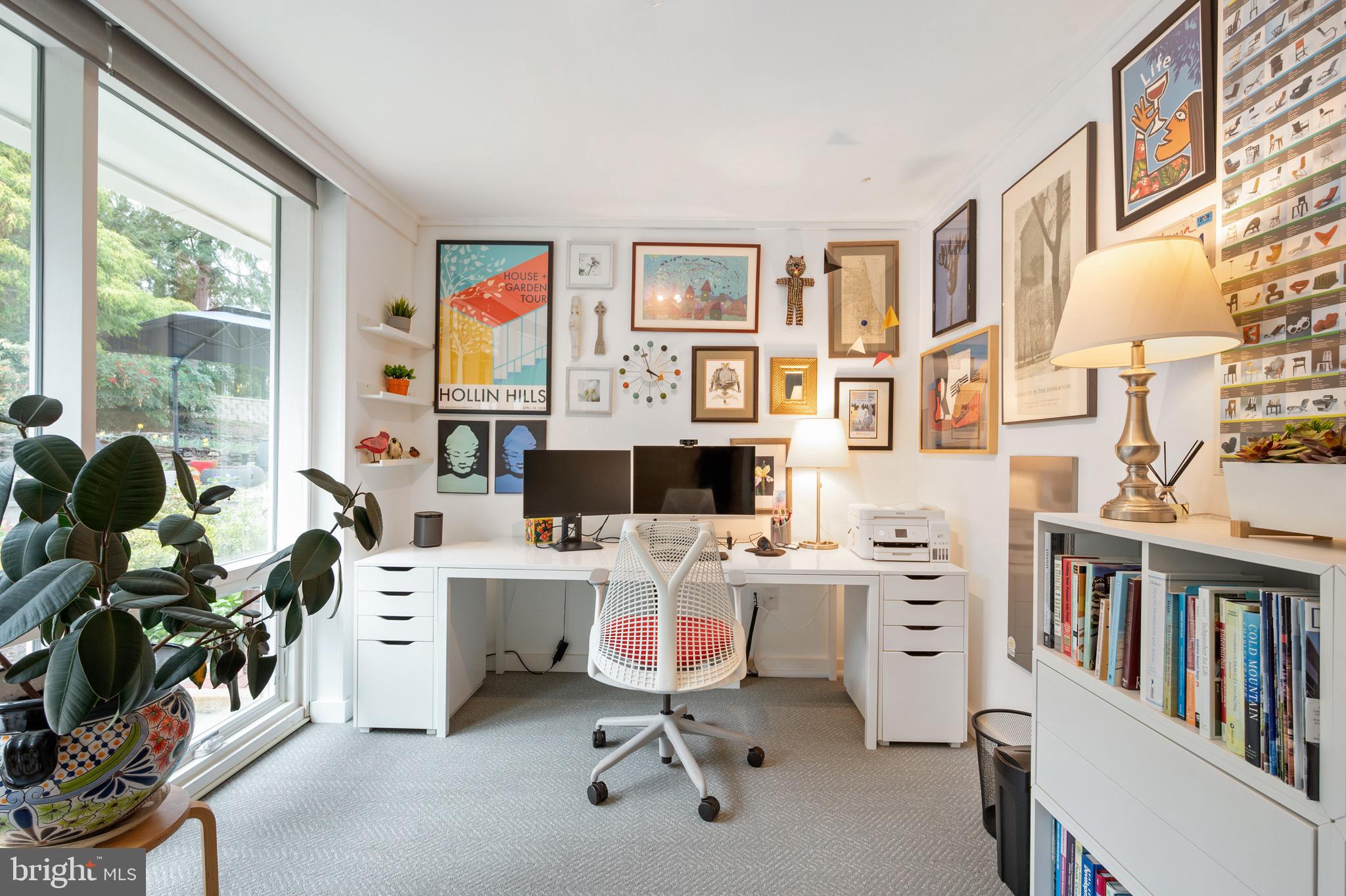 The primary suite includes an en-suite remodeled bathroom and remote-controlled custom shades for added comfort and privacy. The second large bedroom, currently being used as the primary suite, offers two closets and custom remote-controlled shades. Flor brand carpet tiles in two of the bedrooms, chosen specifically from the Hollin Hills series. Third light-filled bedroom is currently home office. Custom closets throughout.