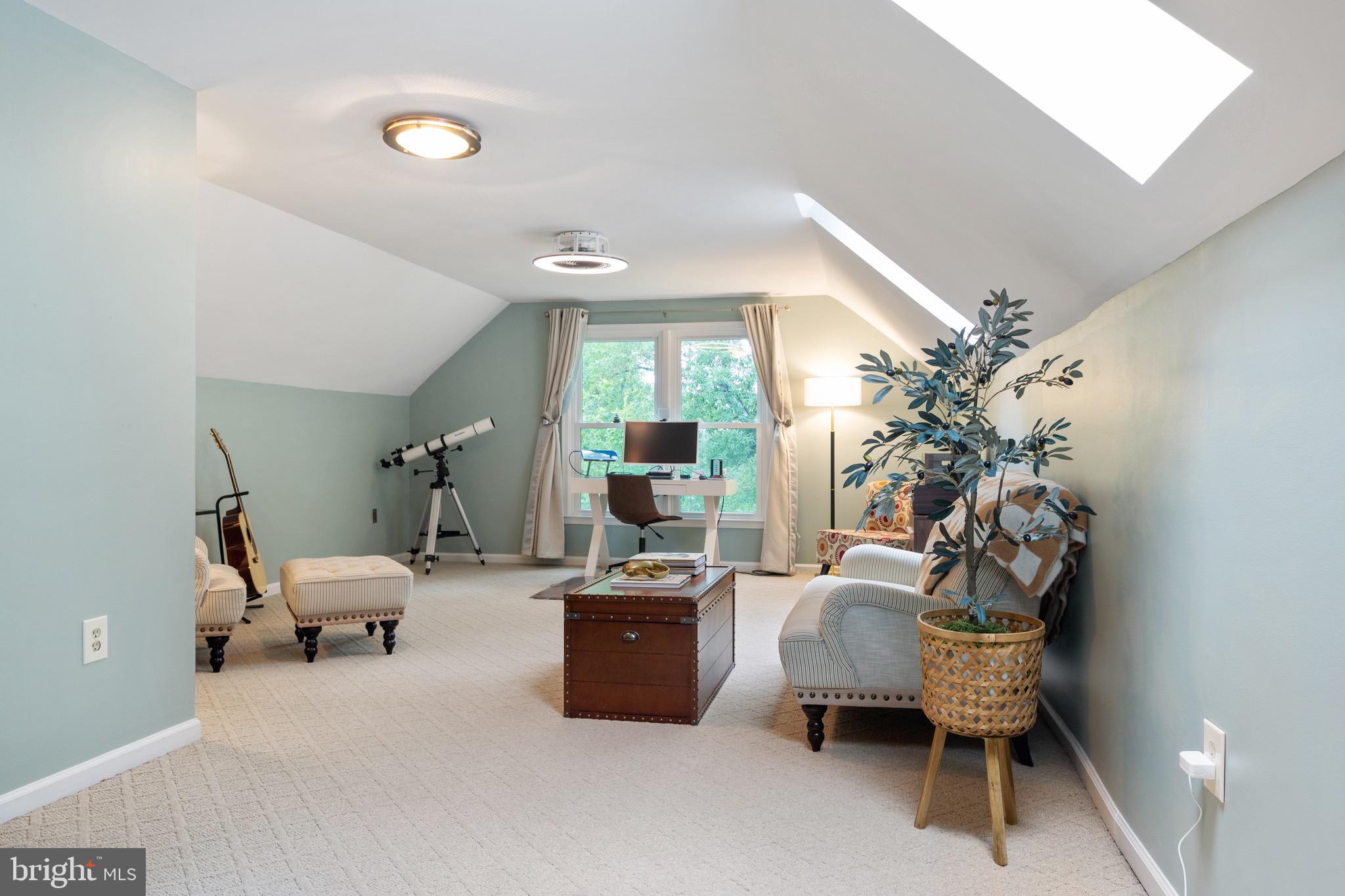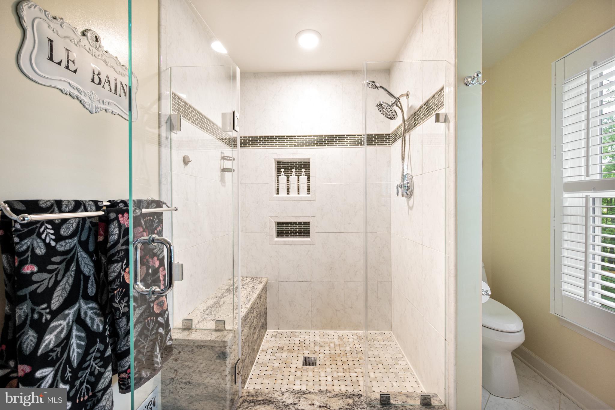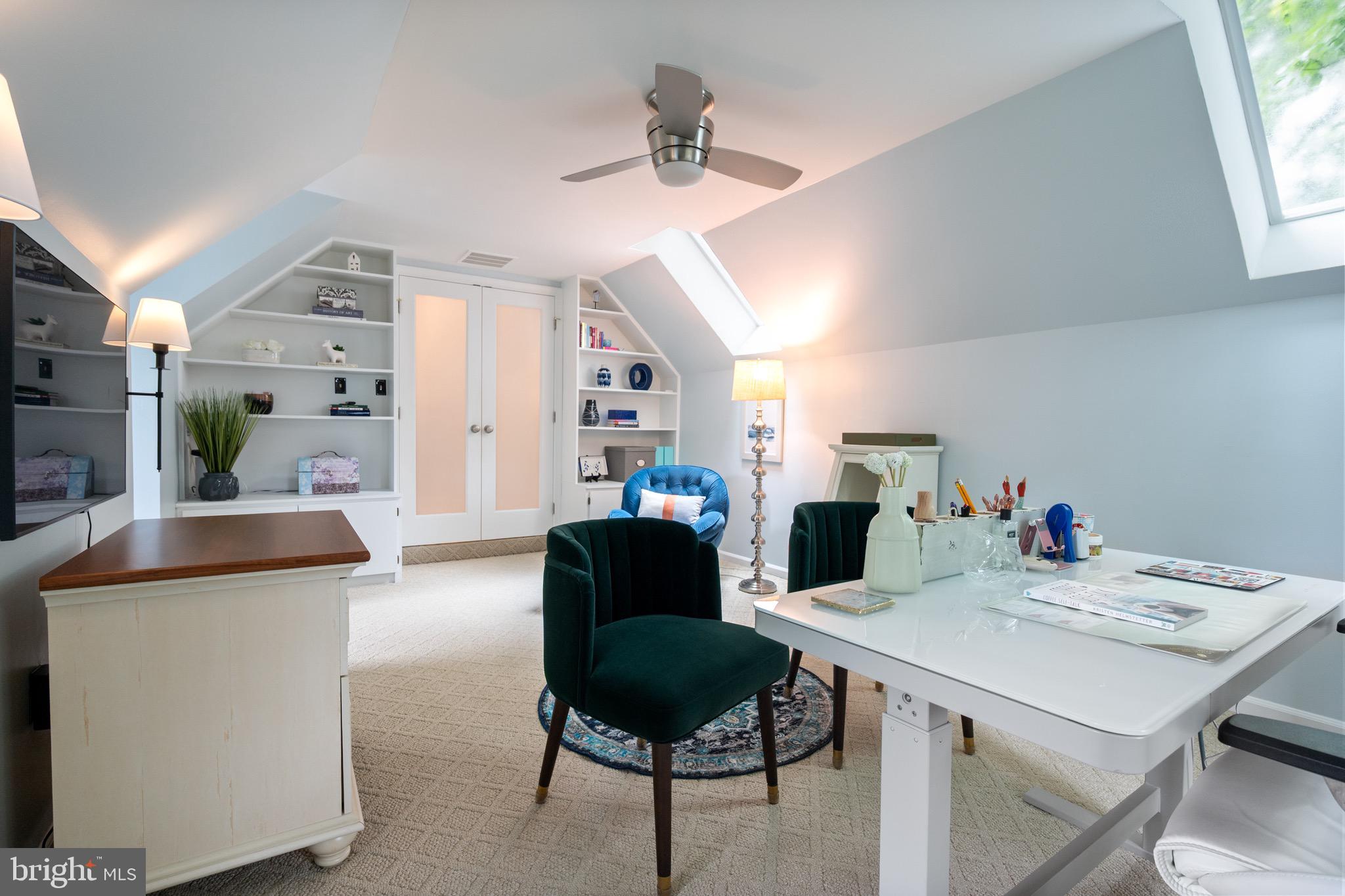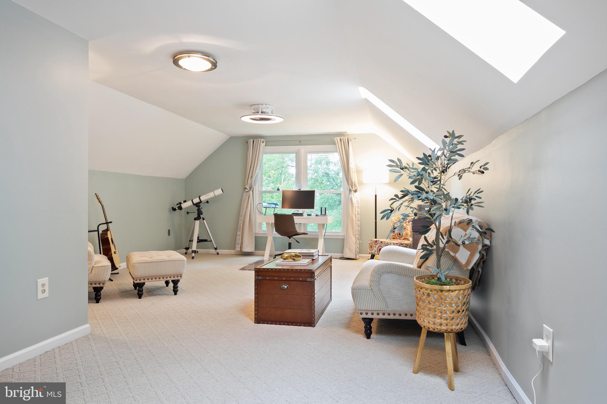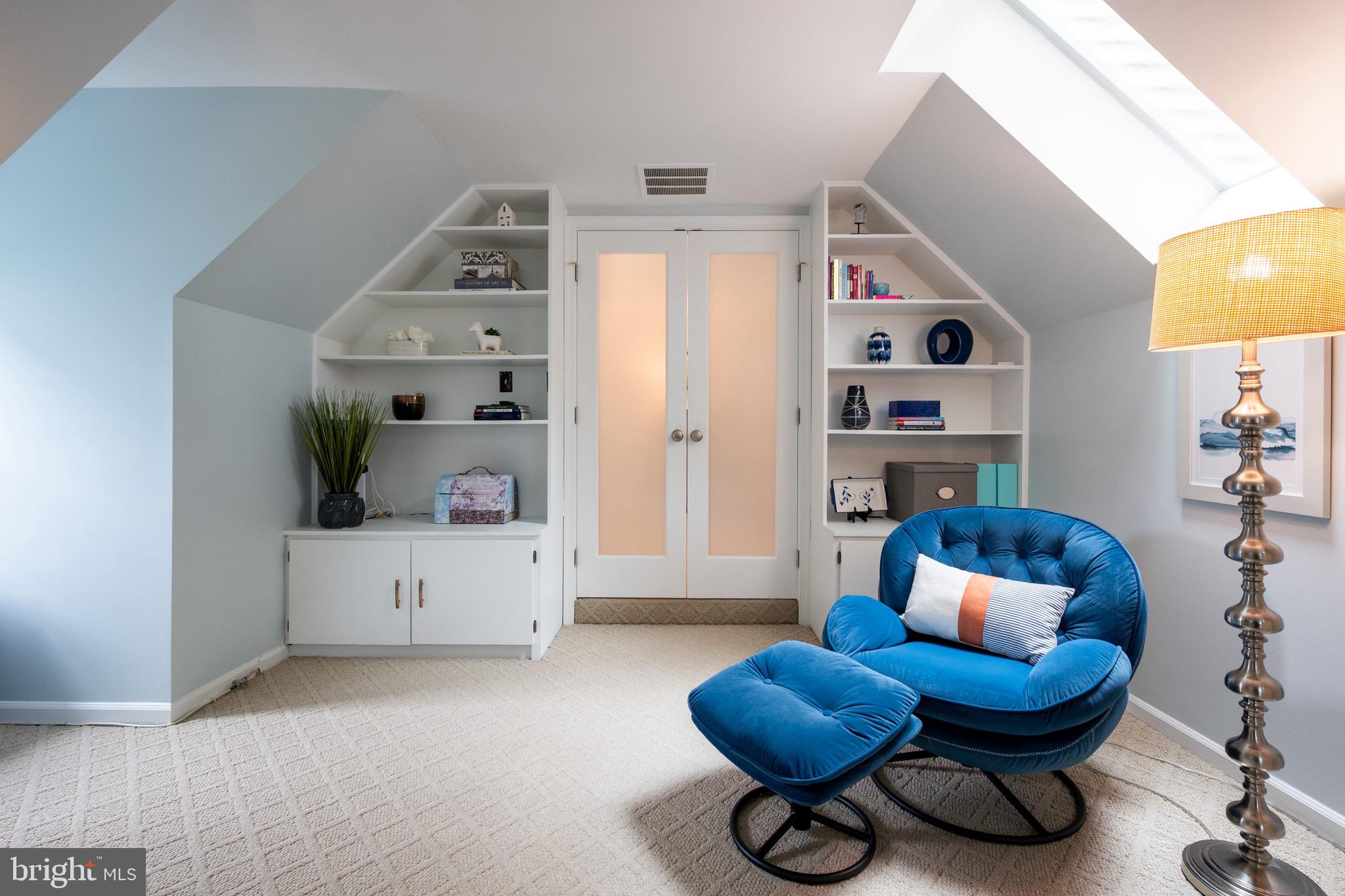 A finished laundry and mudroom with utility sink offers custom nooks for coats and shoe storage, adding to the home's thoughtful design. The upper level features four spacious bedrooms, including a luxurious primary suite with a walk-in closet upgraded with a custom shelving system. The fully renovated primary bathroom includes premium tile work, a frameless glass shower enclosure, and a double vanity with custom cabinetry. French doors from the primary suite lead to a spacious home office or sitting room, highlighted by custom bookshelves and skylights. A walk-through library connects to a staircase leading to the third level, which includes a fifth bedroom and a large recreation room boasting two skylights and a breathtaking lake view.