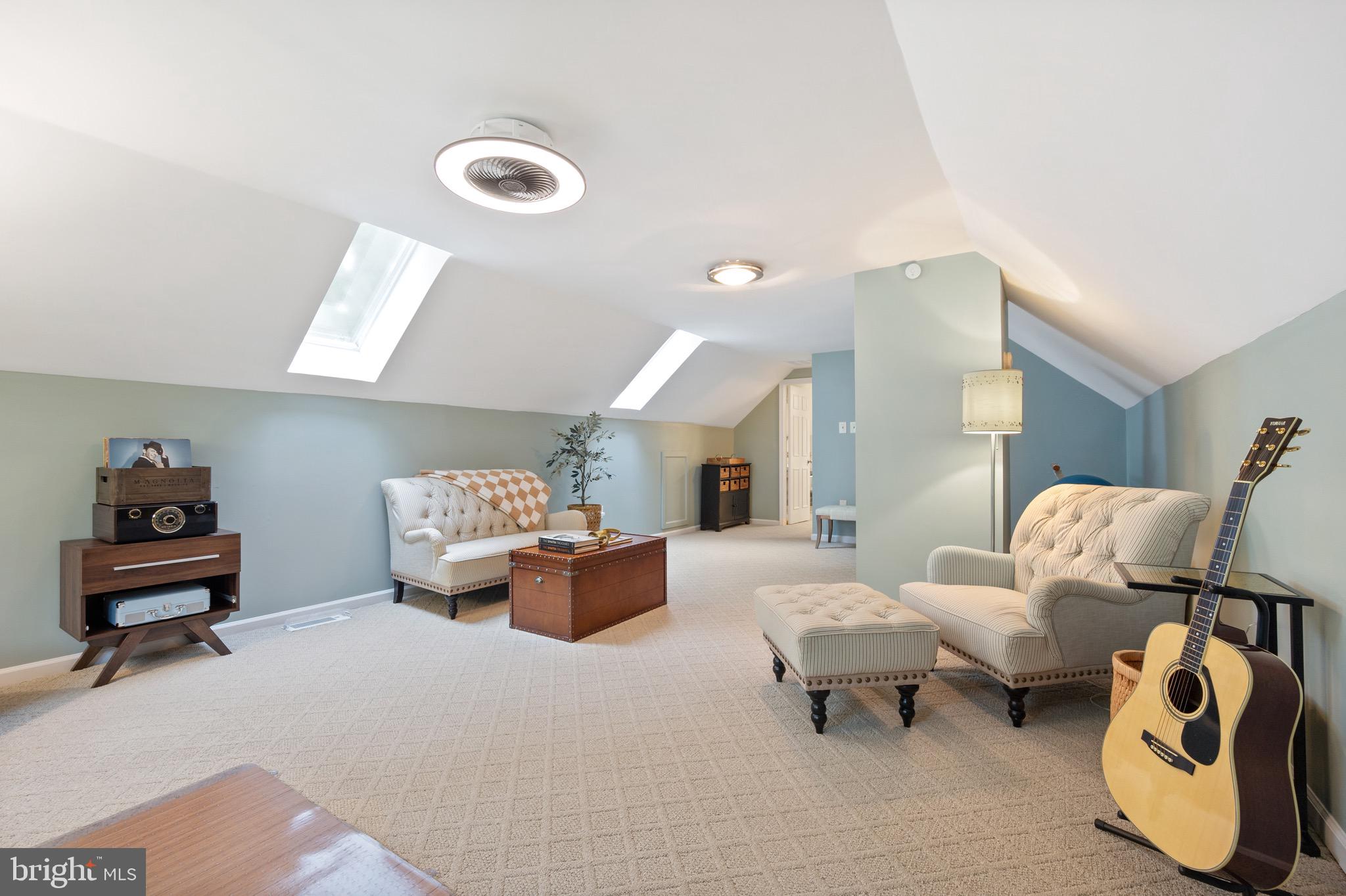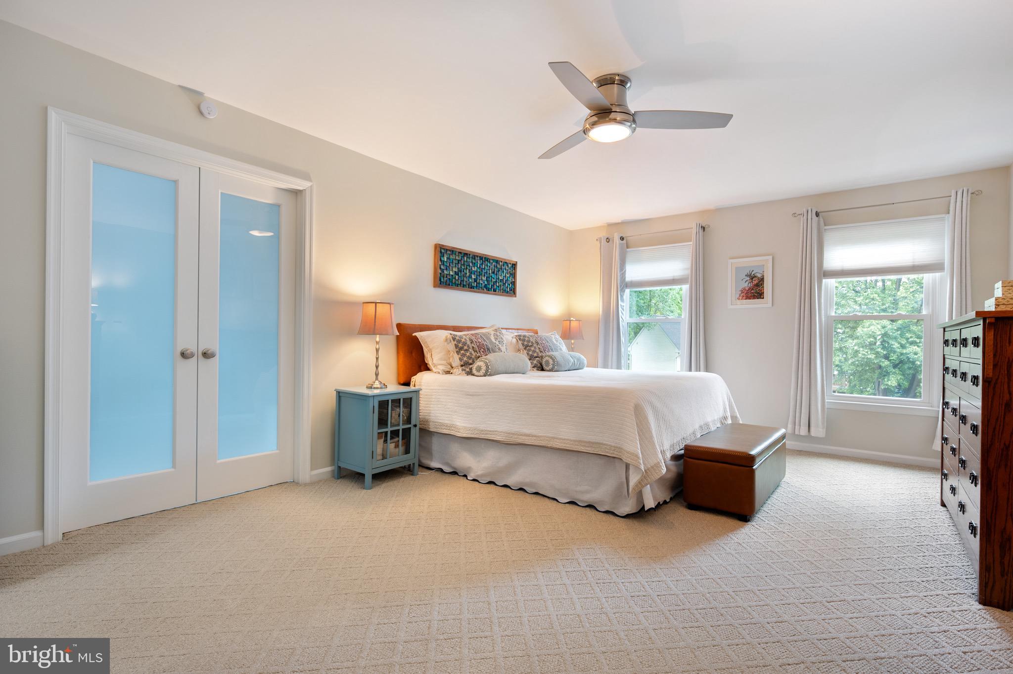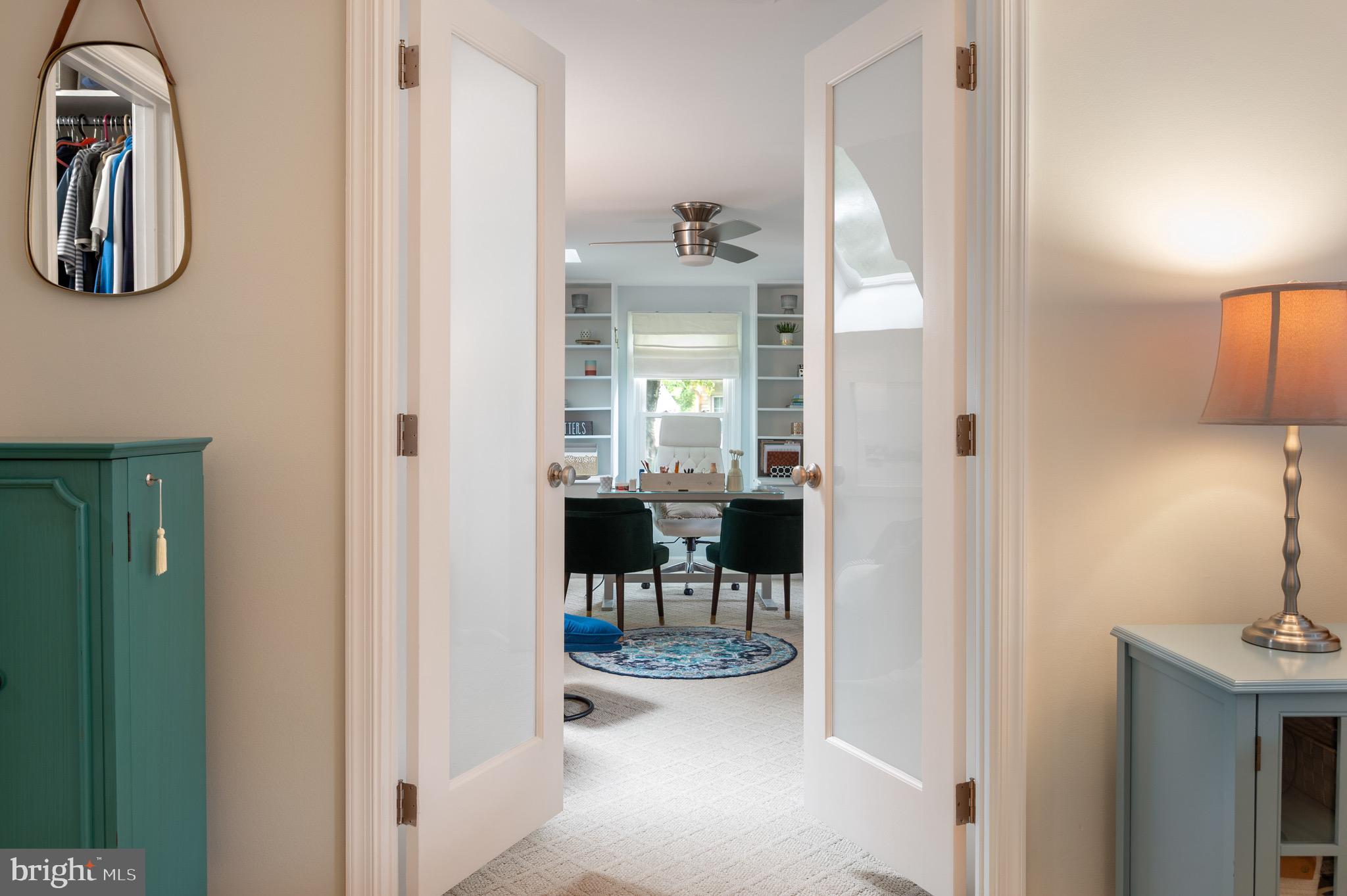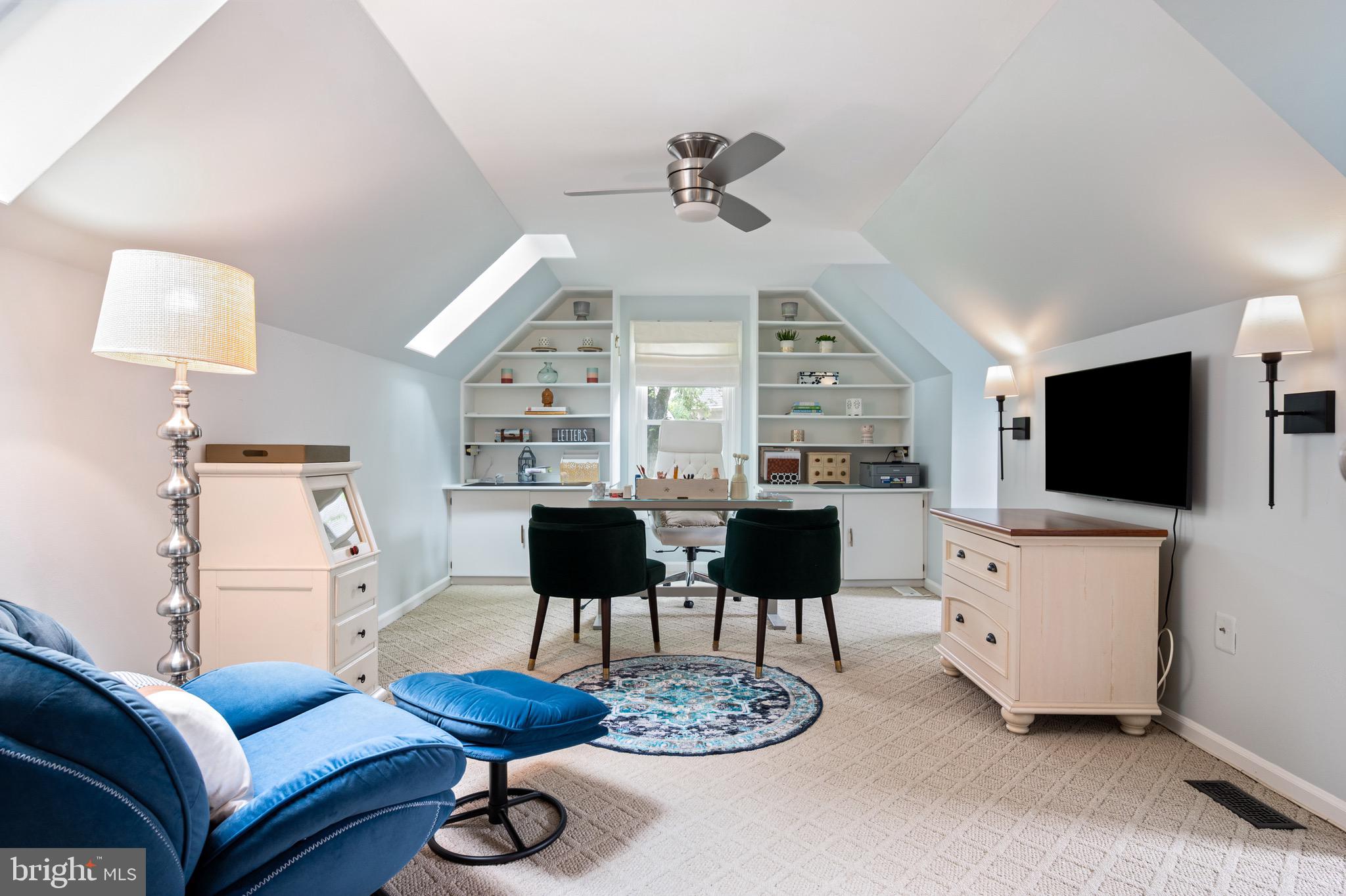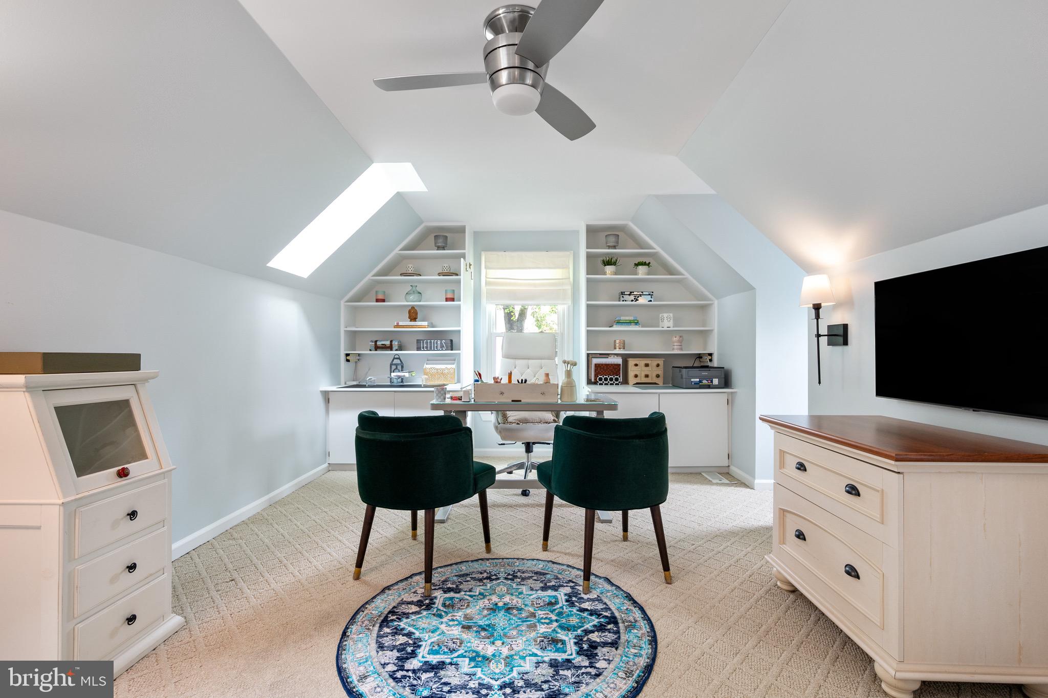 A finished laundry and mudroom with utility sink offers custom nooks for coats and shoe storage, adding to the home's thoughtful design. The upper level features four spacious bedrooms, including a luxurious primary suite with a walk-in closet upgraded with a custom shelving system. The fully renovated primary bathroom includes premium tile work, a frameless glass shower enclosure, and a double vanity with custom cabinetry. French doors from the primary suite lead to a spacious home office or sitting room, highlighted by custom bookshelves and skylights. A walk-through library connects to a staircase leading to the third level, which includes a fifth bedroom and a large recreation room boasting two skylights and a breathtaking lake view.