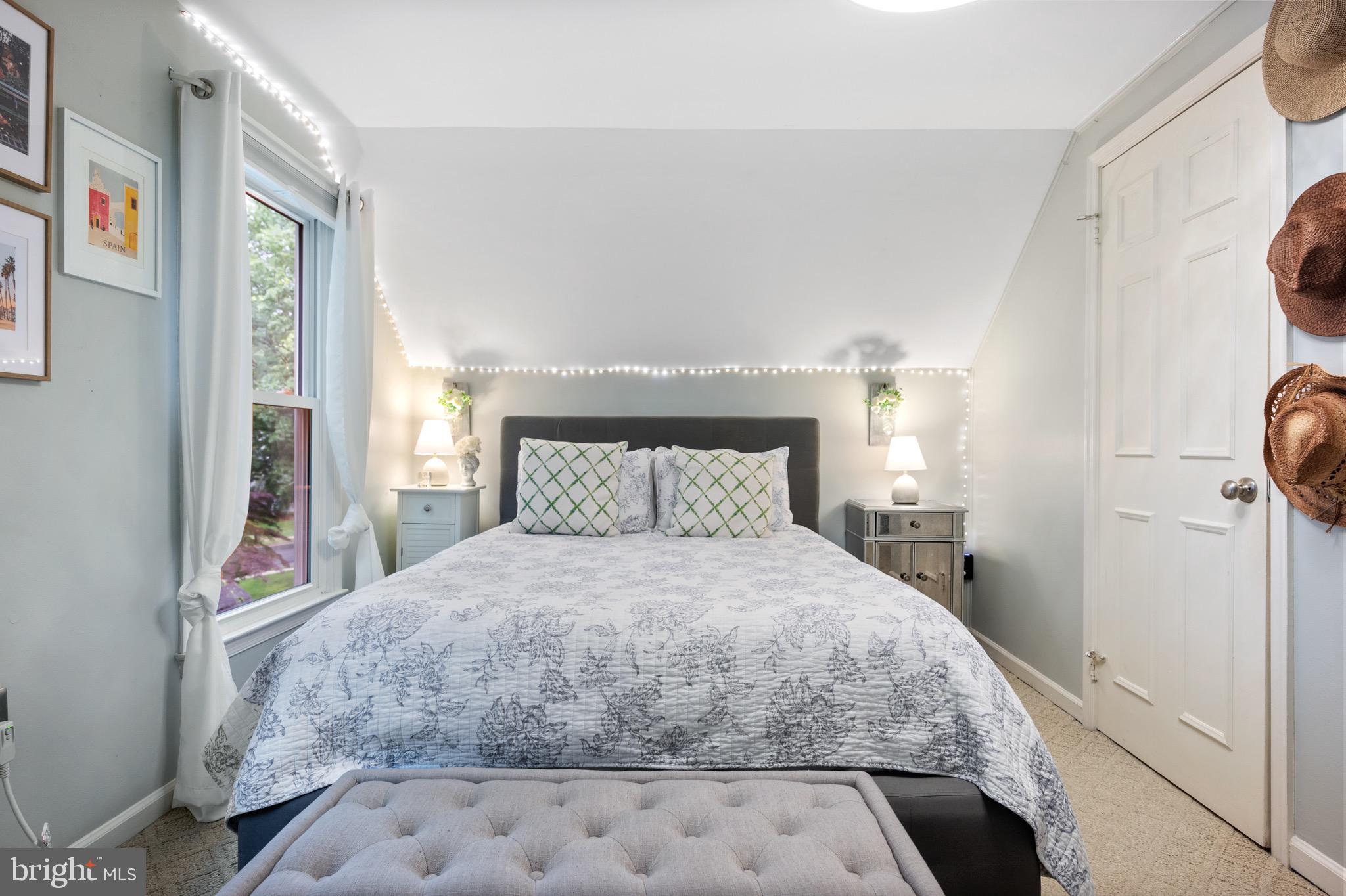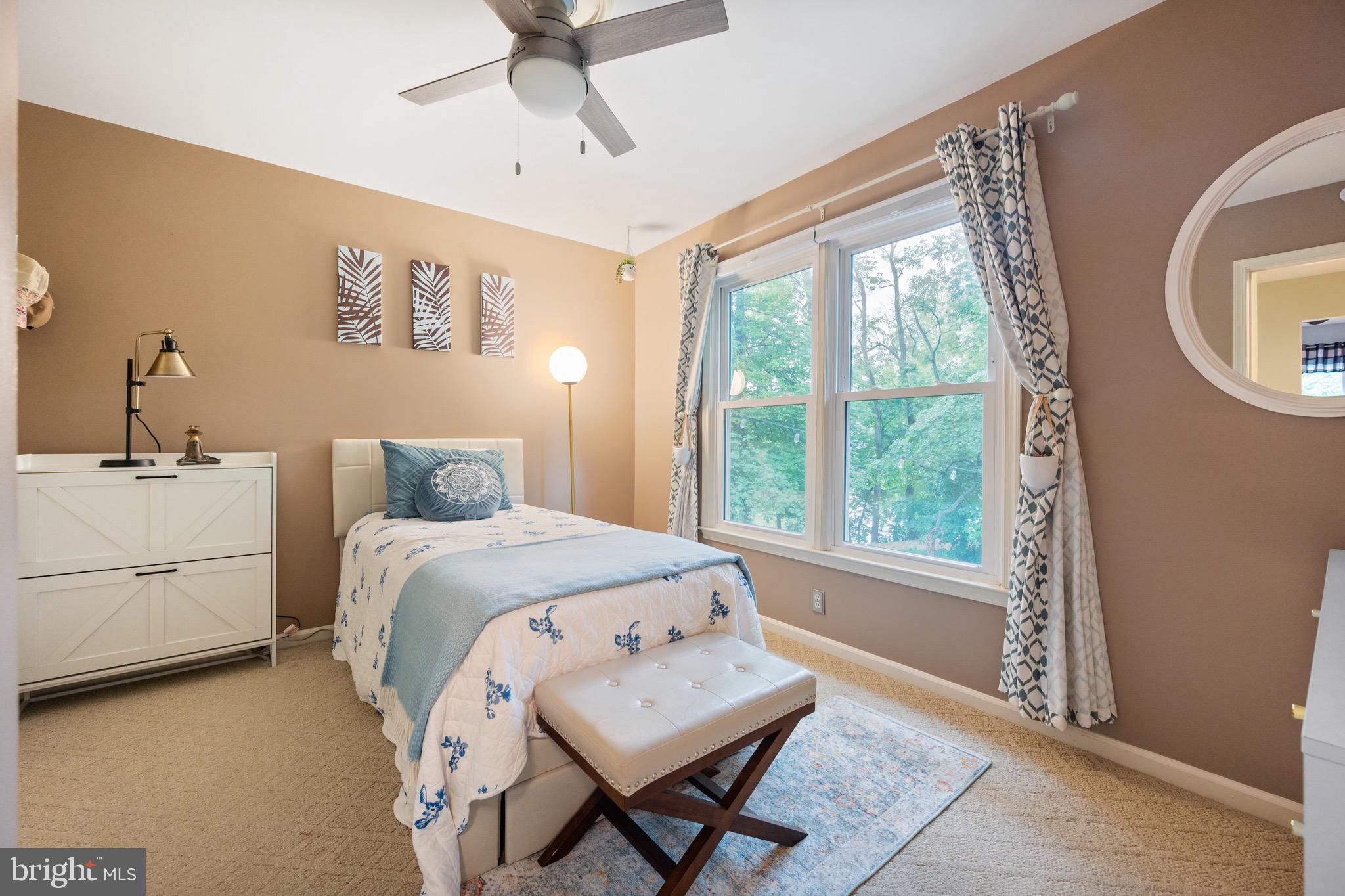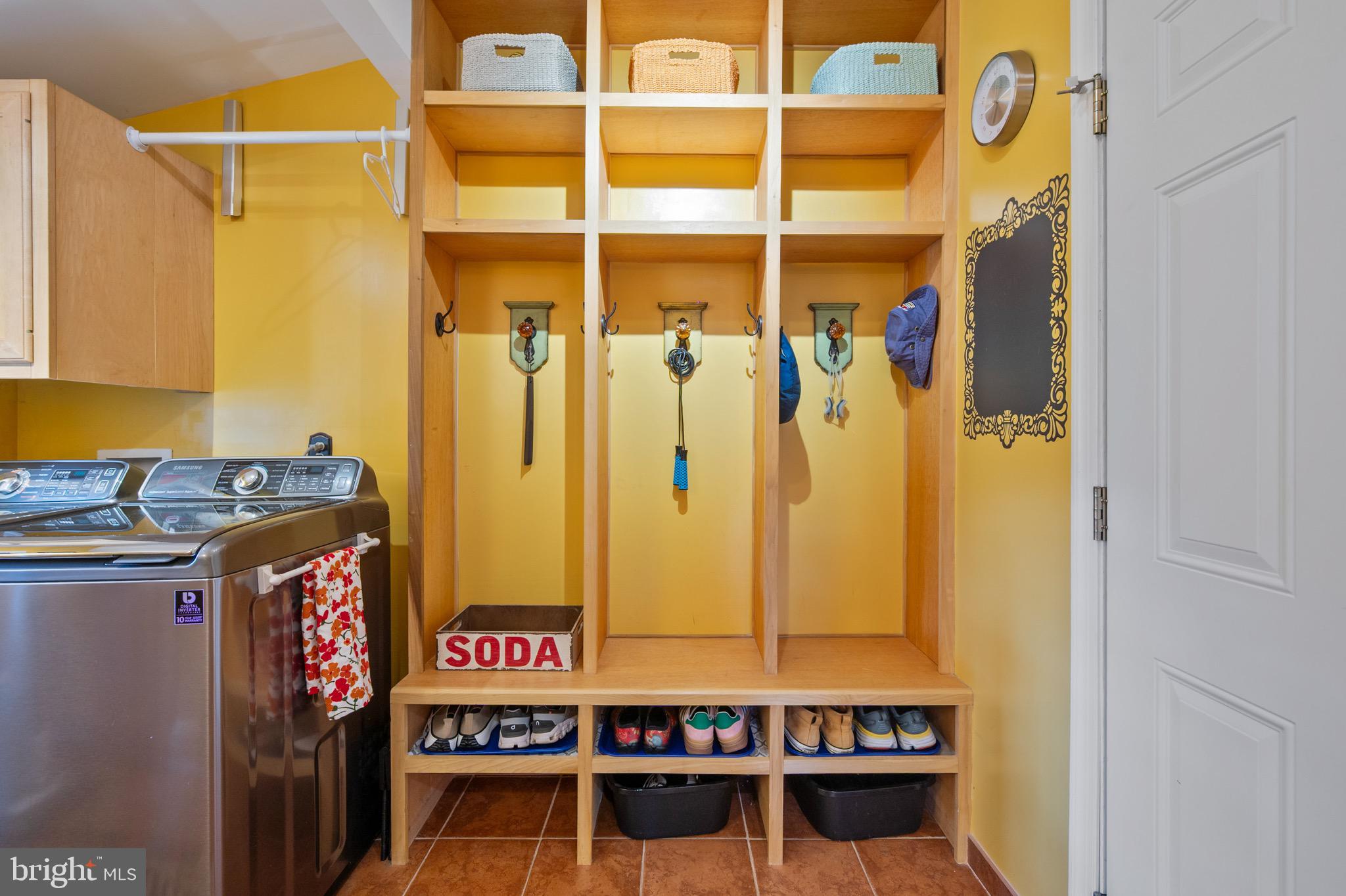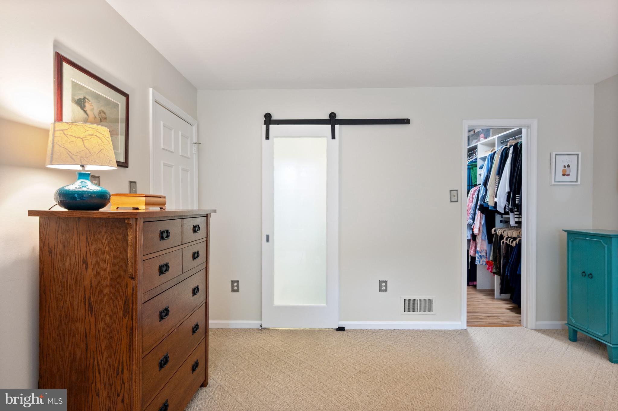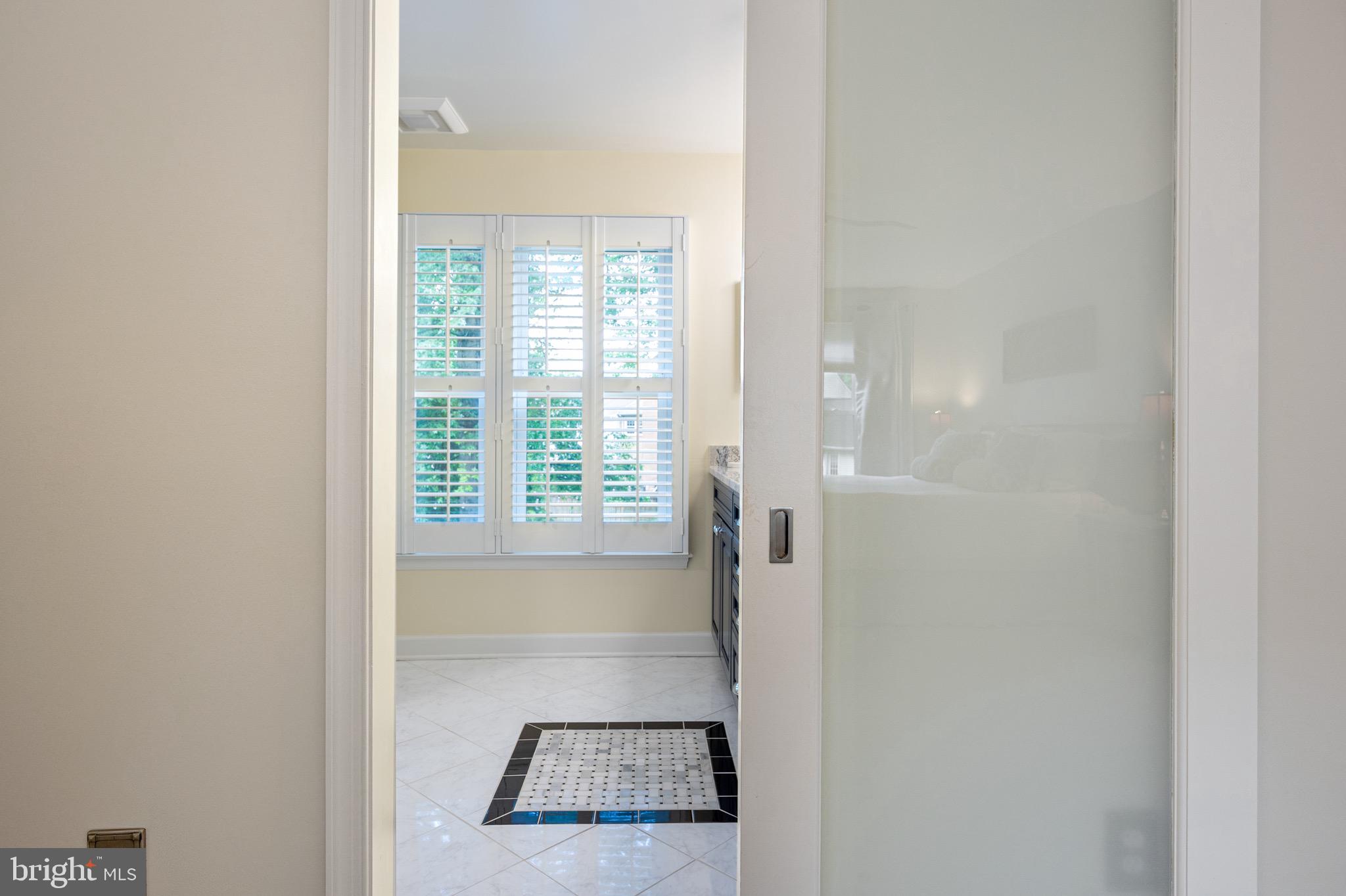 A finished laundry and mudroom with utility sink offers custom nooks for coats and shoe storage, adding to the home's thoughtful design. The upper level features four spacious bedrooms, including a luxurious primary suite with a walk-in closet upgraded with a custom shelving system. The fully renovated primary bathroom includes premium tile work, a frameless glass shower enclosure, and a double vanity with custom cabinetry. French doors from the primary suite lead to a spacious home office or sitting room, highlighted by custom bookshelves and skylights. A walk-through library connects to a staircase leading to the third level, which includes a fifth bedroom and a large recreation room boasting two skylights and a breathtaking lake view.