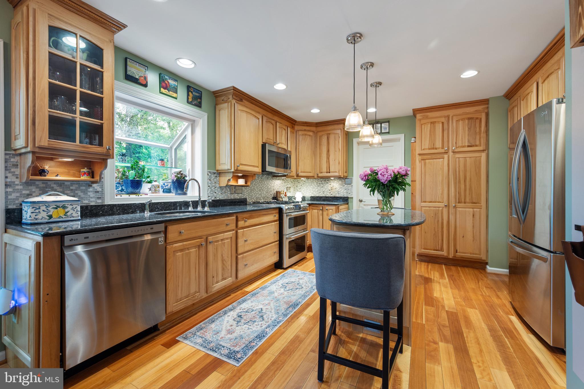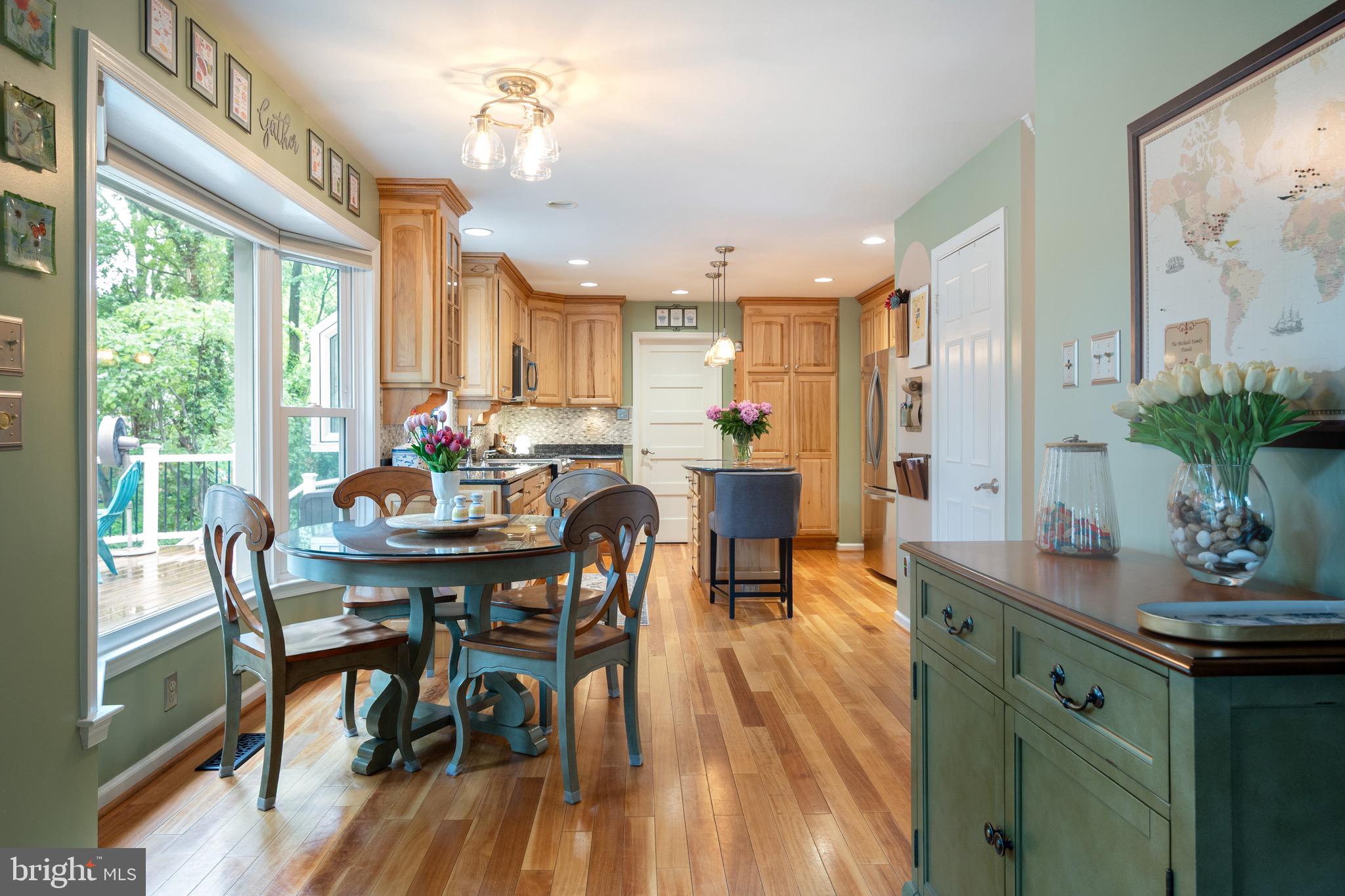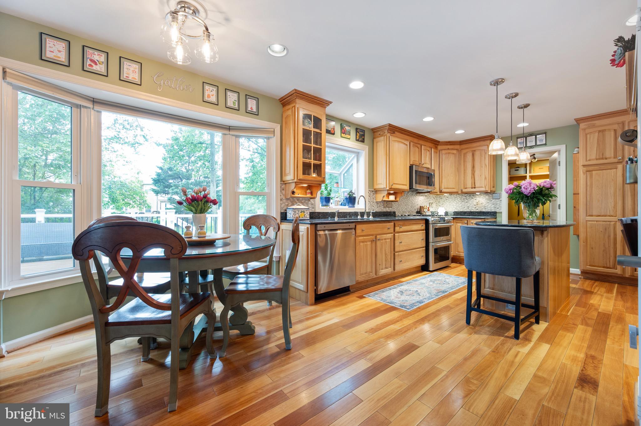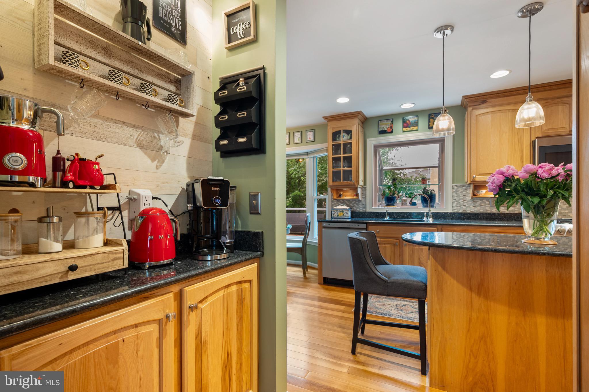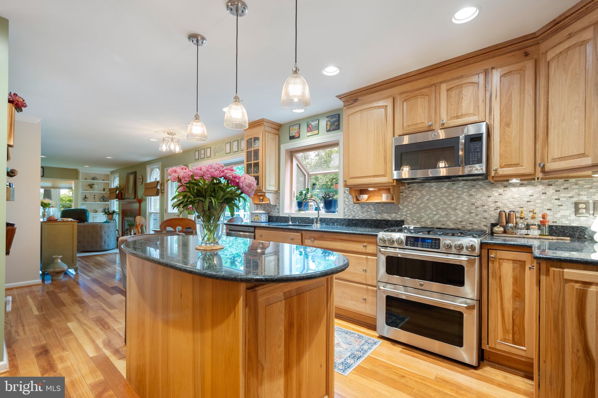 Family room flows seamlessly into the eat-in kitchen area. The kitchen is beautifully remodeled with granite countertops, stainless steel appliances, island, and a built-in coffee station. A bay window enhances the kitchen's functionality and charm.