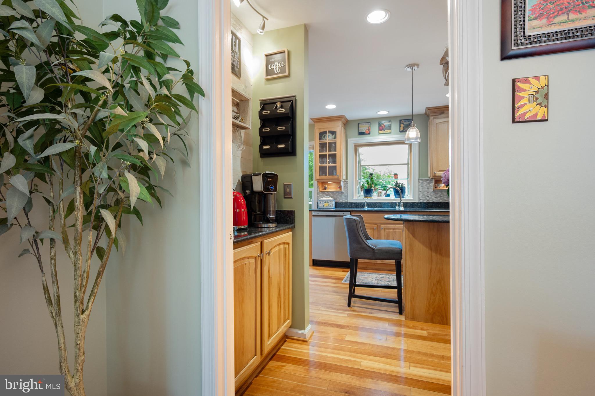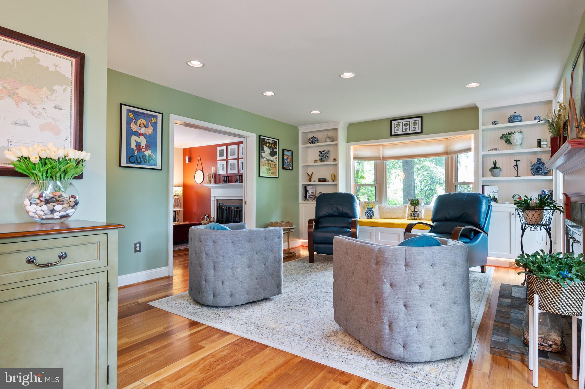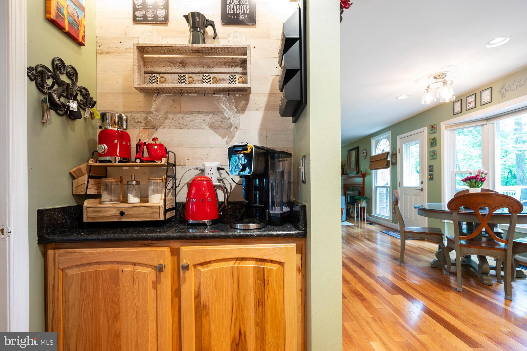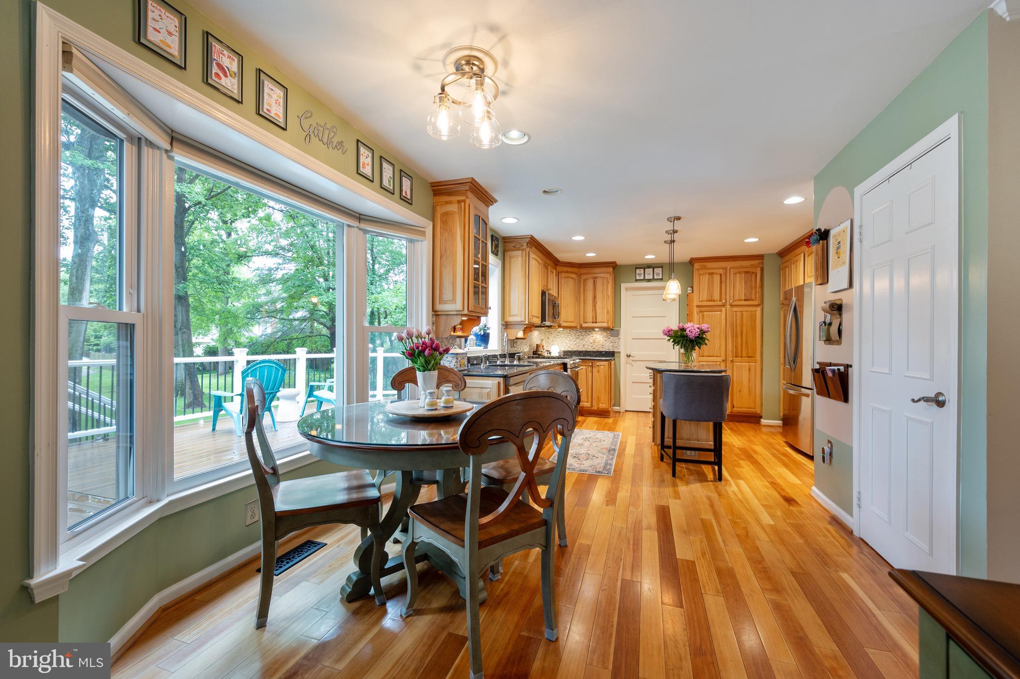 Family room flows seamlessly into the eat-in kitchen area. The kitchen is beautifully remodeled with granite countertops, stainless steel appliances, island, and a built-in coffee station. A bay window enhances the kitchen's functionality and charm.