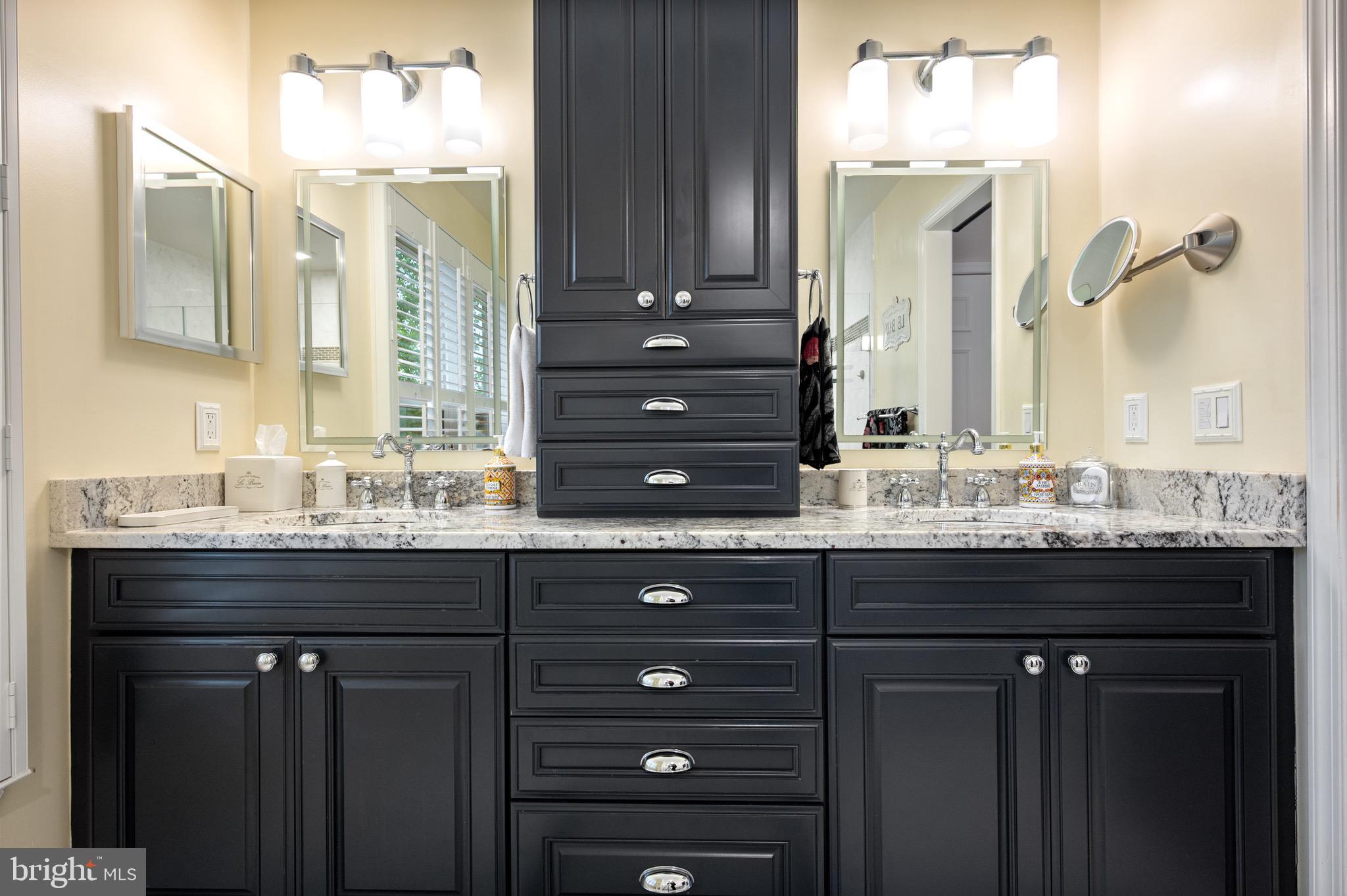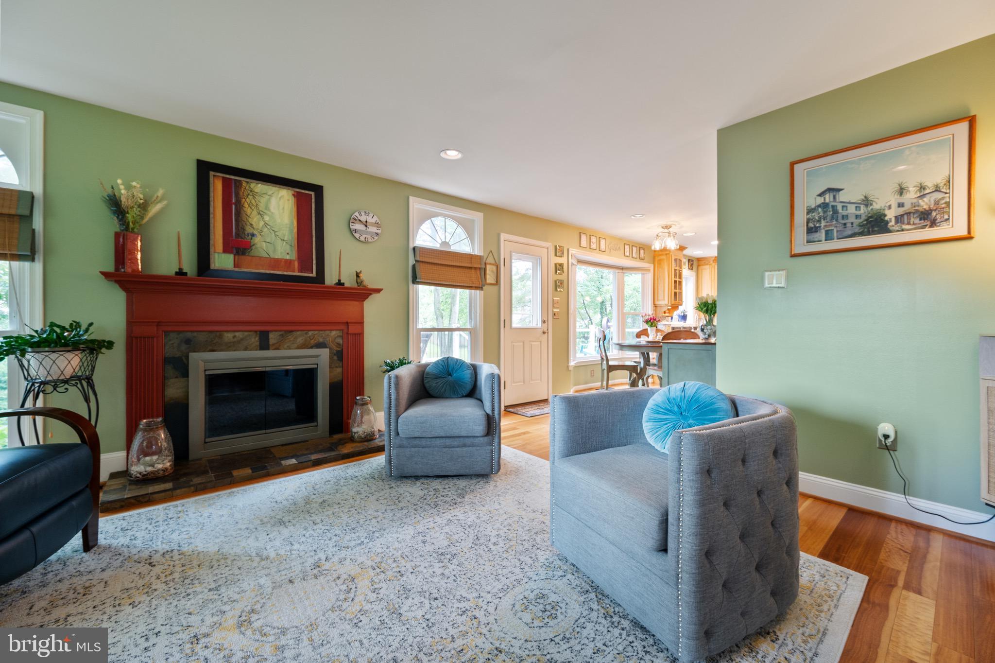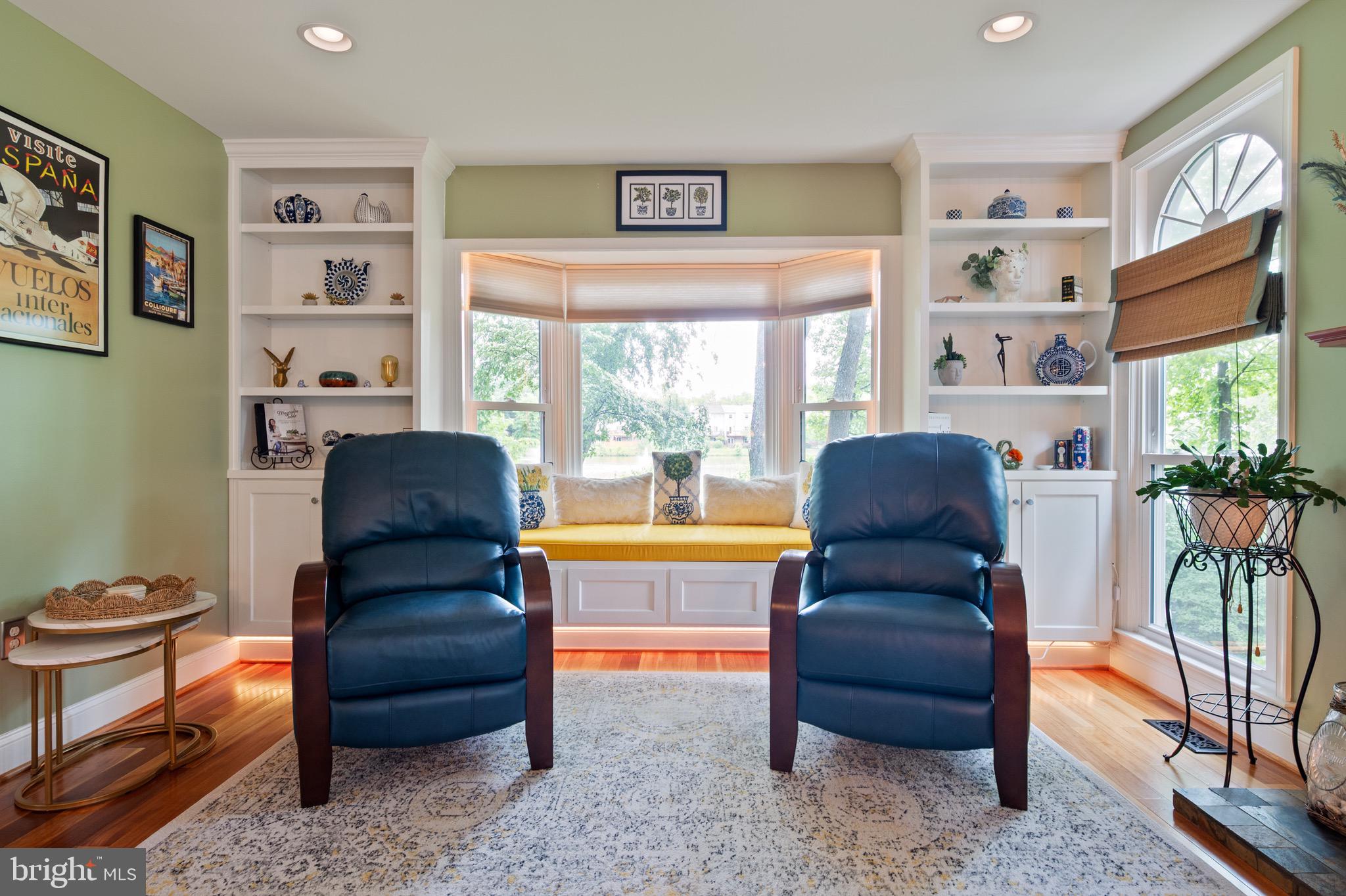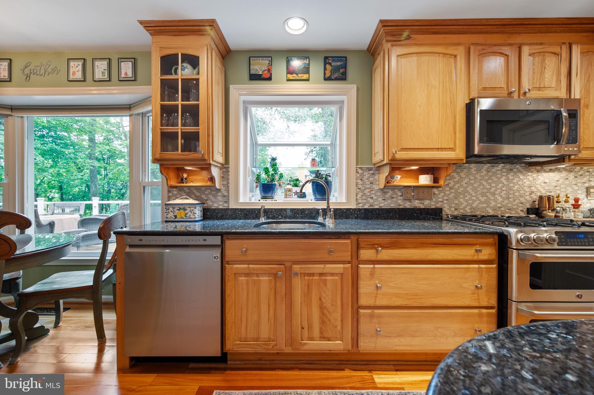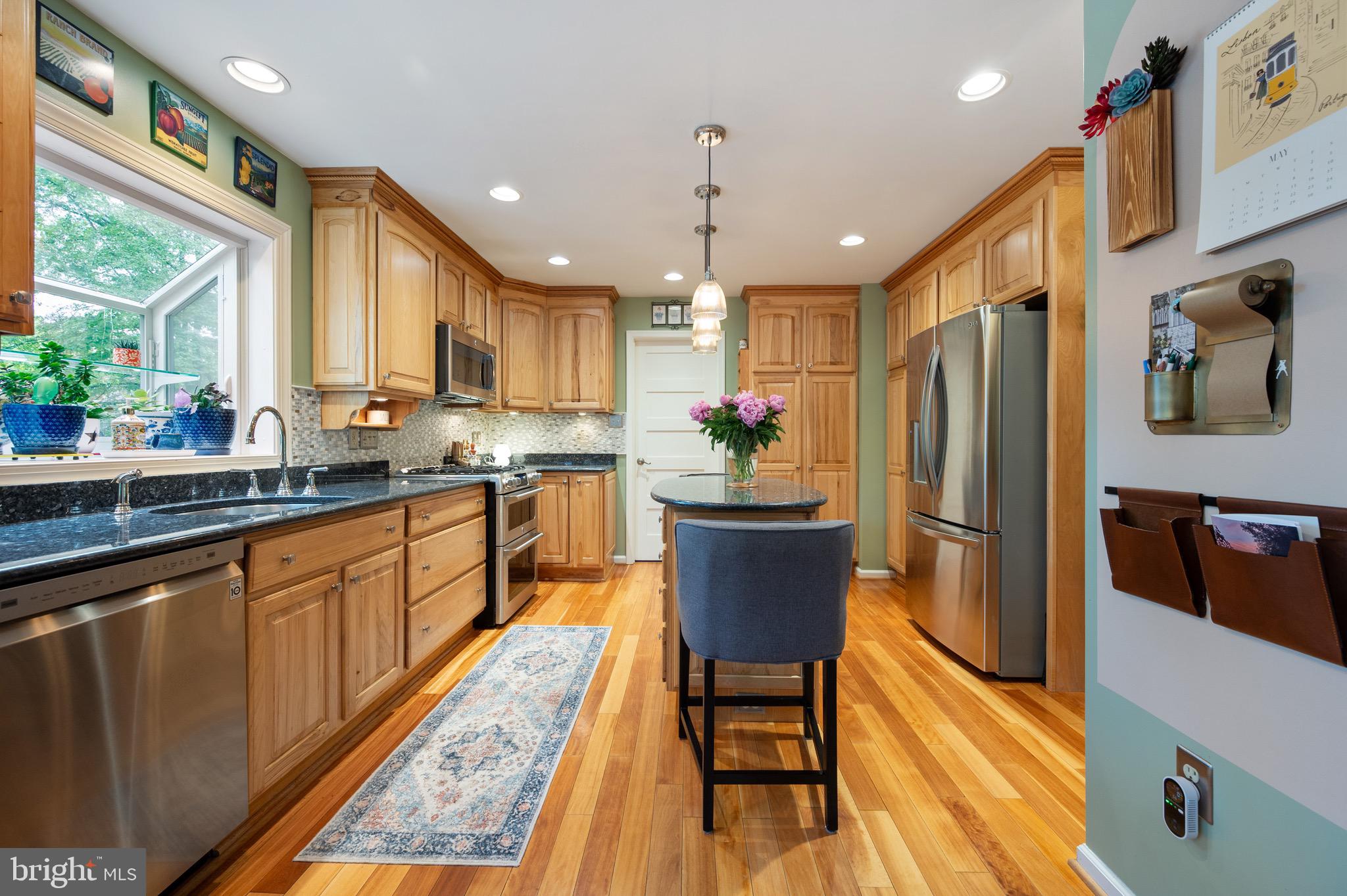 Family room flows seamlessly into the eat-in kitchen area. The kitchen is beautifully remodeled with granite countertops, stainless steel appliances, island, and a built-in coffee station. A bay window enhances the kitchen's functionality and charm.
