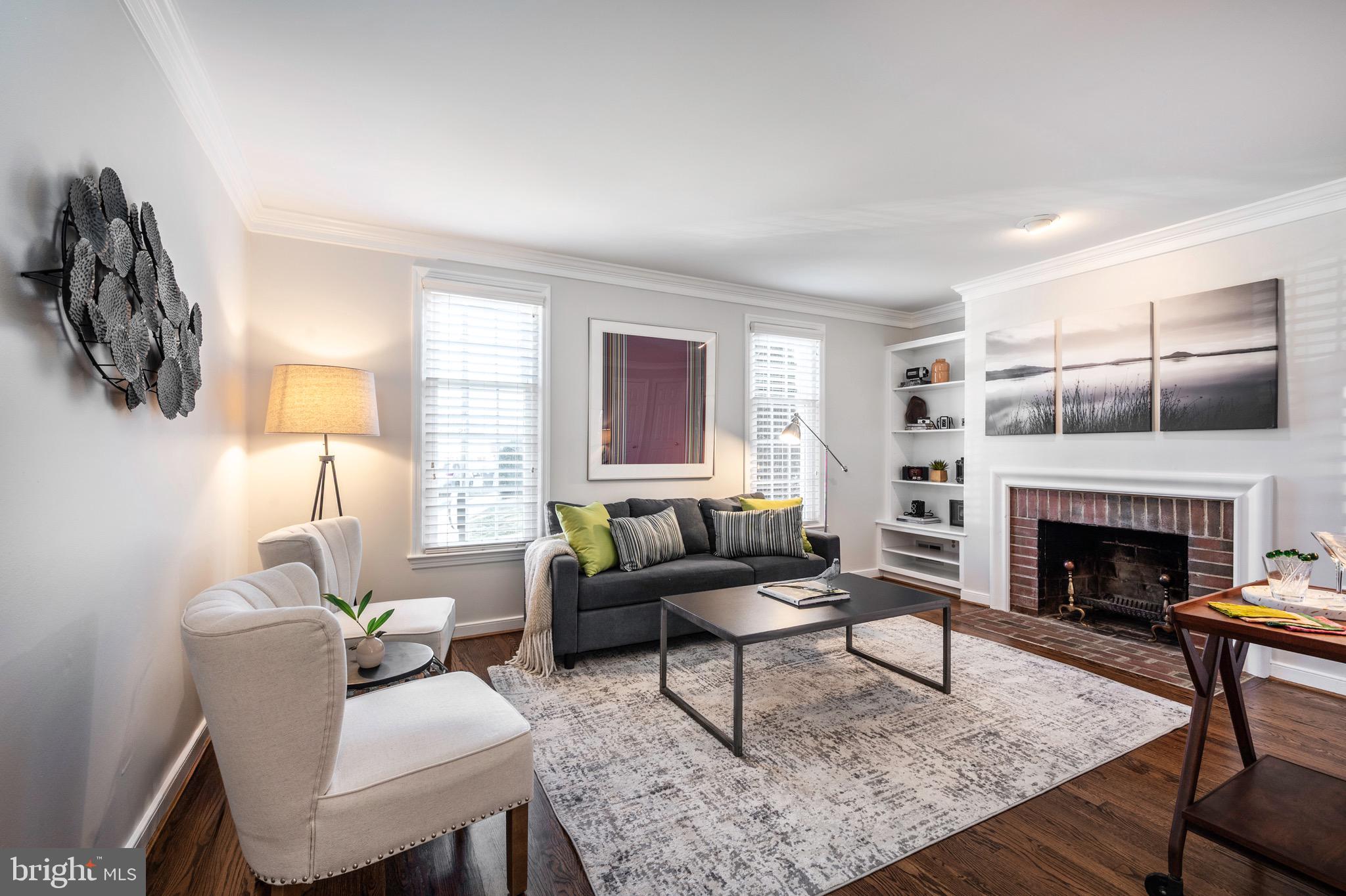 Step inside and be greeted by the charming and bright living room bathed in natural light, and beautiful crown molding. Cozy up during the colder months beside the wood-burning fireplace, which features handsome built-in shelving for all your favorite books and personal memorabilia.